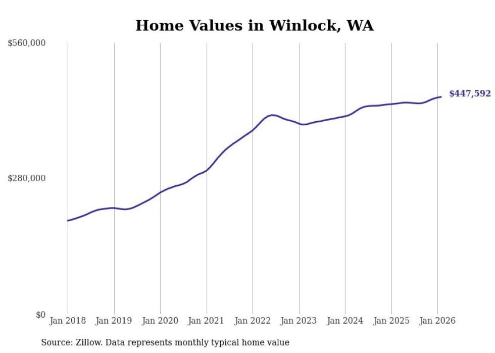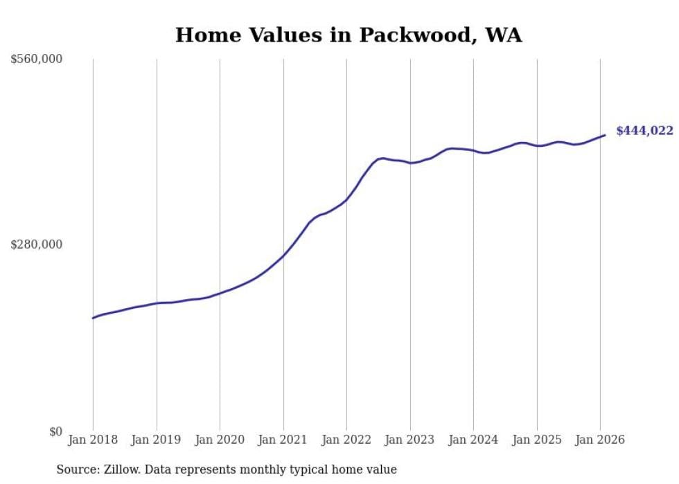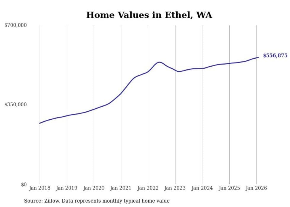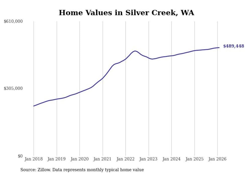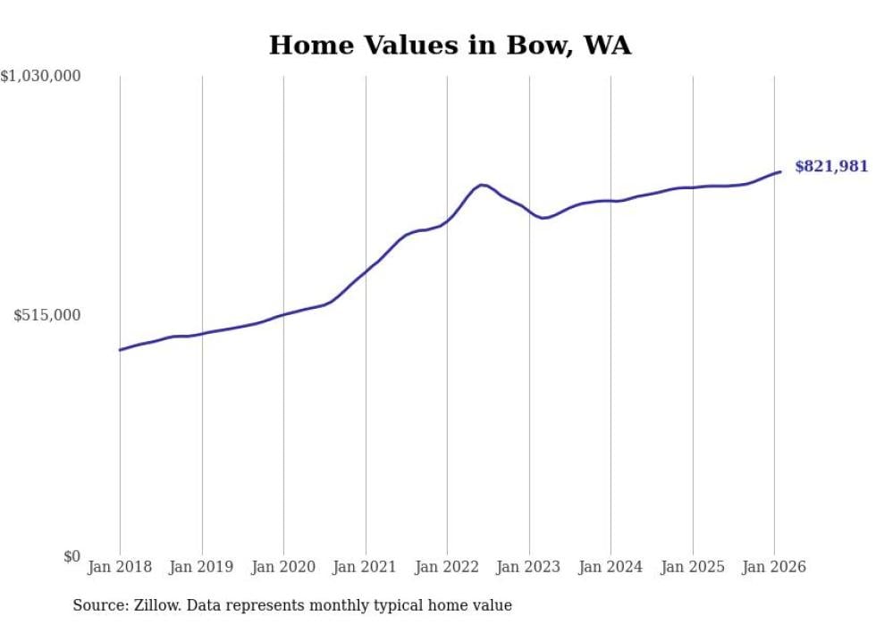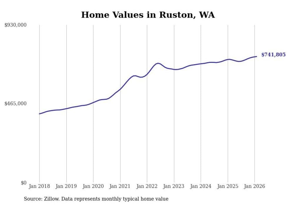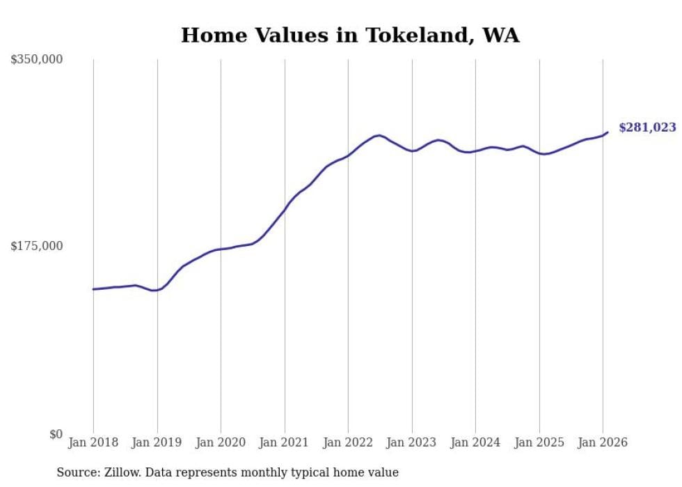 Stacker compiled a list of cities with the fastest-growing home prices in Washington using data from Zillow. Cities are ranked by the dollar change in the Zillow Home Values Index for all homes from the 12 months ending February 2026. The charts in this story were created automatically using Matplotlib. Data was available for 50 cities and towns in Washington.