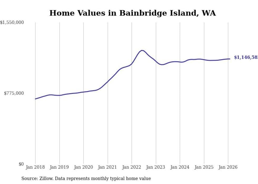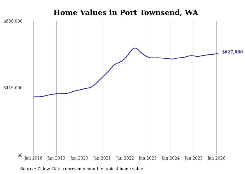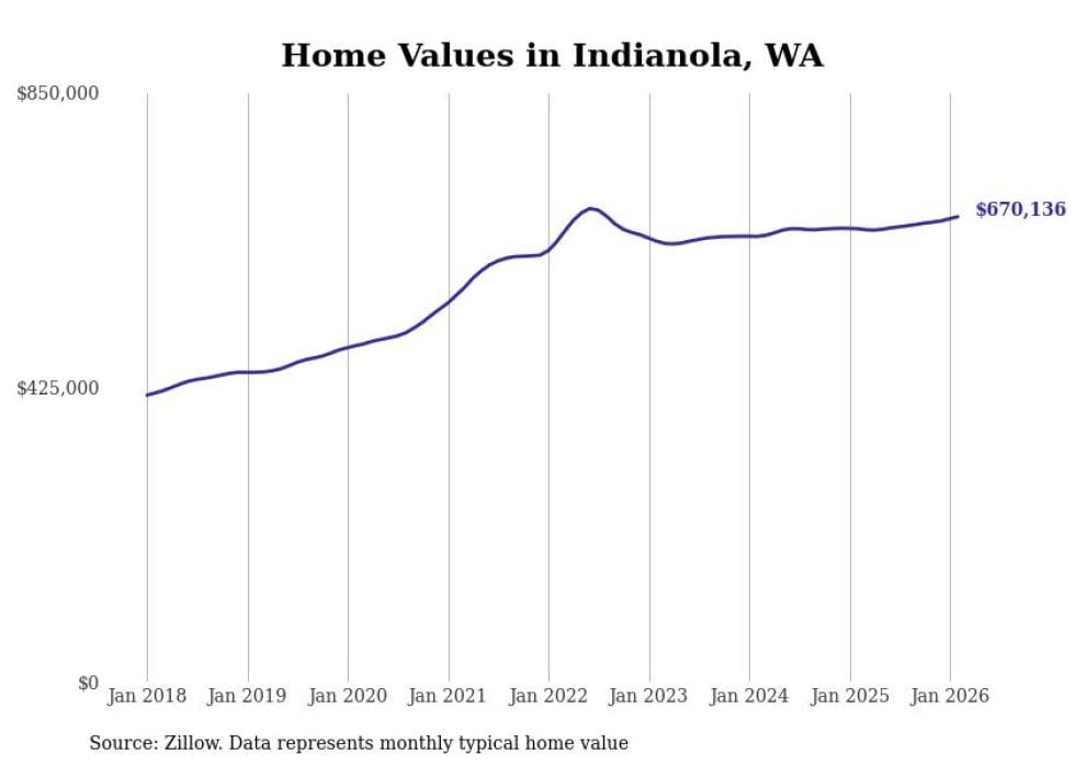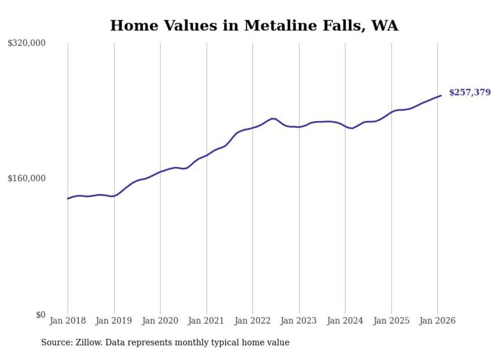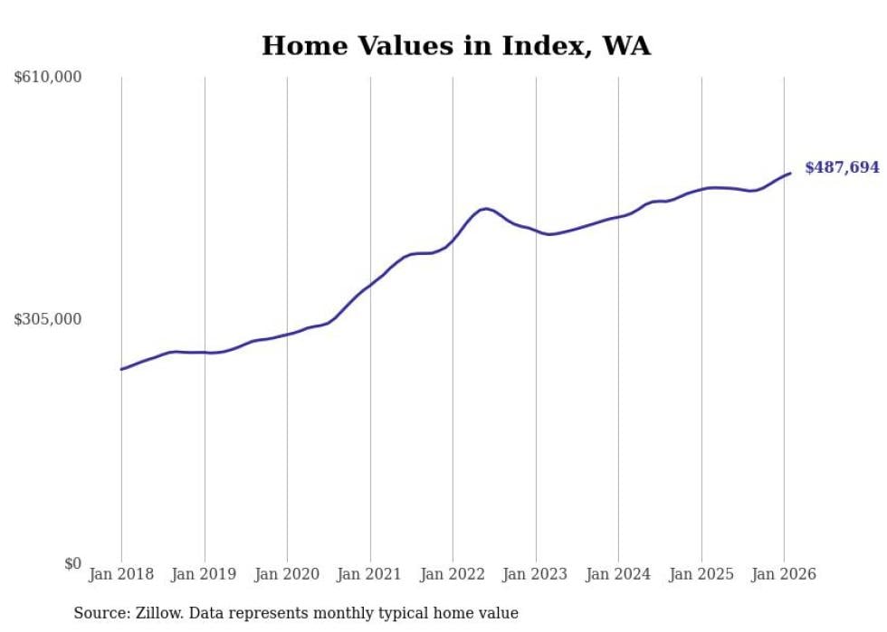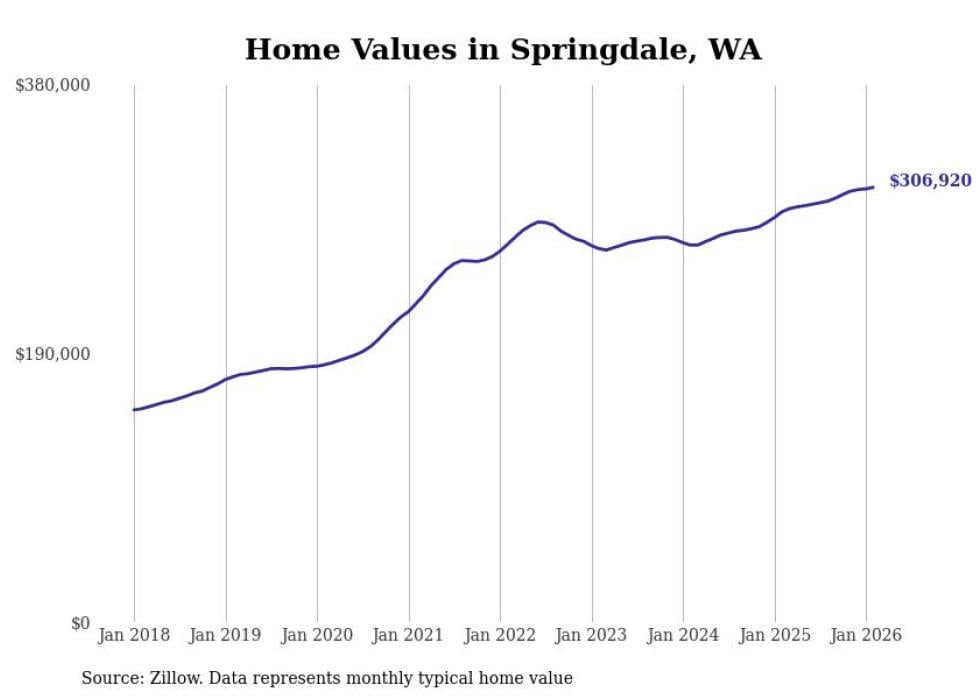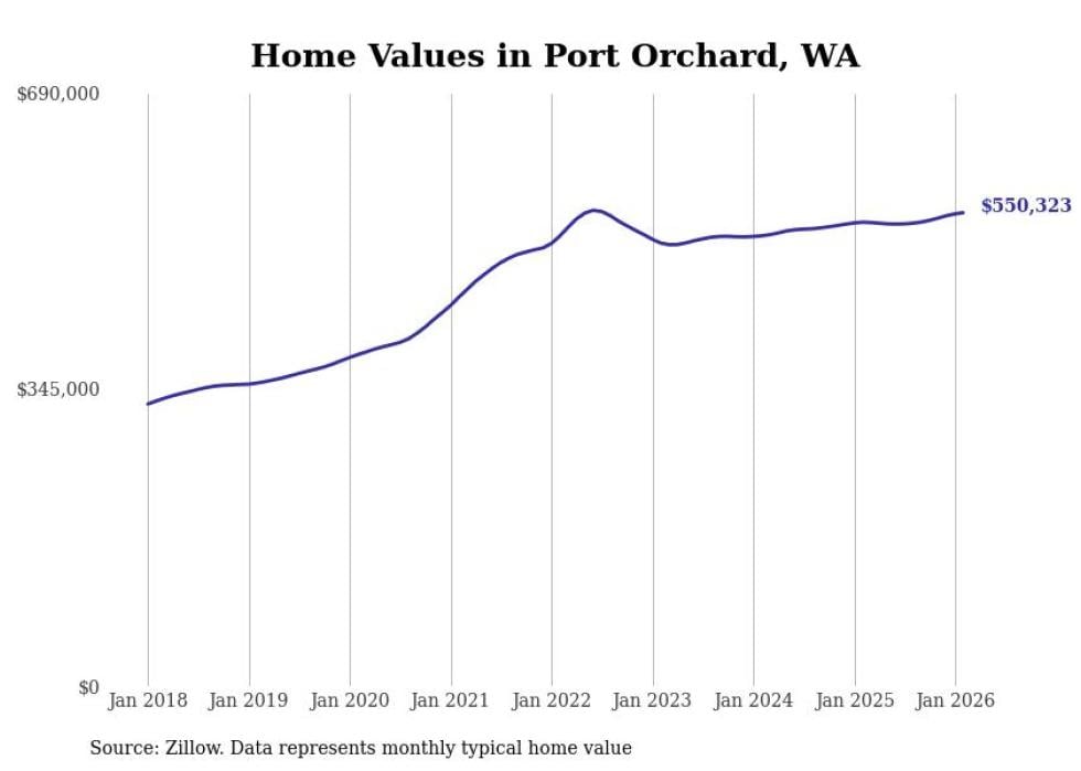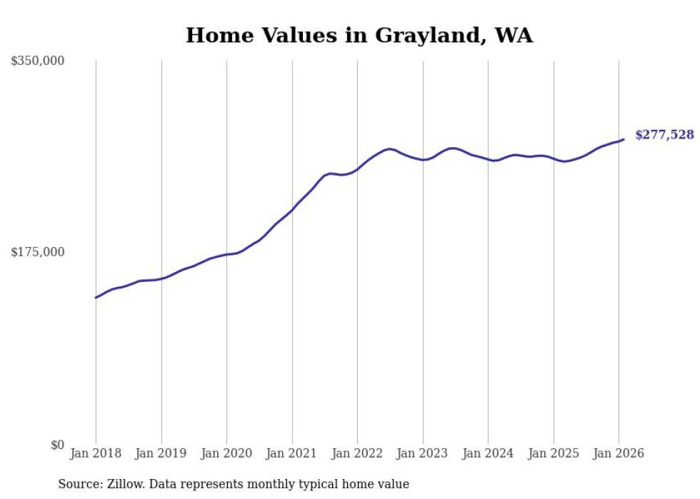 Stacker compiled a list of cities with the fastest-growing home prices in Washington using data from Zillow. Cities are ranked by the dollar change in the Zillow Home Values Index for all homes from the 12 months ending February 2026. The charts in this story were created automatically using Matplotlib. Data was available for 50 cities and towns in Washington.