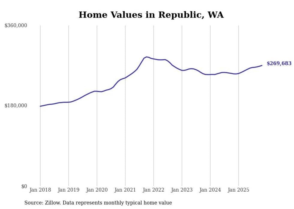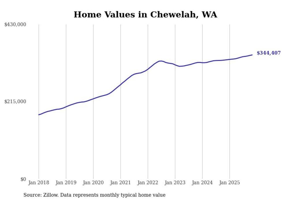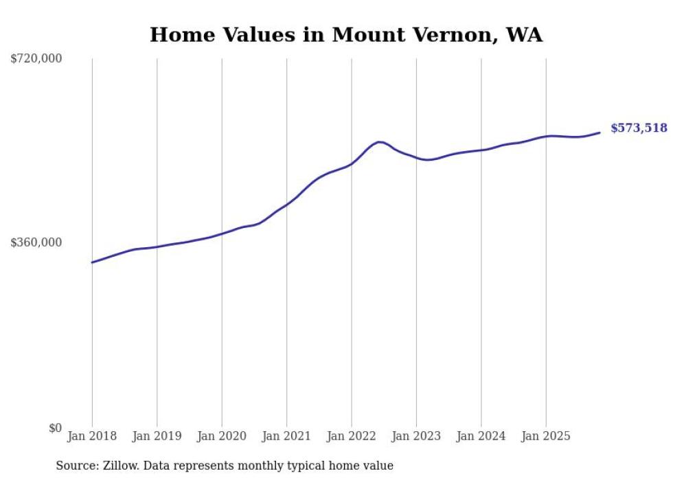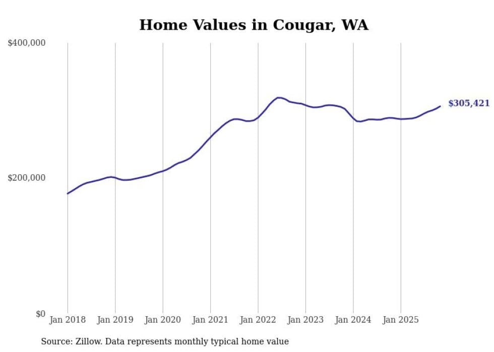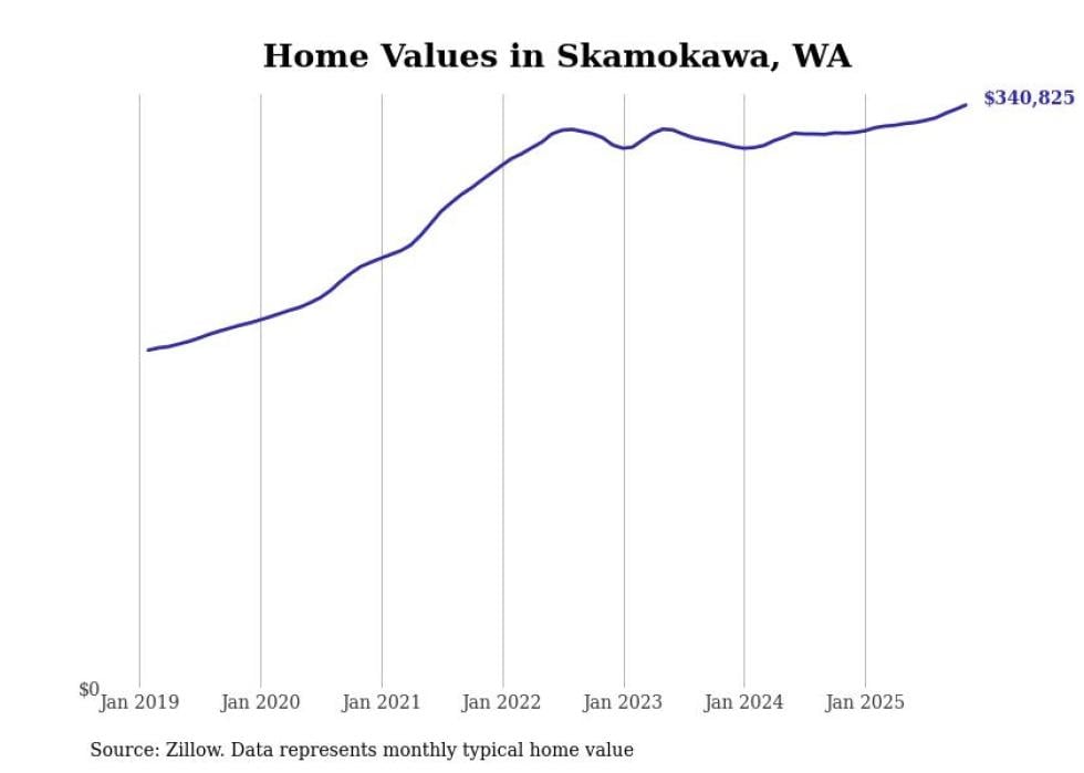 Stacker compiled a list of cities with the fastest-growing home prices in Washington using data from Zillow. Cities are ranked by the dollar change in the Zillow Home Values Index for all homes from the 12 months ending November 2025. The charts in this story were created automatically using Matplotlib. Data was available for 50 cities and towns in Washington.