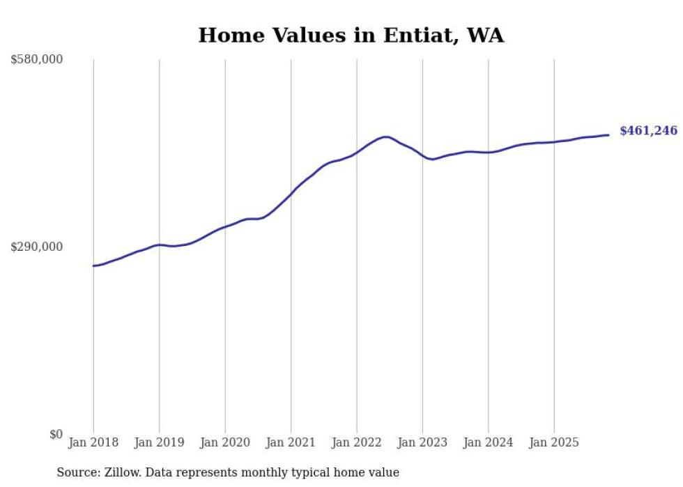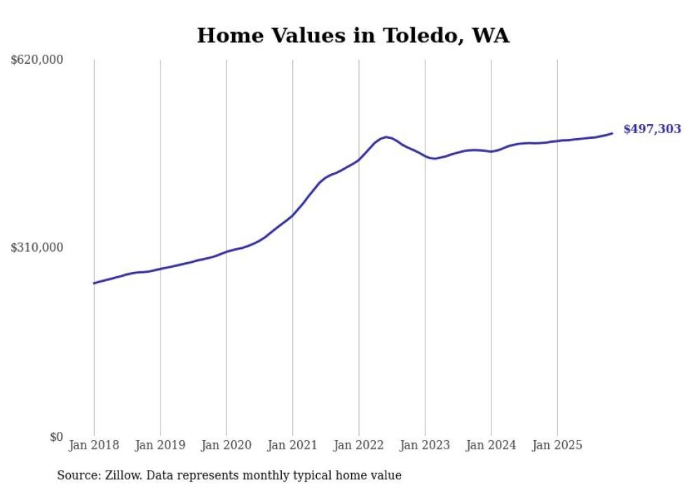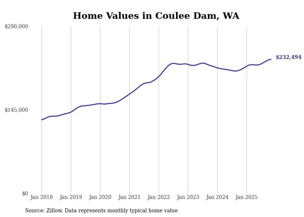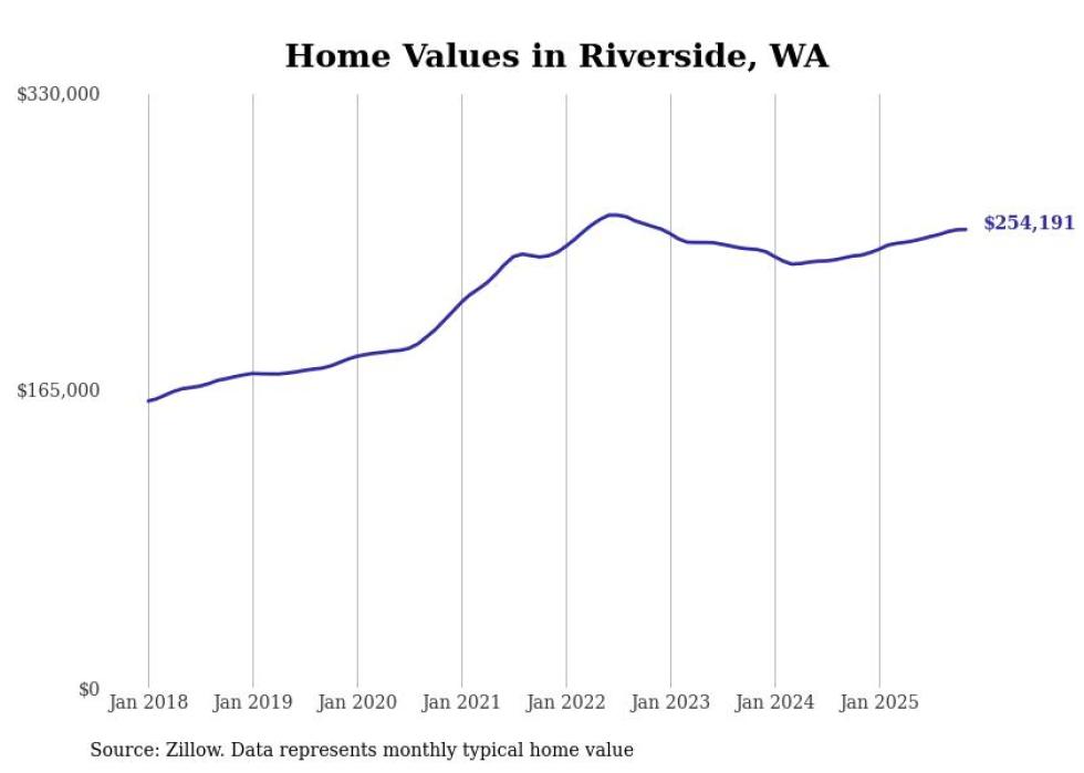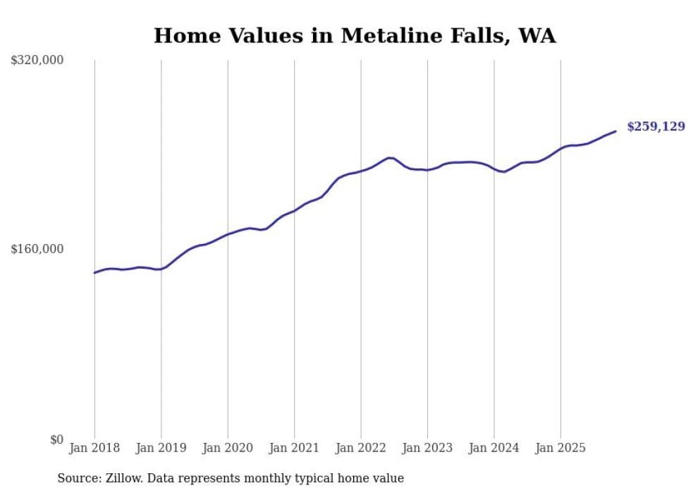 Stacker compiled a list of cities with the fastest-growing home prices in Washington using data from Zillow. Cities are ranked by the dollar change in the Zillow Home Values Index for all homes from the 12 months ending November 2025. The charts in this story were created automatically using Matplotlib. Data was available for 50 cities and towns in Washington.