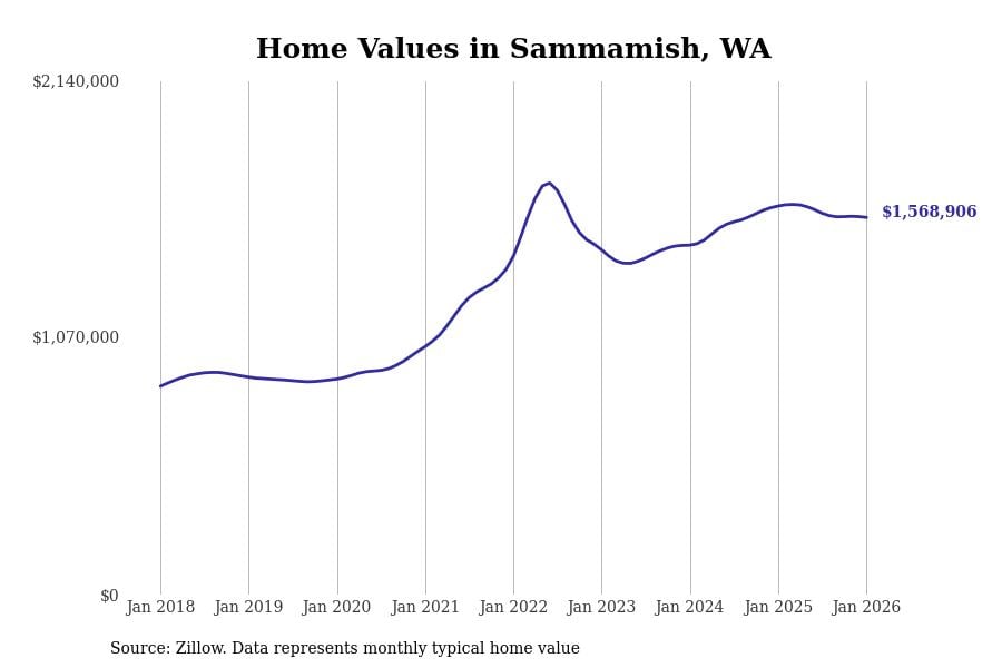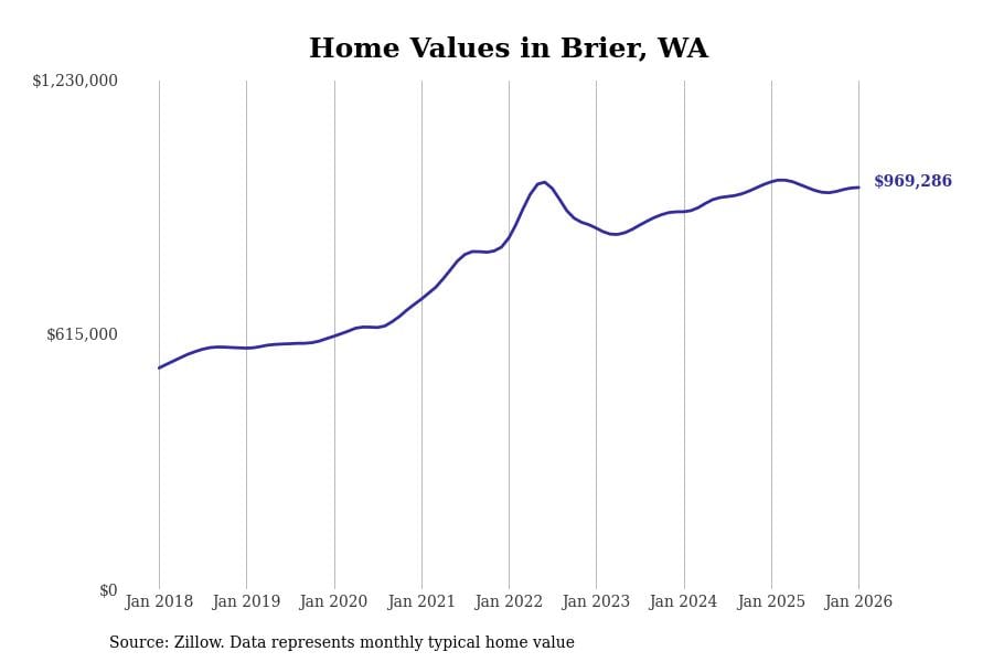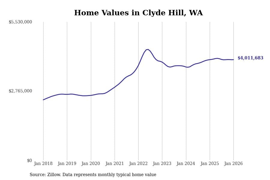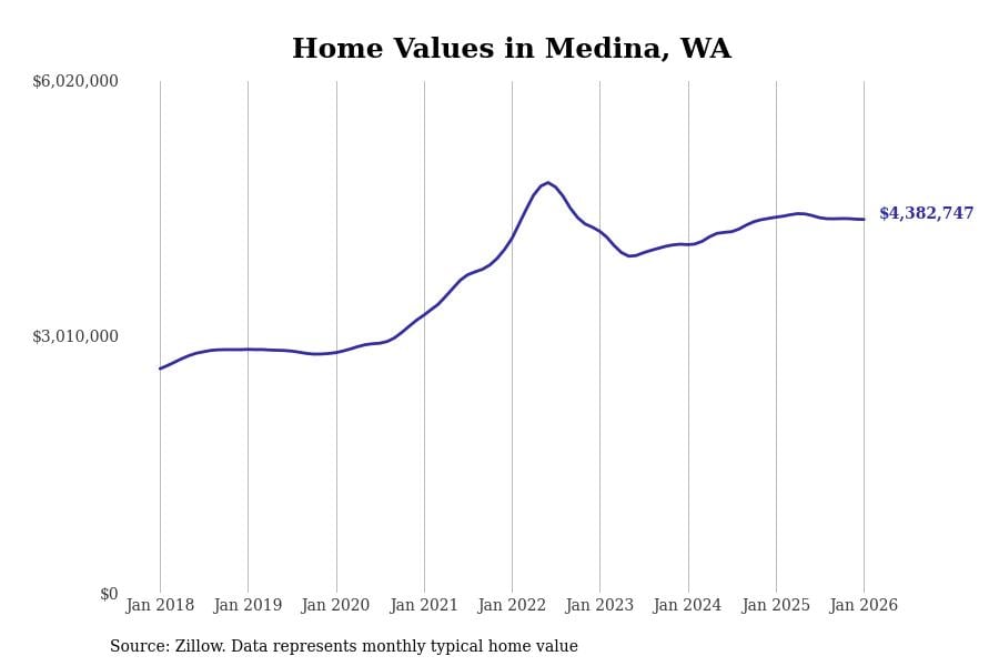 Stacker compiled a list of cities with the most expensive homes in Washington using data from Zillow. Cities are ranked by the Zillow Home Values Index for all homes as of January 2026. The charts in this story were created automatically using Matplotlib.