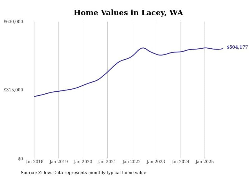 Stacker compiled a list of cities with the most expensive homes in the Olympia-Lacey-Tumwater, WA metro area using data from Zillow. Charts show the monthly typical home value since January 2018.