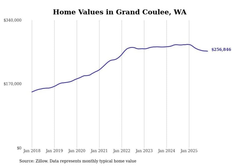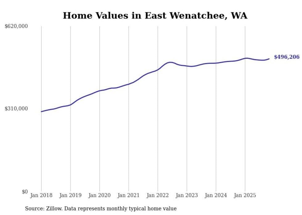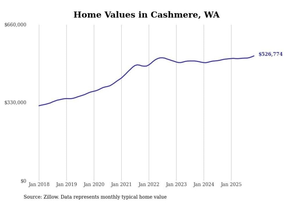 Stacker compiled a list of cities with the most expensive homes in the Wenatchee metro area using data from Zillow. Charts show the monthly typical home value since January 2018. All 20 cities and towns with data available were included in the list.