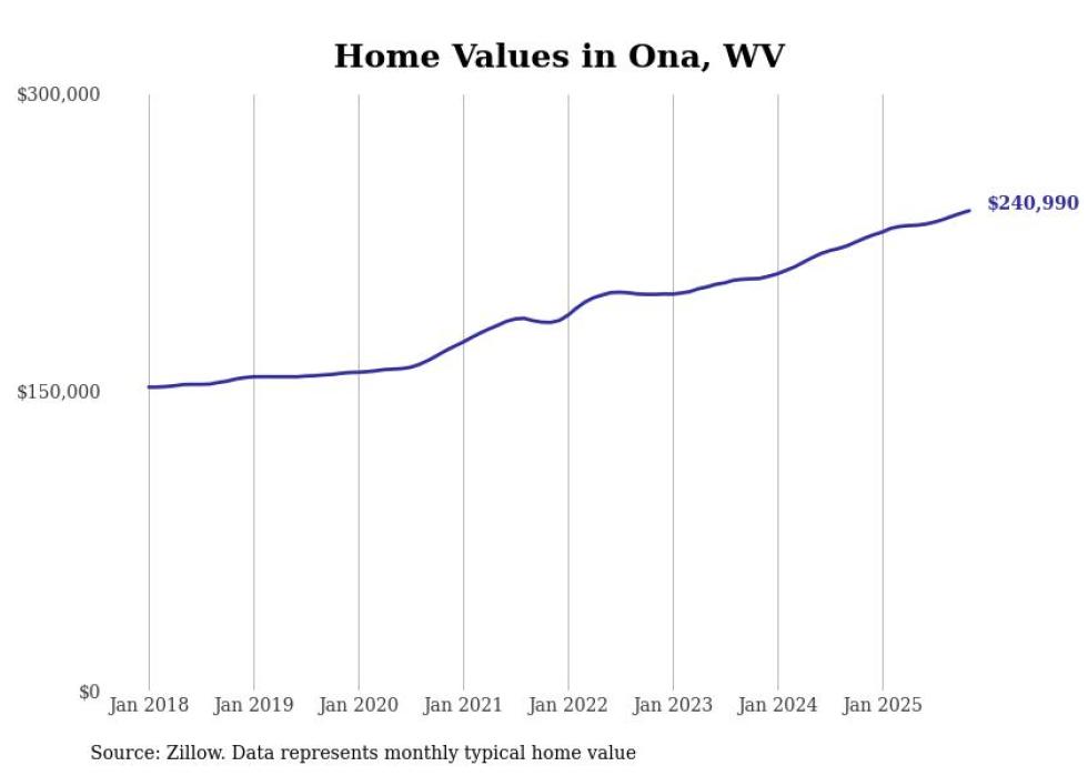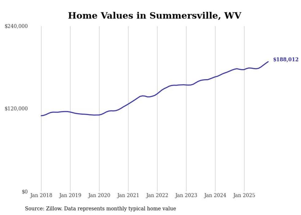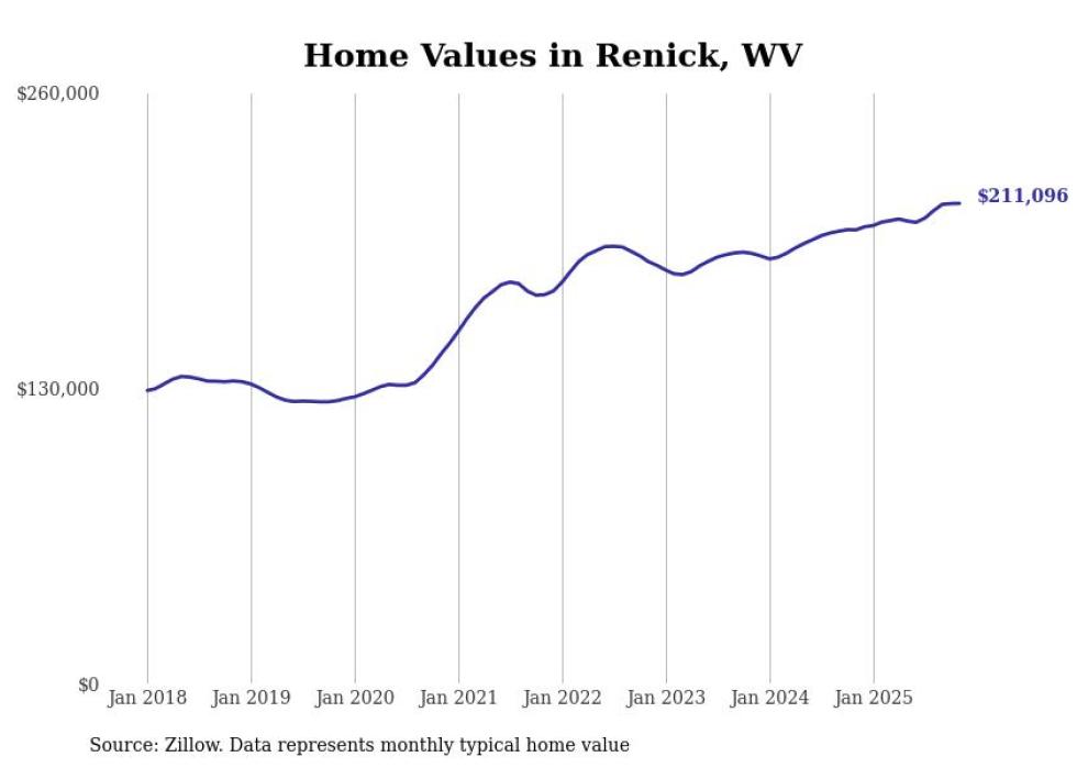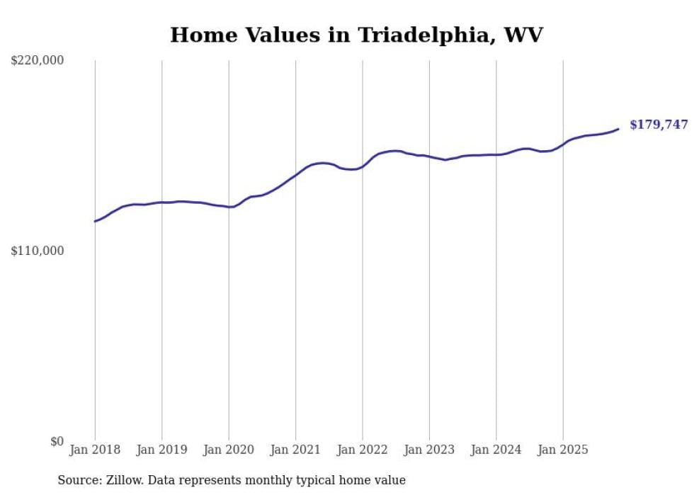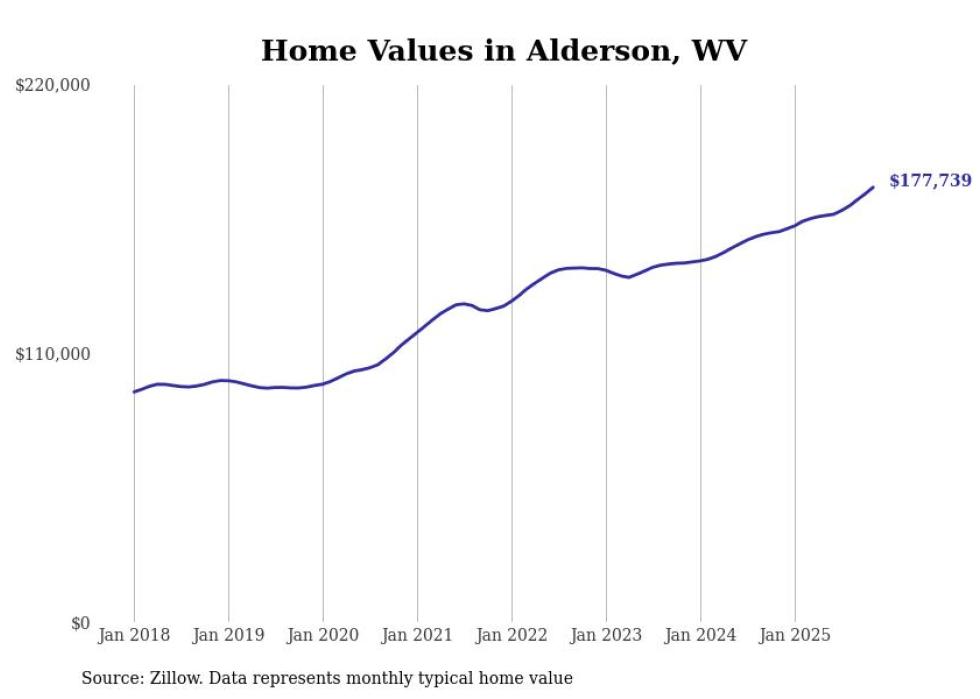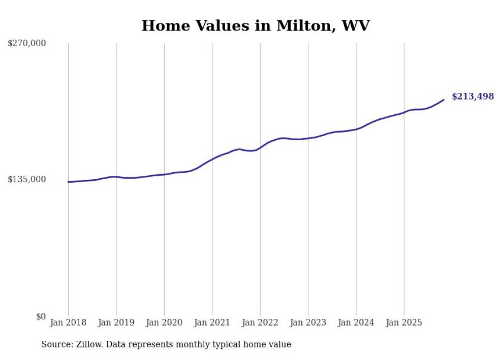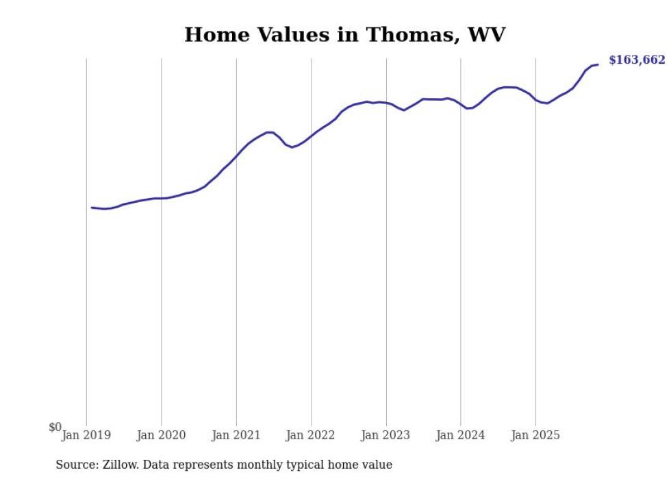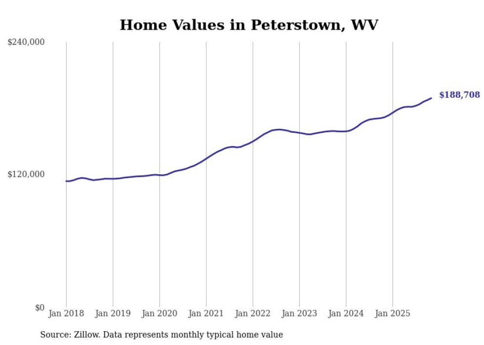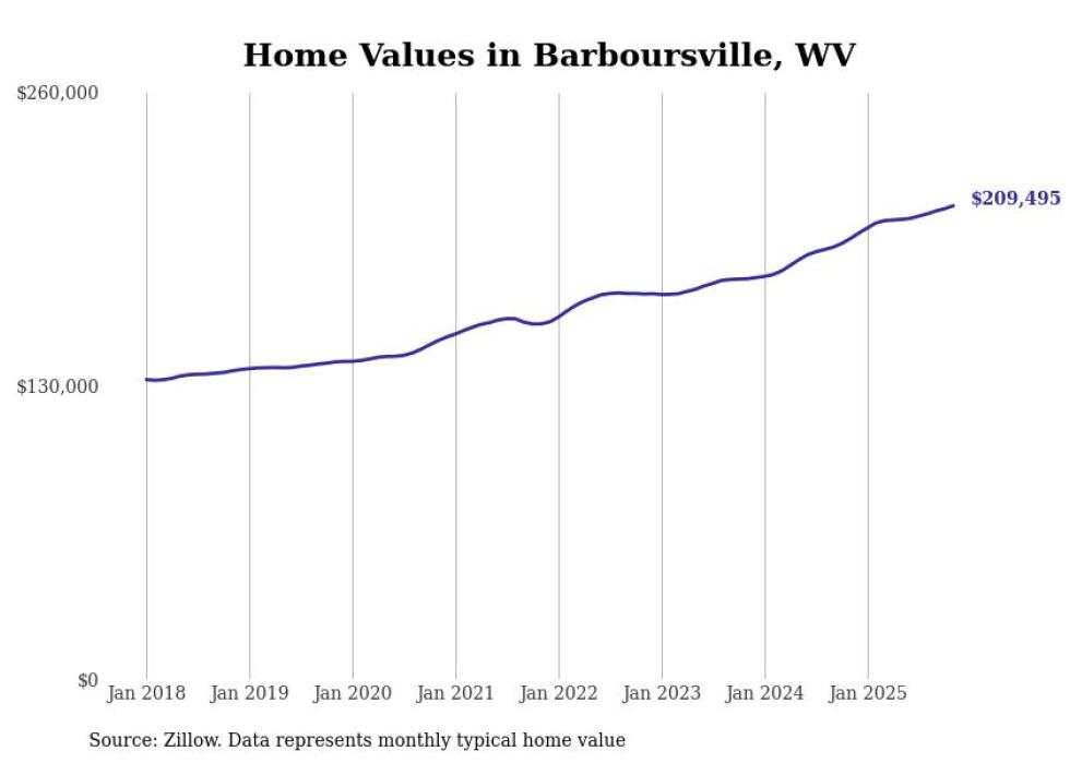 Stacker compiled a list of cities with the fastest-growing home prices in West Virginia using data from Zillow. Cities are ranked by the dollar change in the Zillow Home Values Index for all homes from the 12 months ending November 2025. The charts in this story were created automatically using Matplotlib. Data was available for 50 cities and towns in West Virginia.