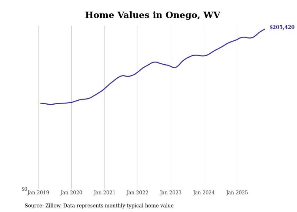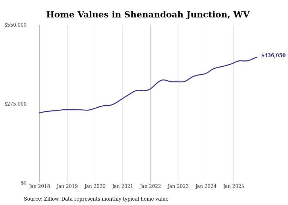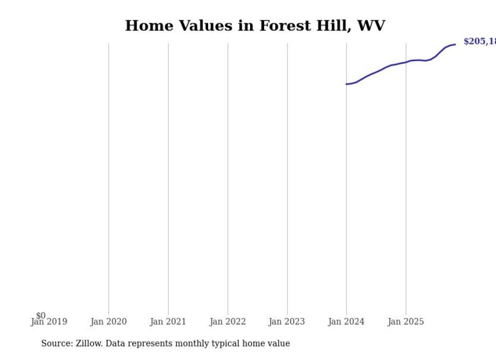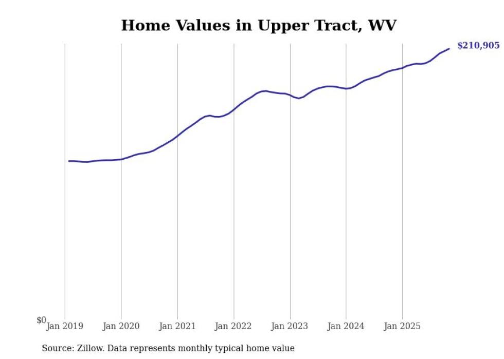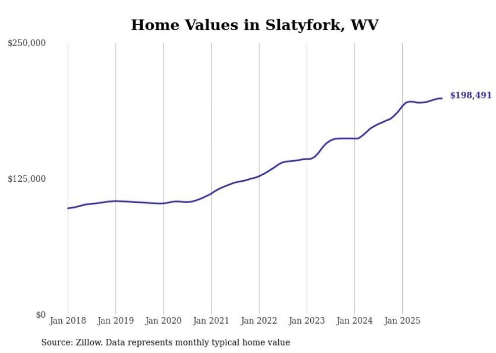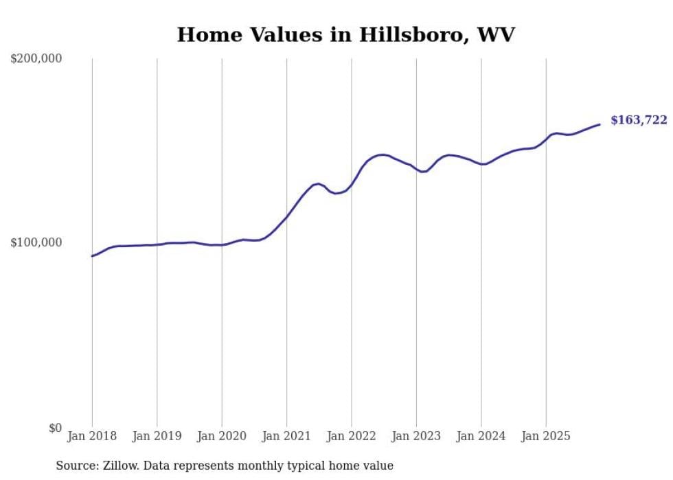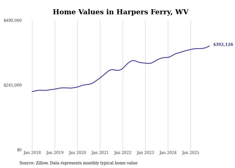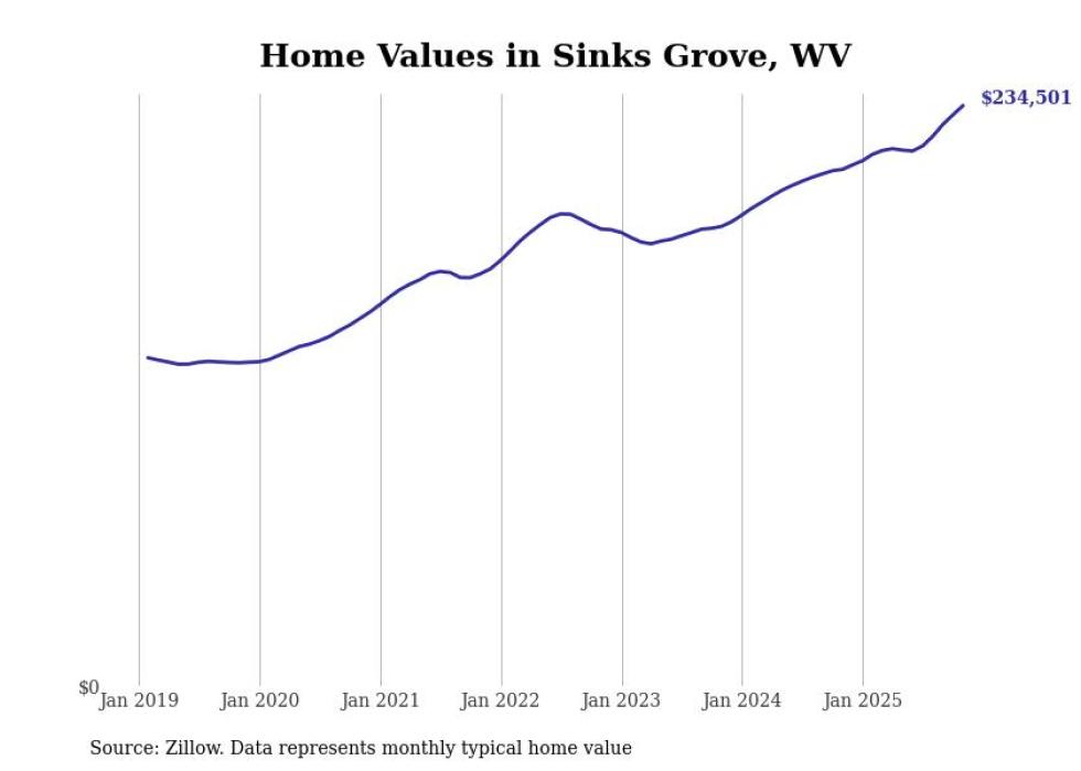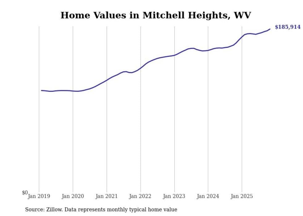 Stacker compiled a list of cities with the fastest-growing home prices in West Virginia using data from Zillow. Cities are ranked by the dollar change in the Zillow Home Values Index for all homes from the 12 months ending November 2025. The charts in this story were created automatically using Matplotlib. Data was available for 50 cities and towns in West Virginia.
