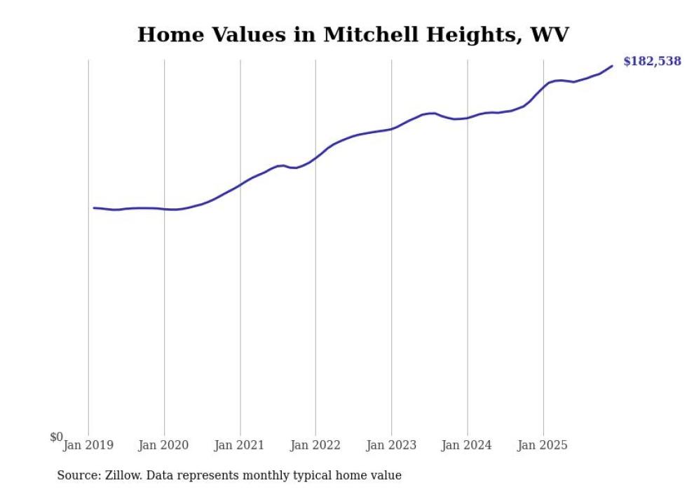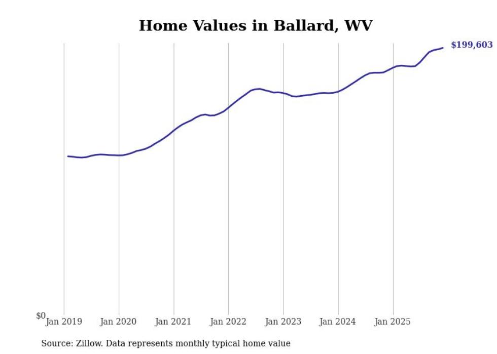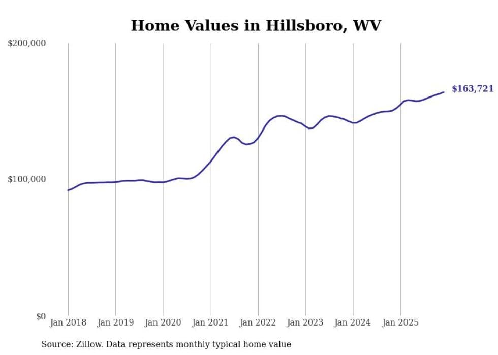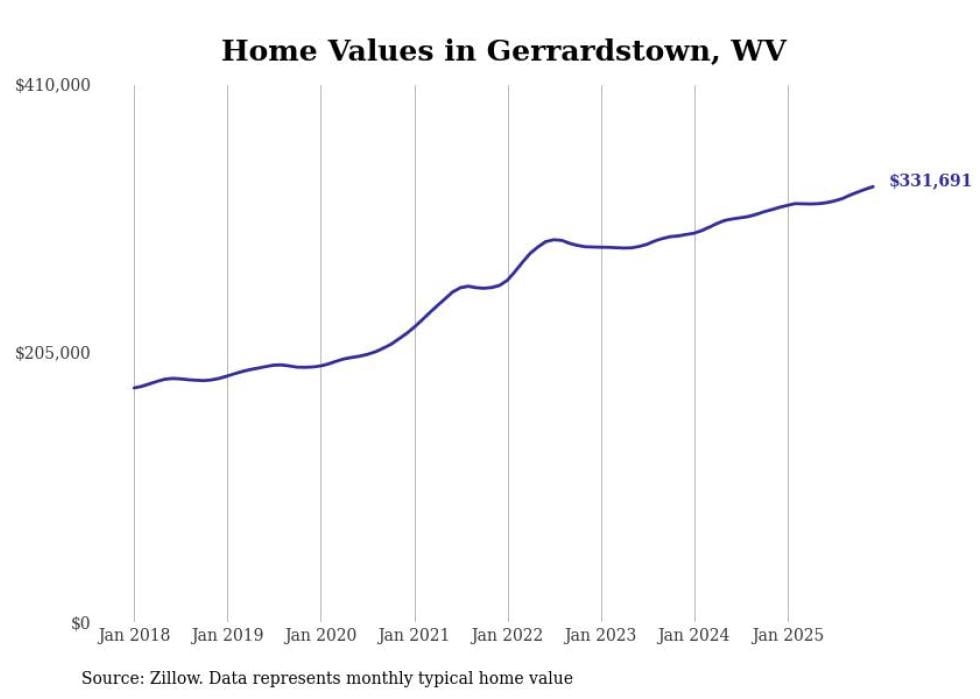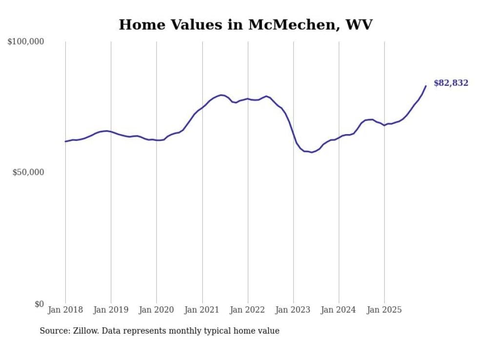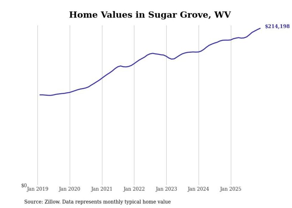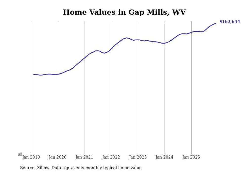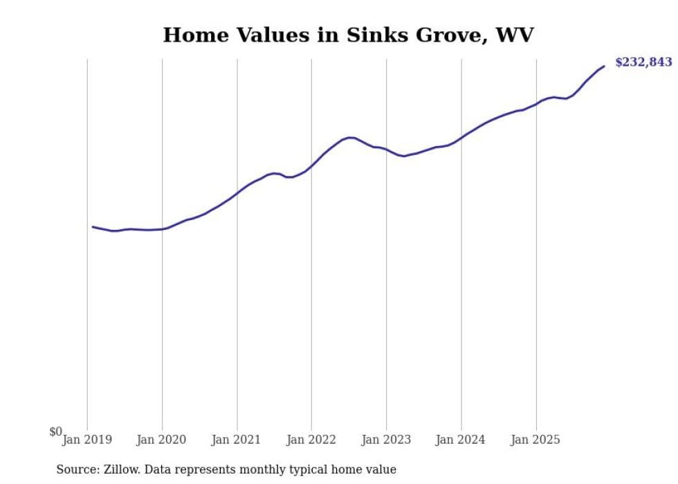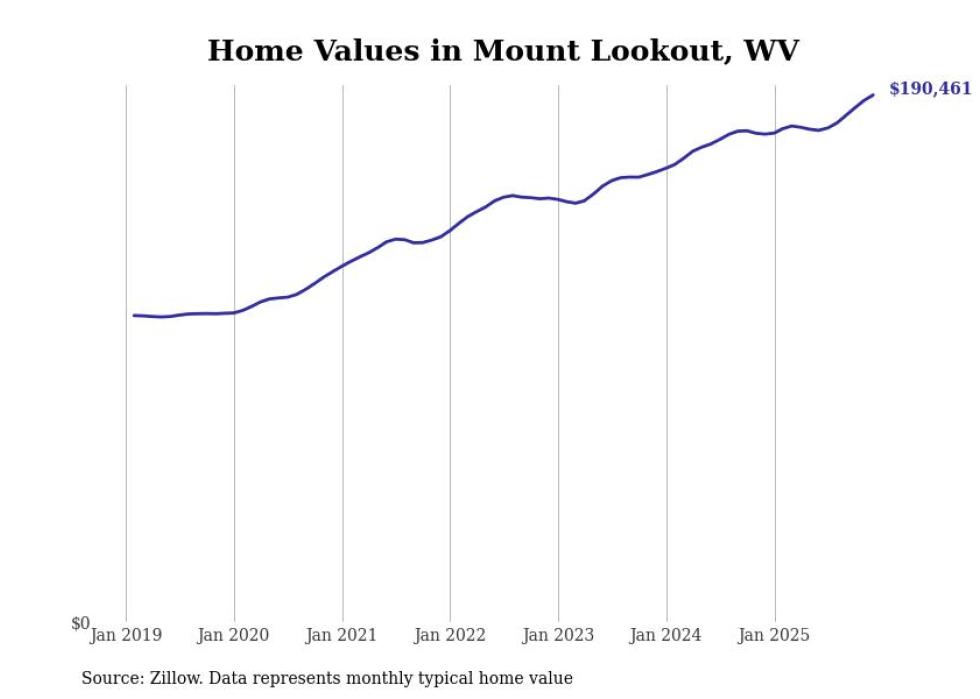 Stacker compiled a list of cities with the fastest-growing home prices in West Virginia using data from Zillow. Cities are ranked by the dollar change in the Zillow Home Values Index for all homes from the 12 months ending December 2025. The charts in this story were created automatically using Matplotlib. Data was available for 50 cities and towns in West Virginia.