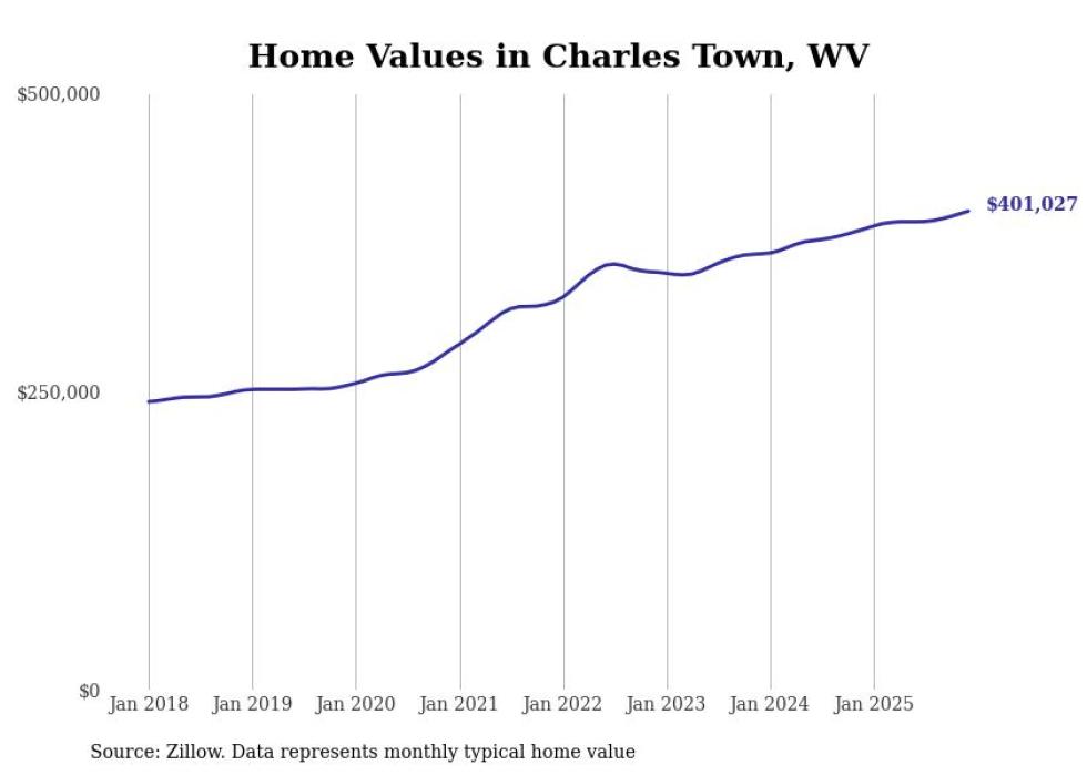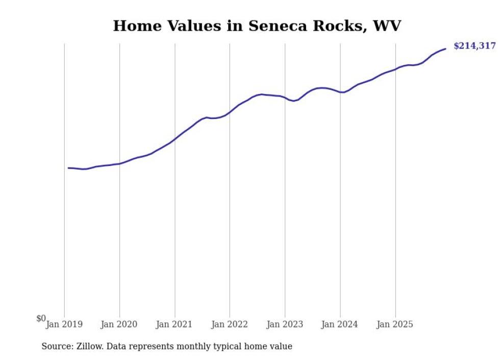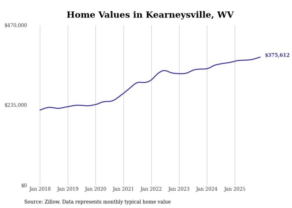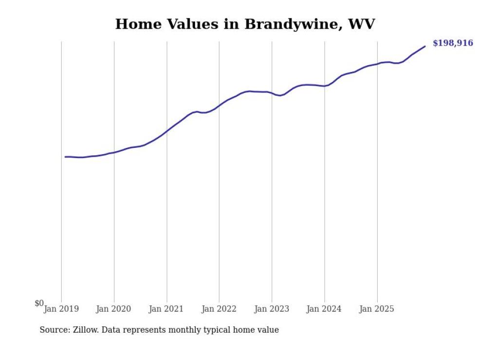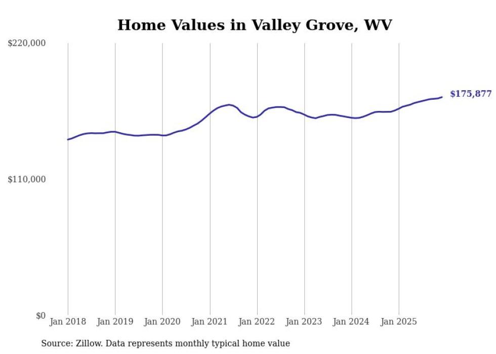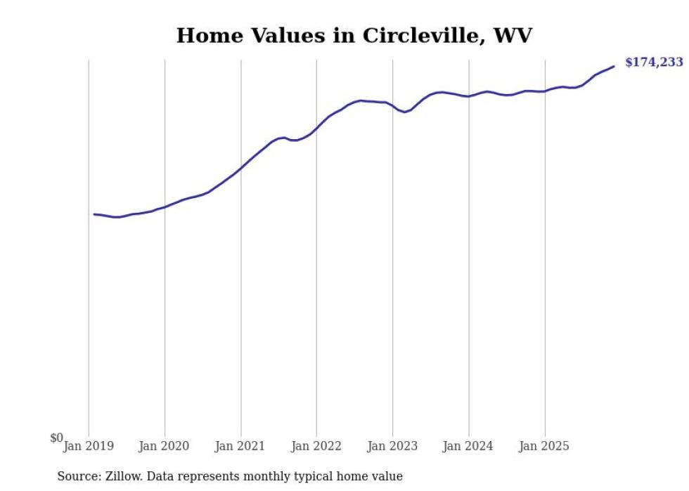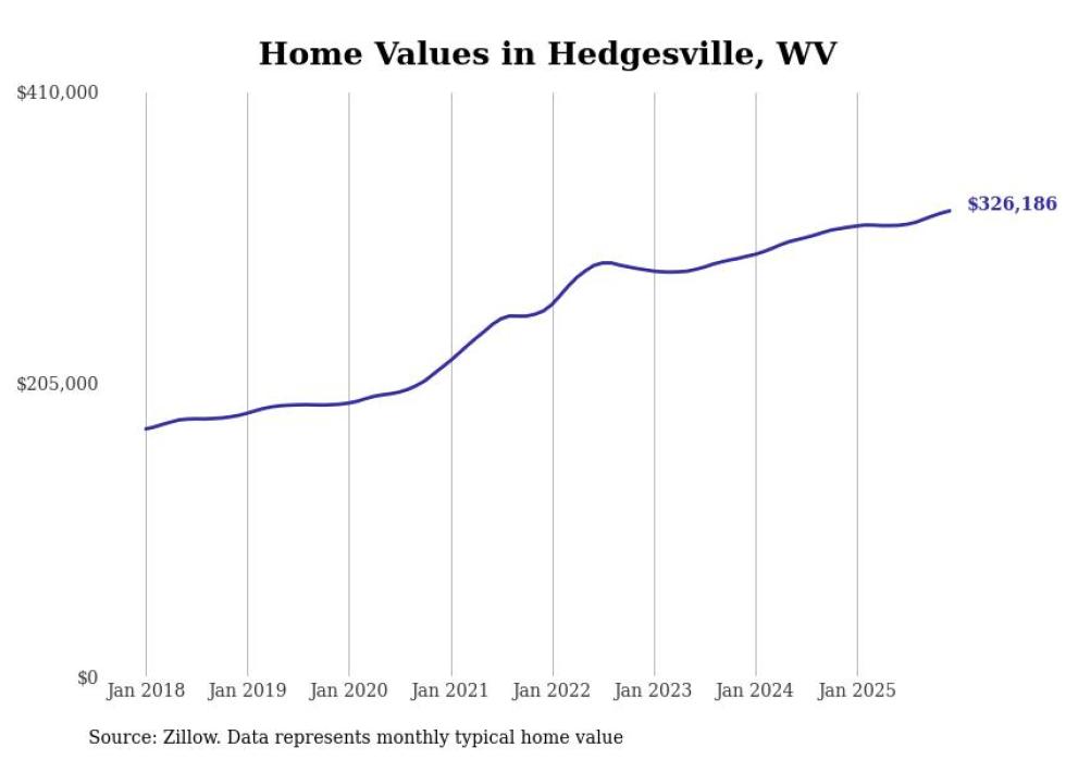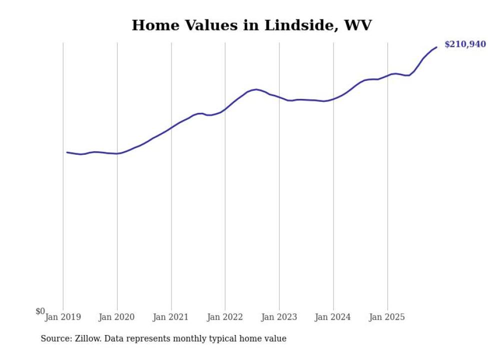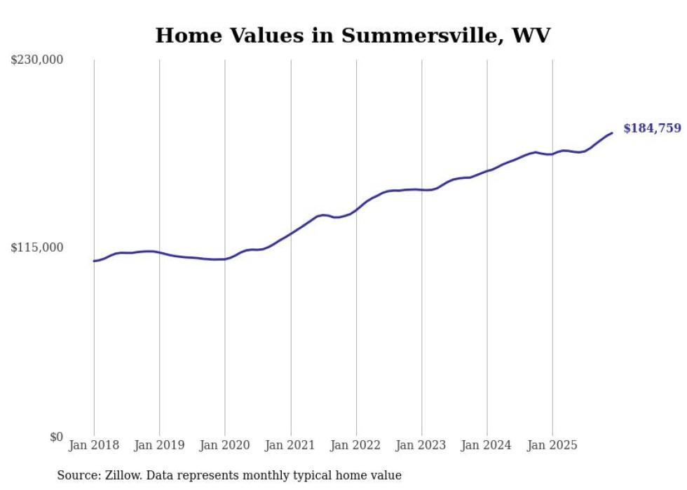 Stacker compiled a list of cities with the fastest-growing home prices in West Virginia using data from Zillow. Cities are ranked by the dollar change in the Zillow Home Values Index for all homes from the 12 months ending December 2025. The charts in this story were created automatically using Matplotlib. Data was available for 50 cities and towns in West Virginia.