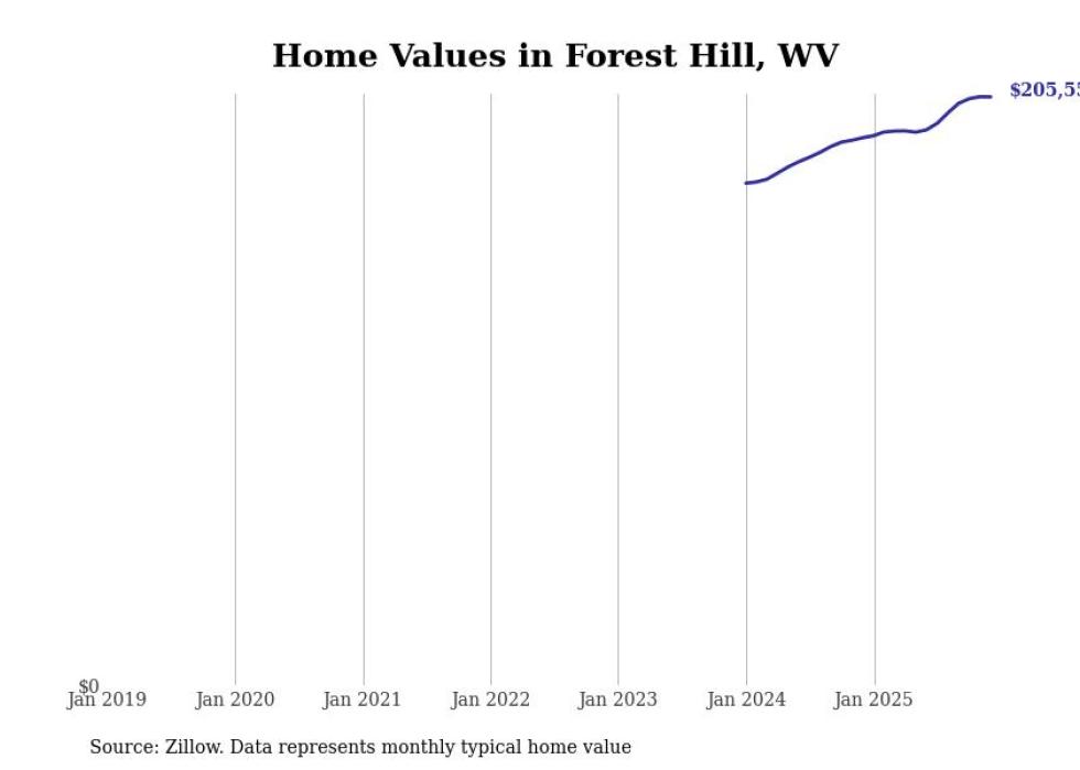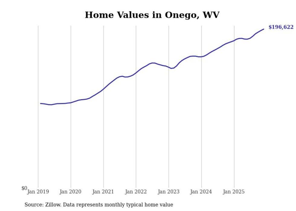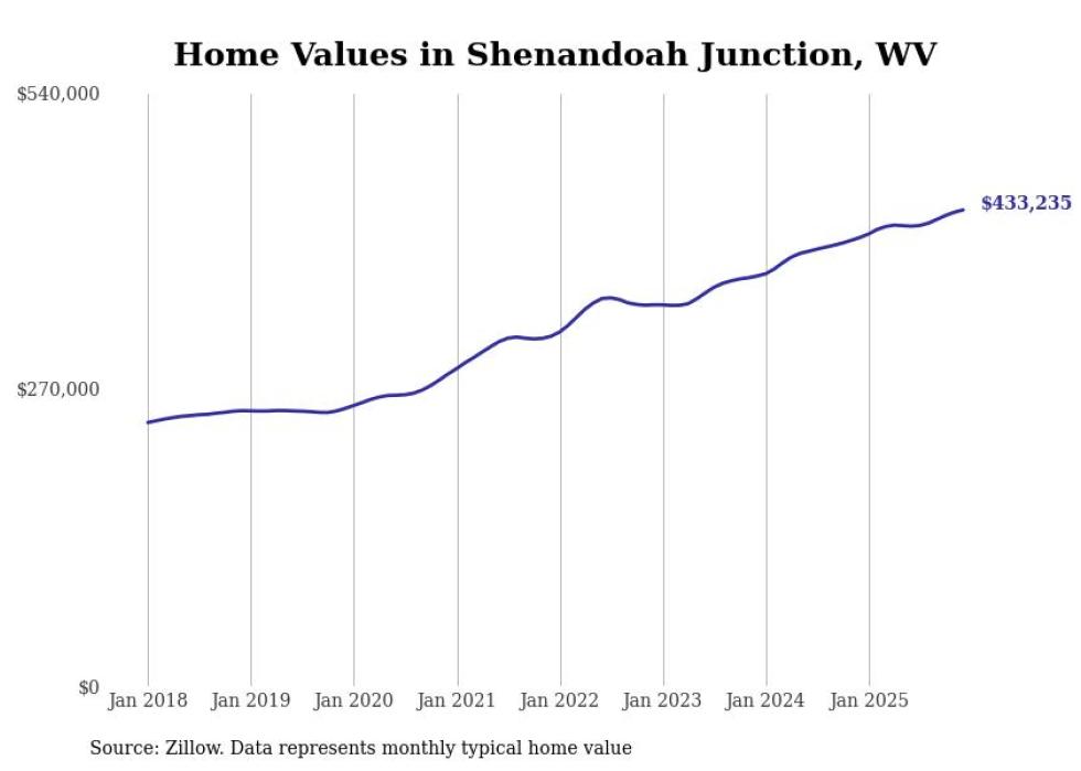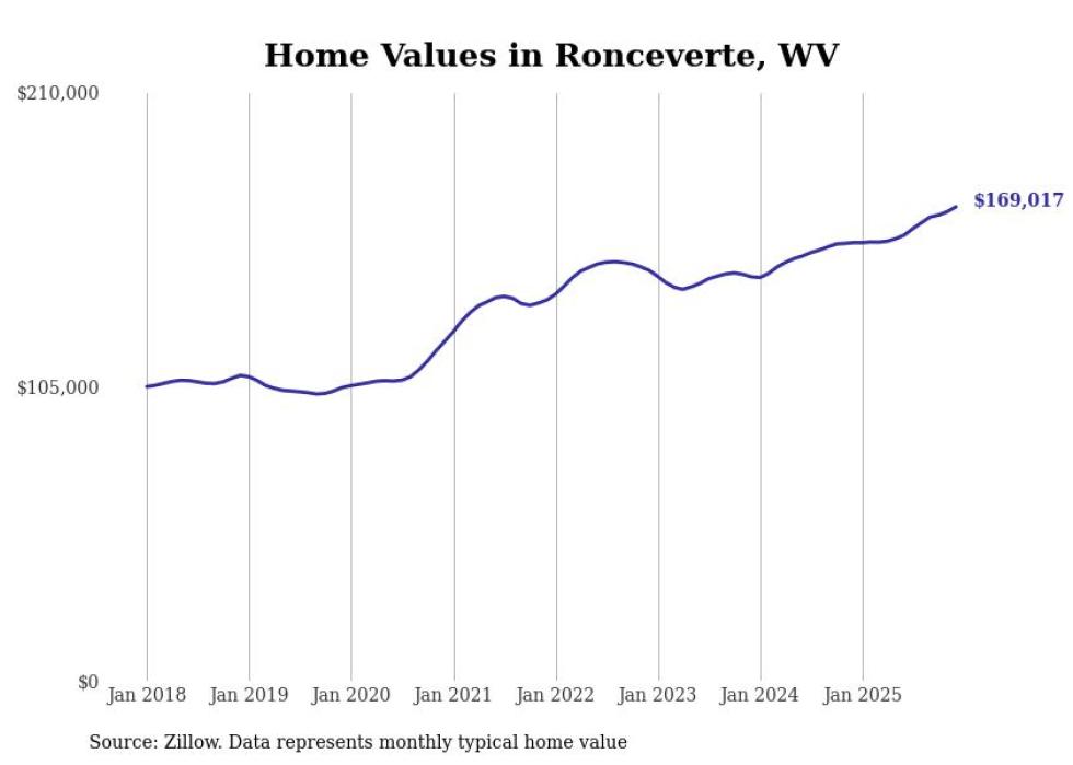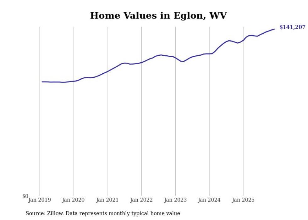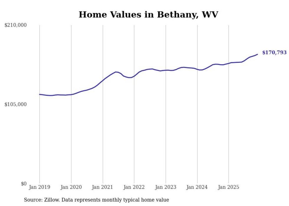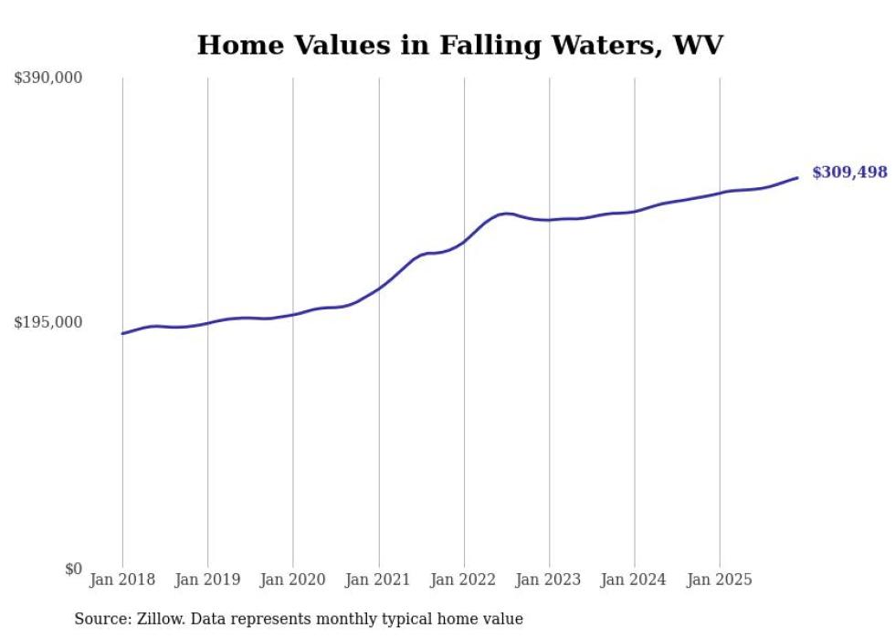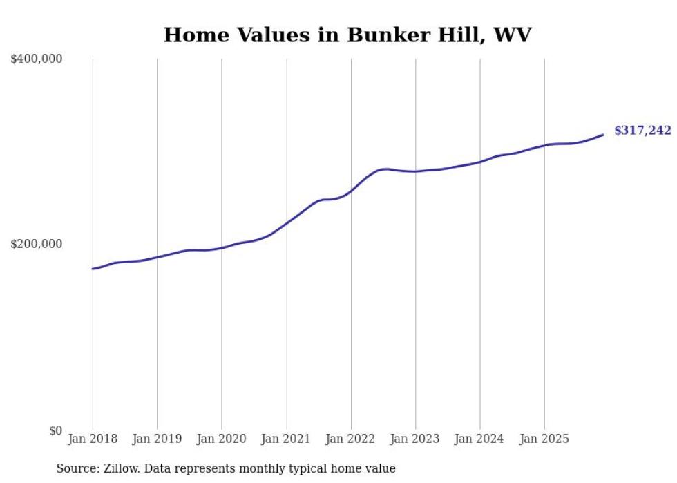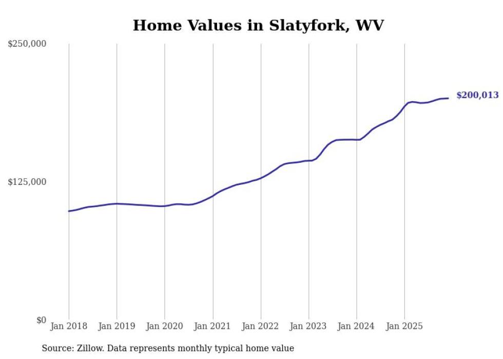 Stacker compiled a list of cities with the fastest-growing home prices in West Virginia using data from Zillow. Cities are ranked by the dollar change in the Zillow Home Values Index for all homes from the 12 months ending December 2025. The charts in this story were created automatically using Matplotlib. Data was available for 50 cities and towns in West Virginia.