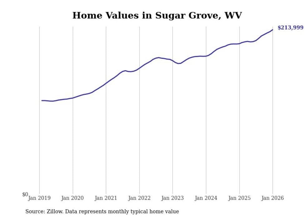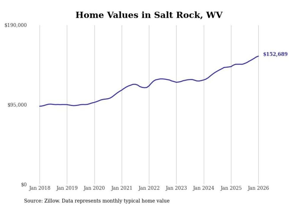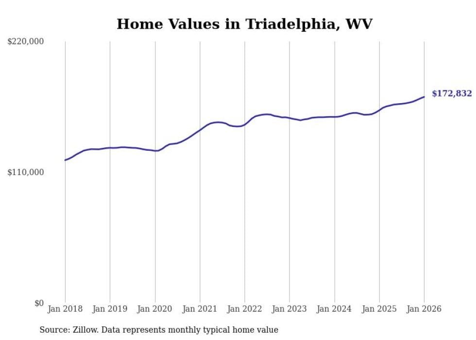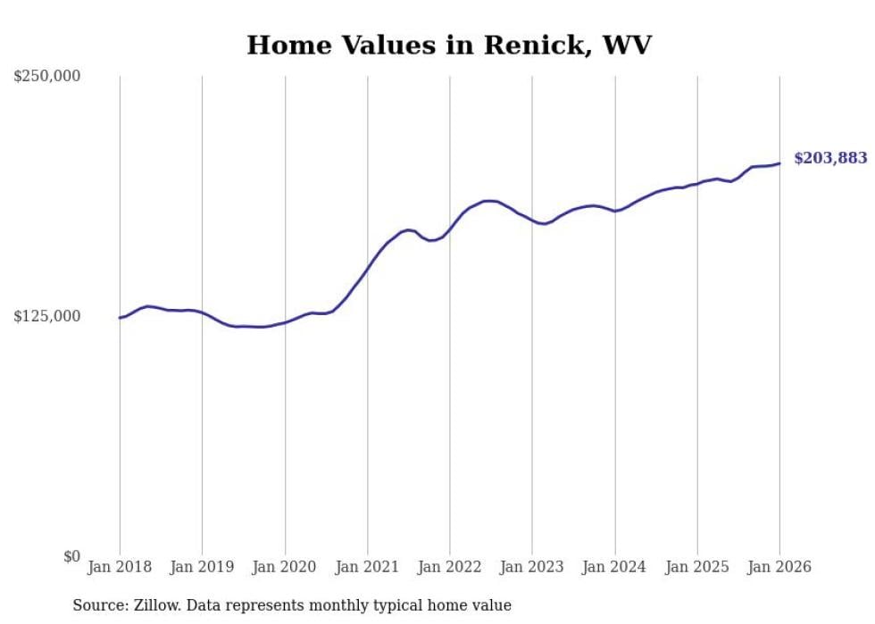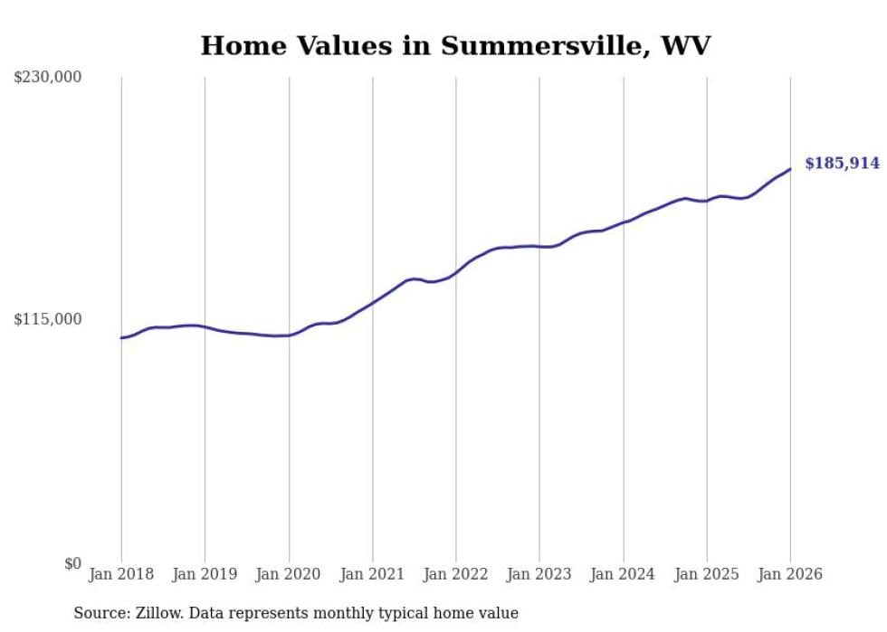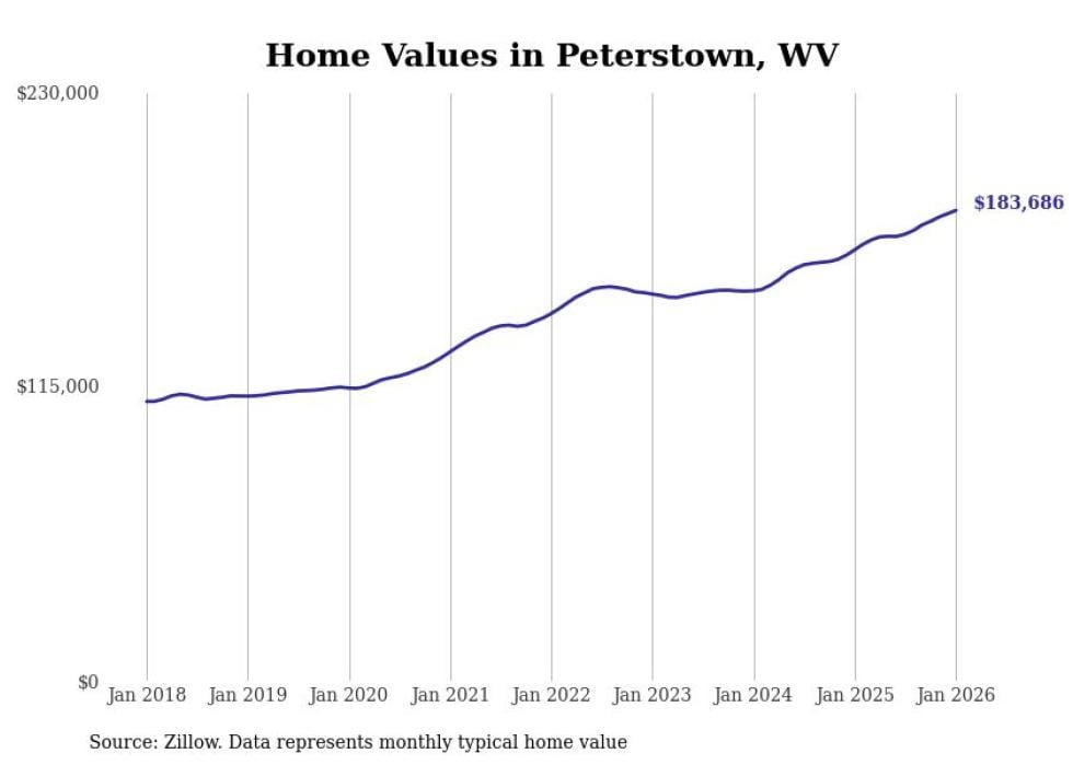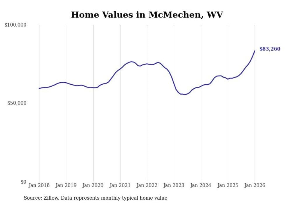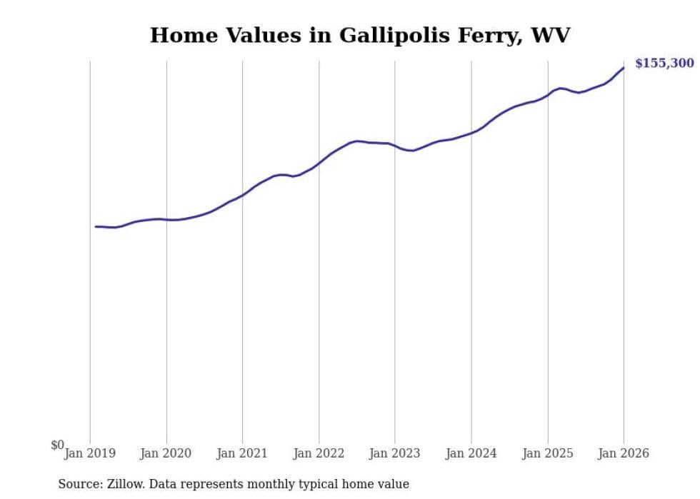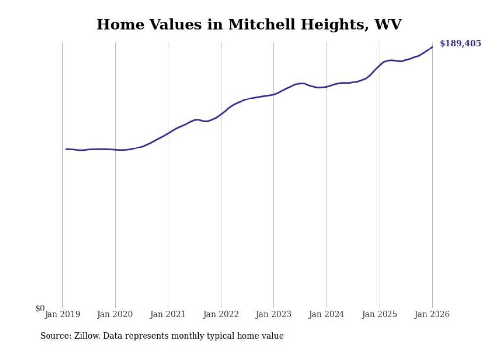 Stacker compiled a list of cities with the fastest-growing home prices in West Virginia using data from Zillow. Cities are ranked by the dollar change in the Zillow Home Values Index for all homes from the 12 months ending January 2026. The charts in this story were created automatically using Matplotlib. Data was available for 50 cities and towns in West Virginia.