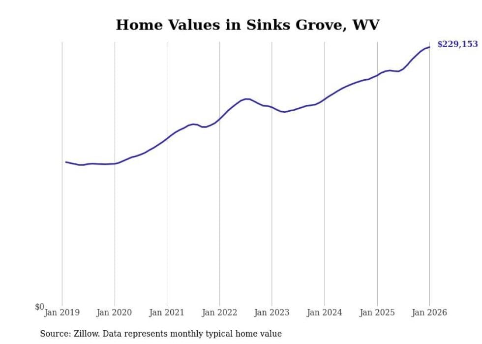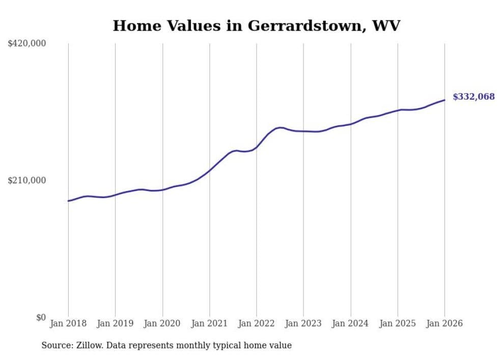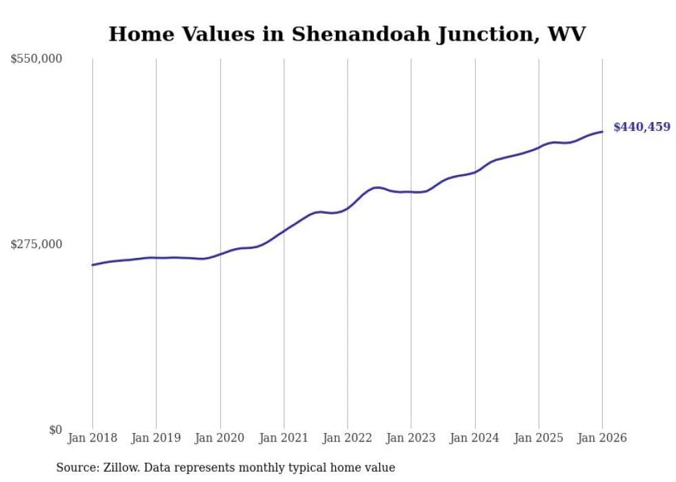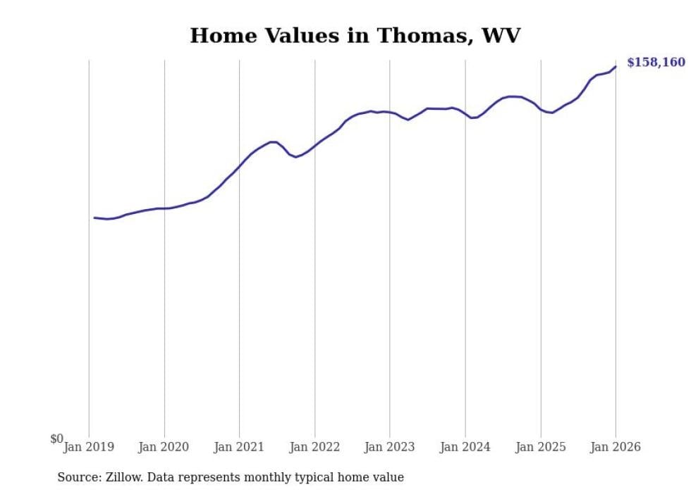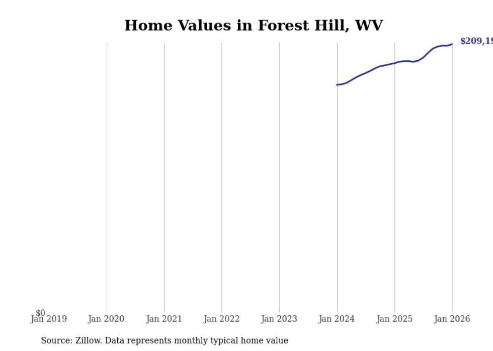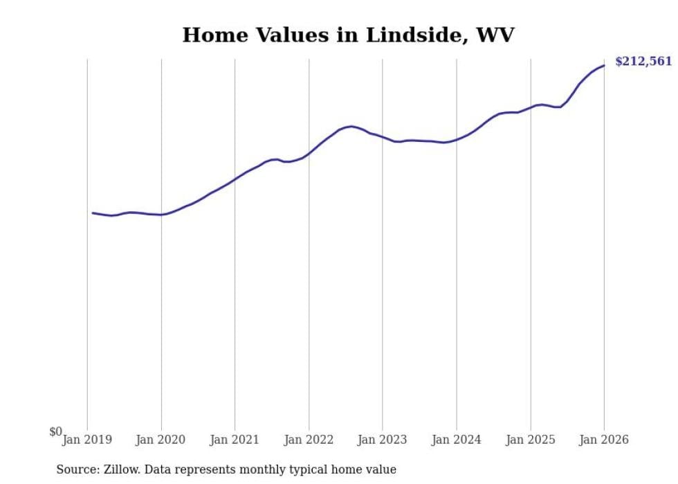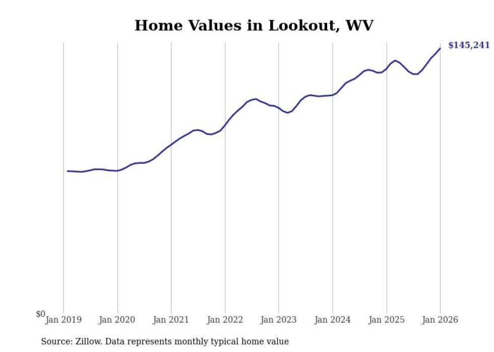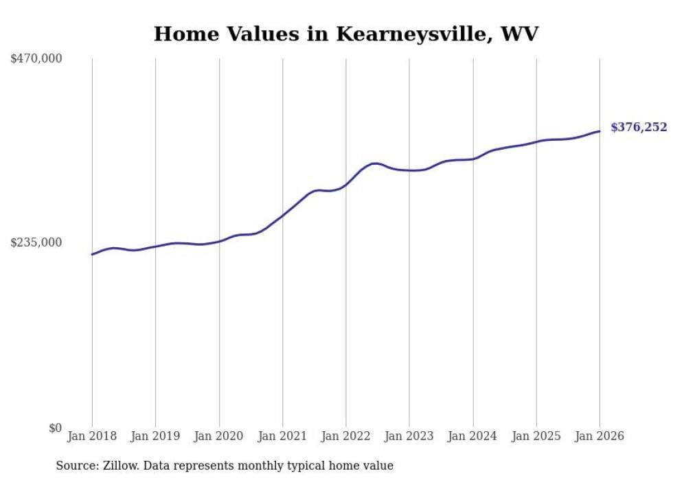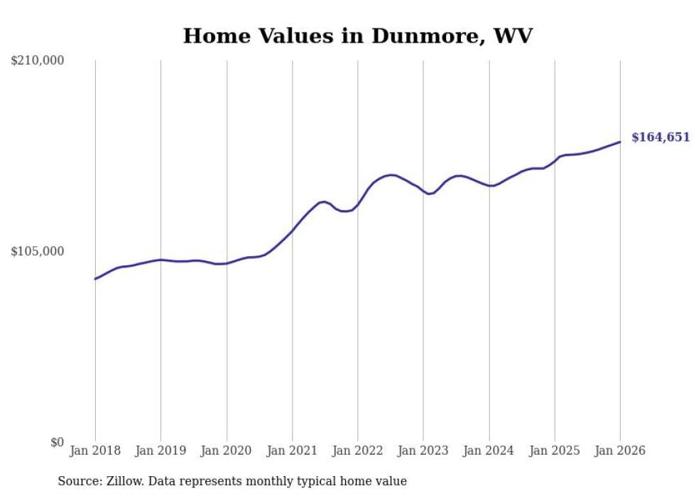 Stacker compiled a list of cities with the fastest-growing home prices in West Virginia using data from Zillow. Cities are ranked by the dollar change in the Zillow Home Values Index for all homes from the 12 months ending January 2026. The charts in this story were created automatically using Matplotlib. Data was available for 50 cities and towns in West Virginia.
