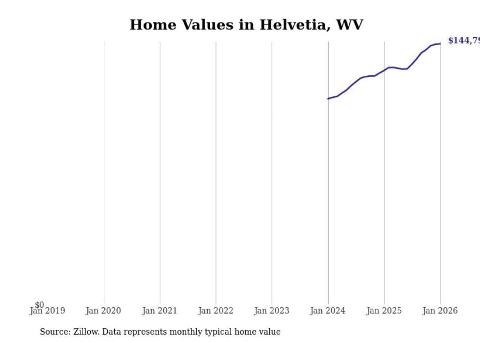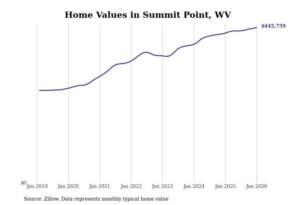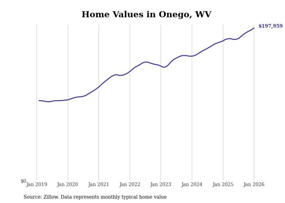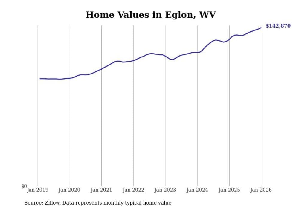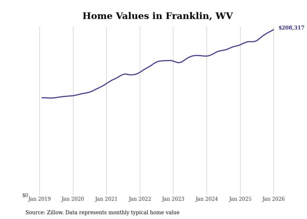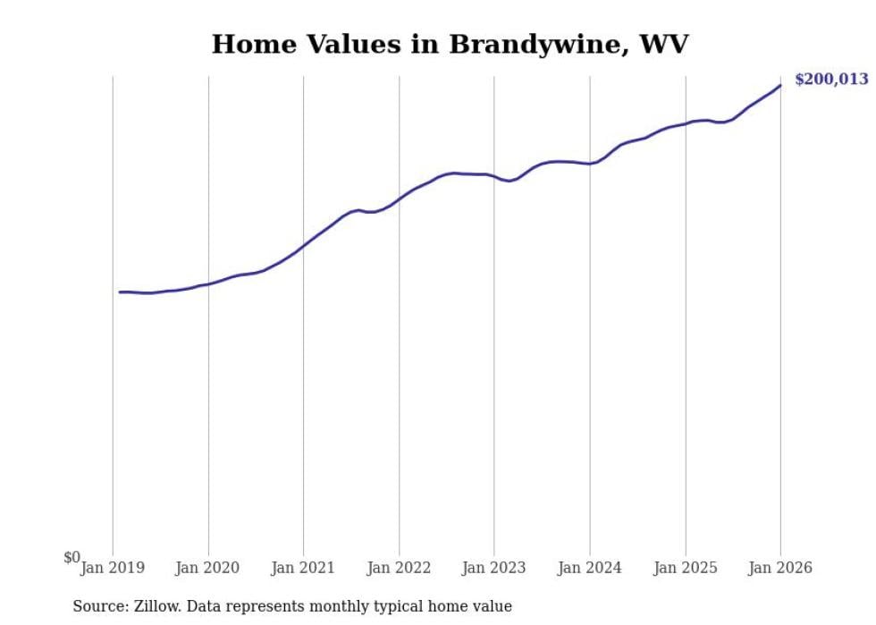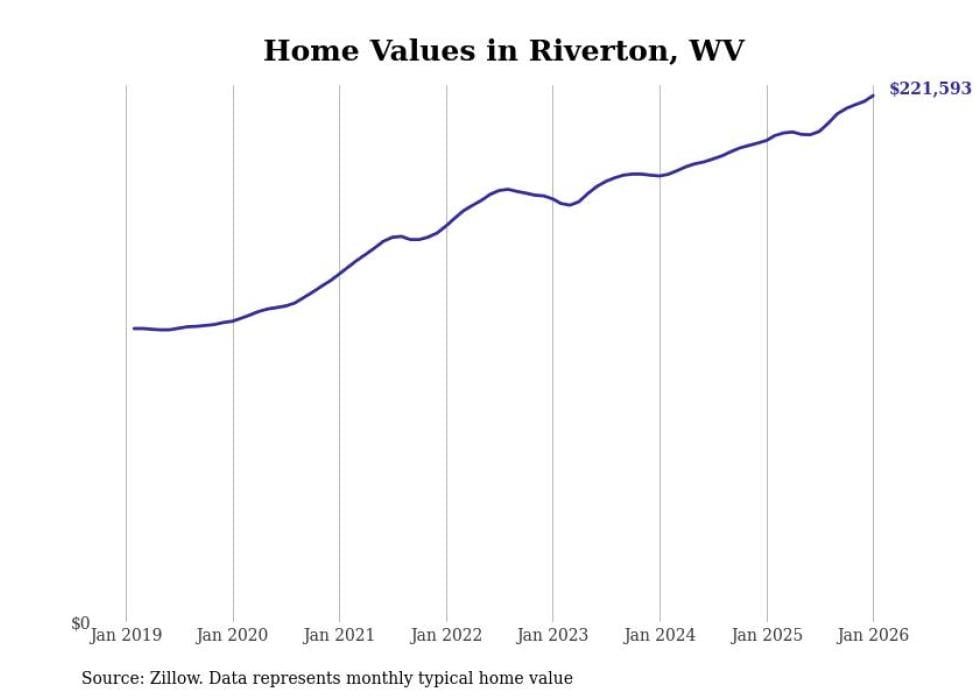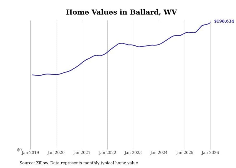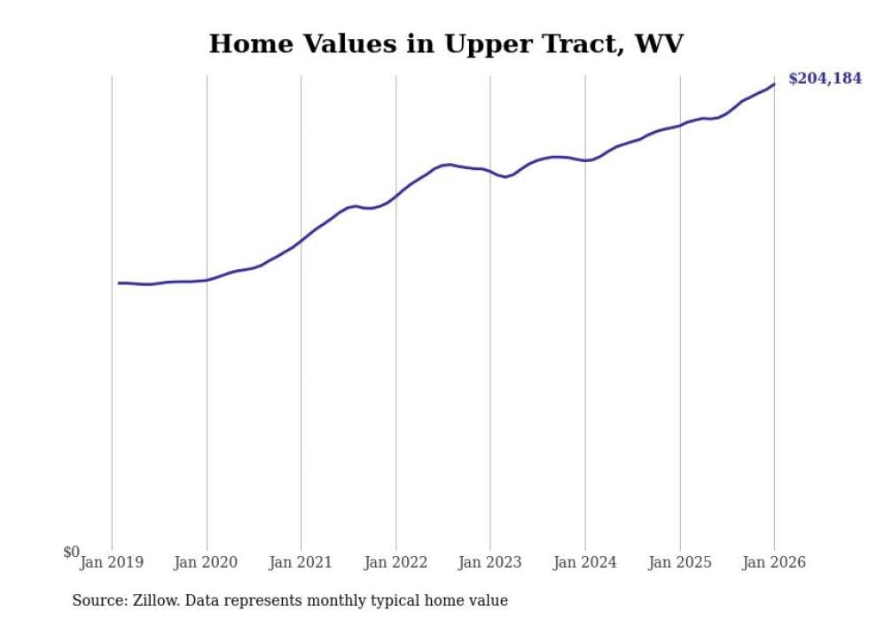 Stacker compiled a list of cities with the fastest-growing home prices in West Virginia using data from Zillow. Cities are ranked by the dollar change in the Zillow Home Values Index for all homes from the 12 months ending January 2026. The charts in this story were created automatically using Matplotlib. Data was available for 50 cities and towns in West Virginia.
