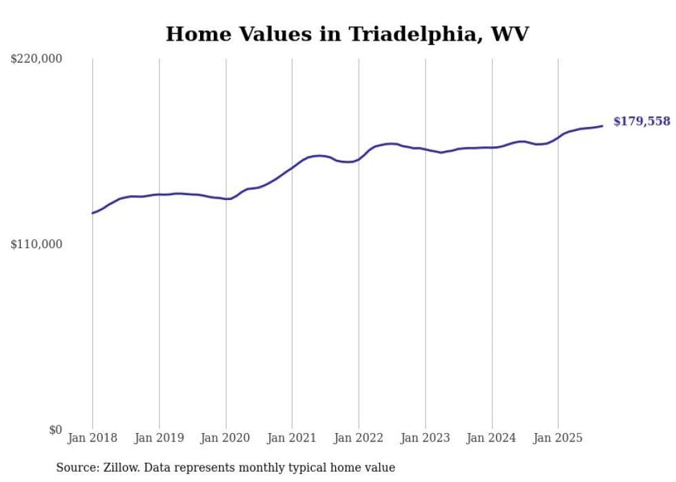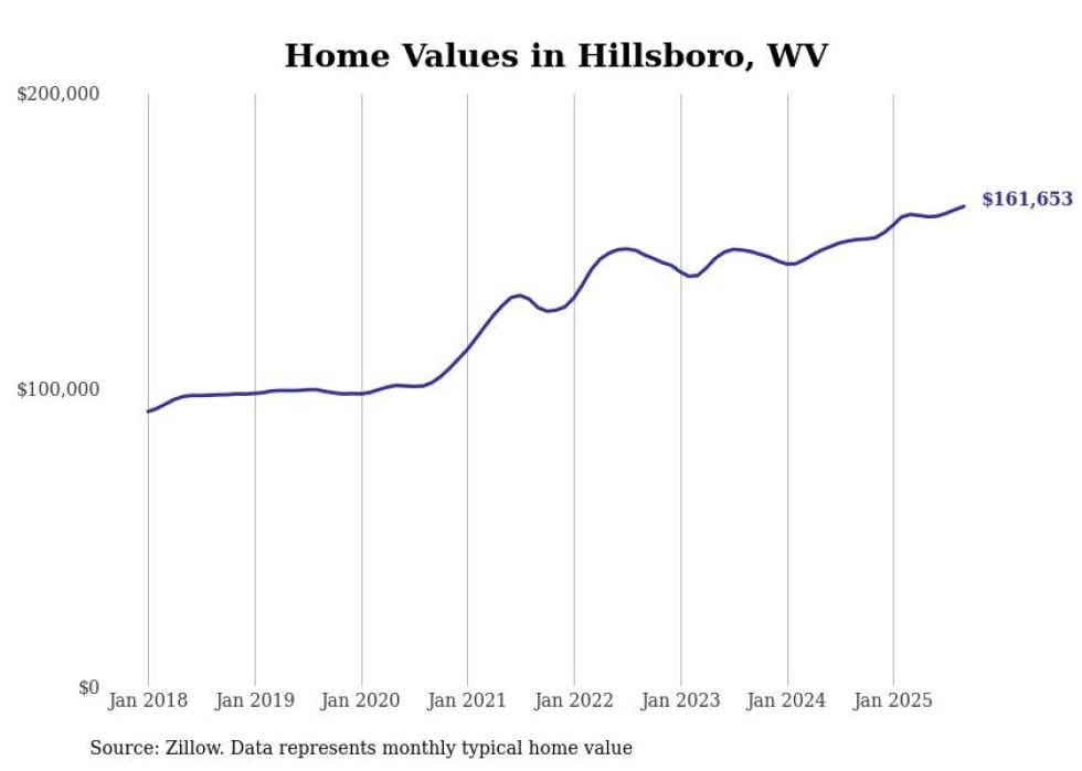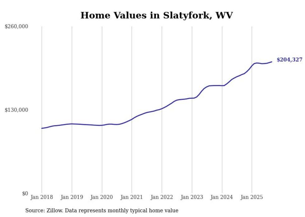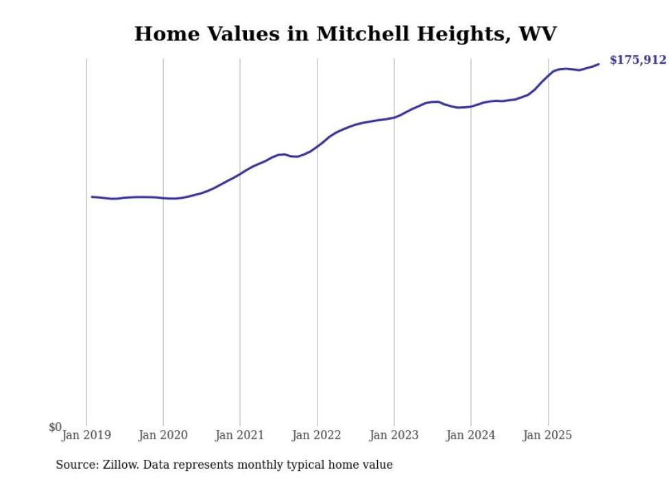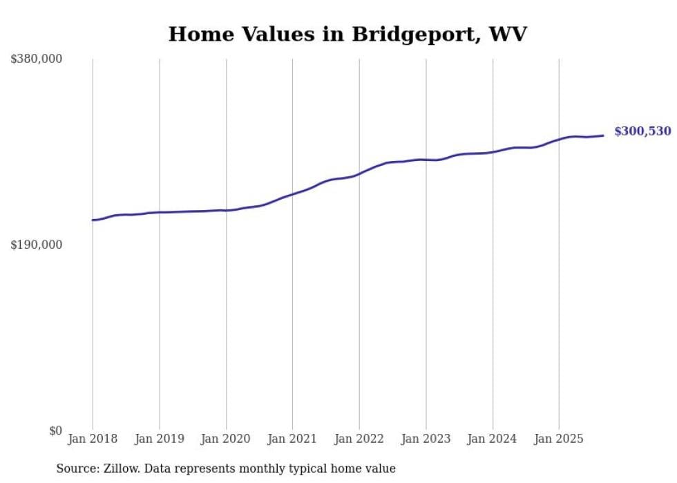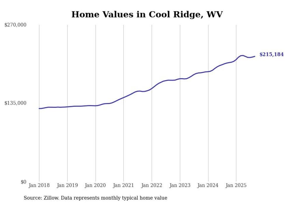 Stacker compiled a list of cities with the fastest-growing home prices in West Virginia using data from Zillow. Cities are ranked by the dollar change in the Zillow Home Values Index for all homes from the 12 months ending September 2025. The charts in this story were created automatically using Matplotlib. Data was available for 50 cities and towns in West Virginia.