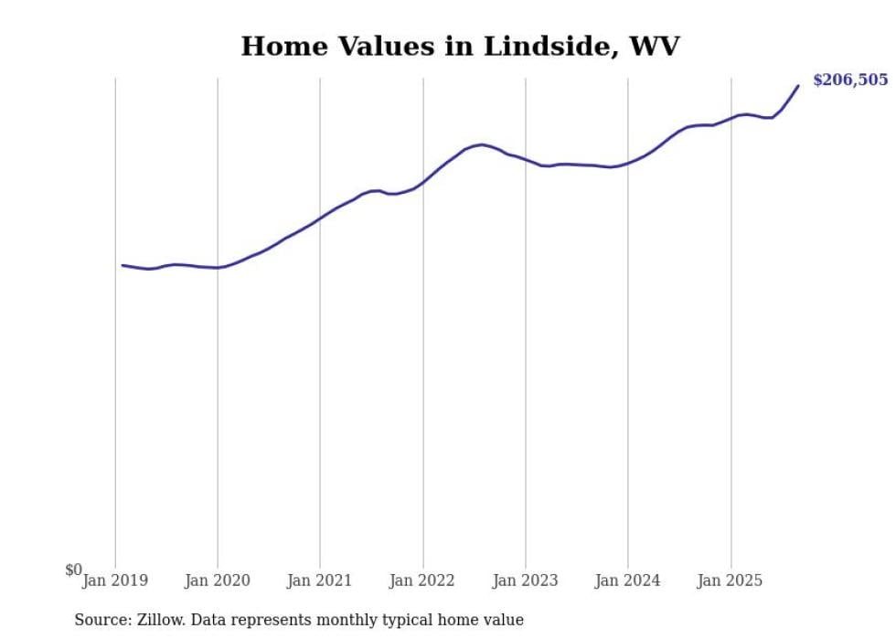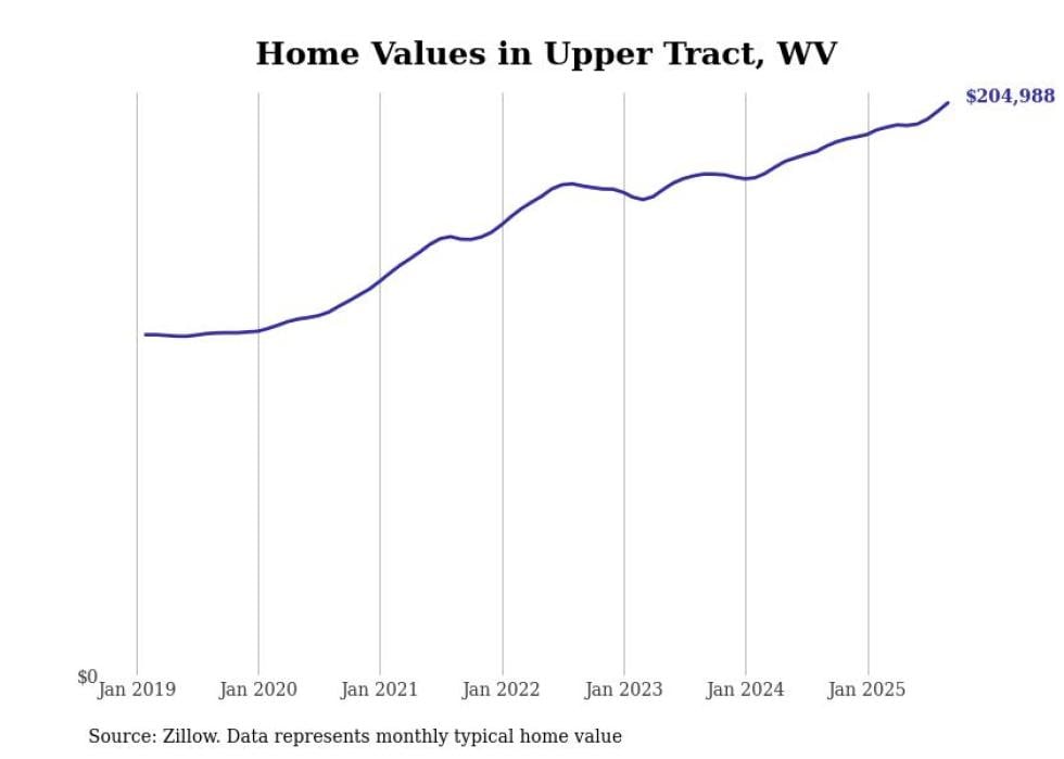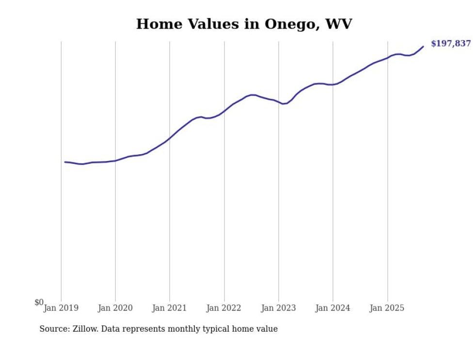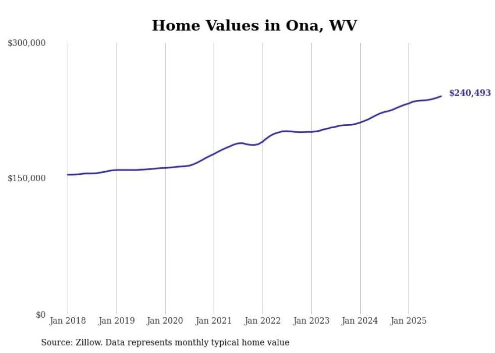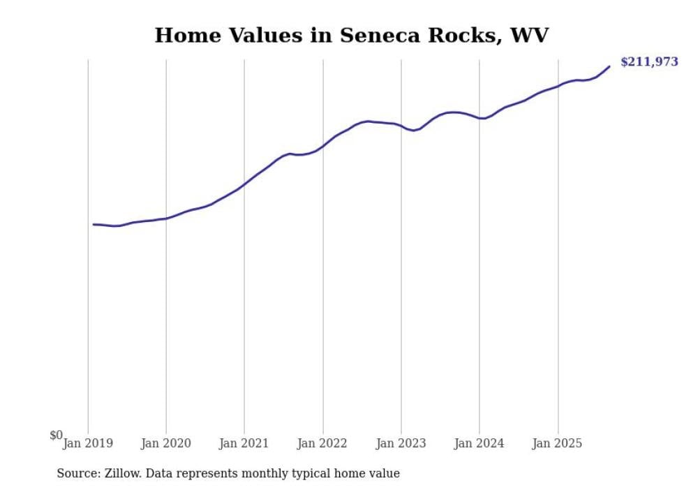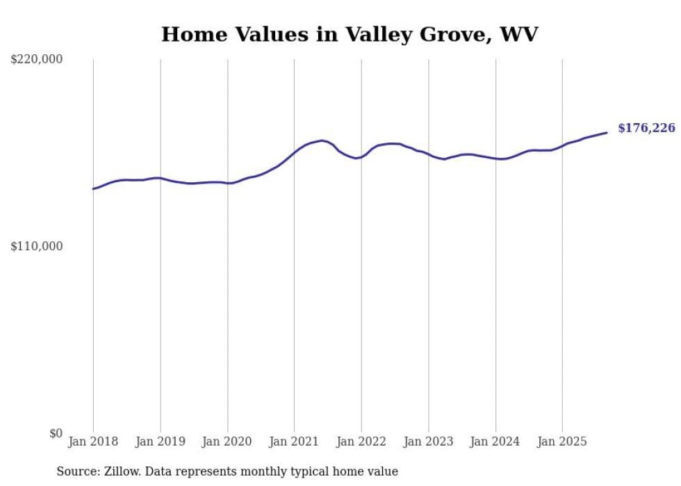 Stacker compiled a list of cities with the fastest-growing home prices in West Virginia using data from Zillow. Cities are ranked by the dollar change in the Zillow Home Values Index for all homes from the 12 months ending September 2025. The charts in this story were created automatically using Matplotlib. Data was available for 50 cities and towns in West Virginia.