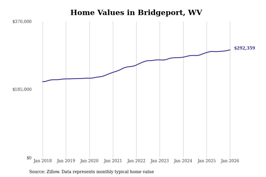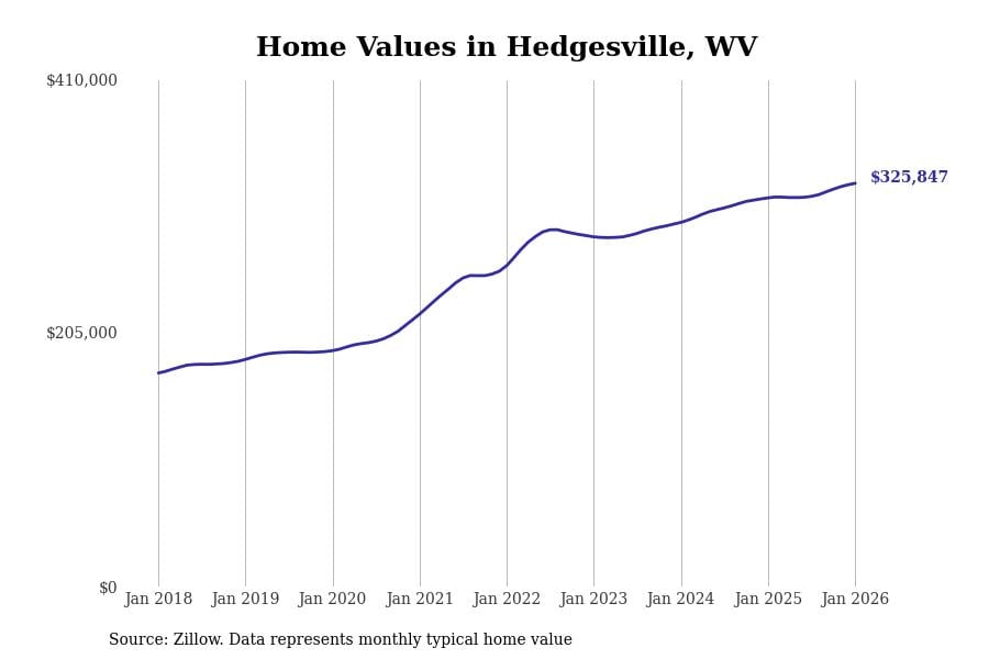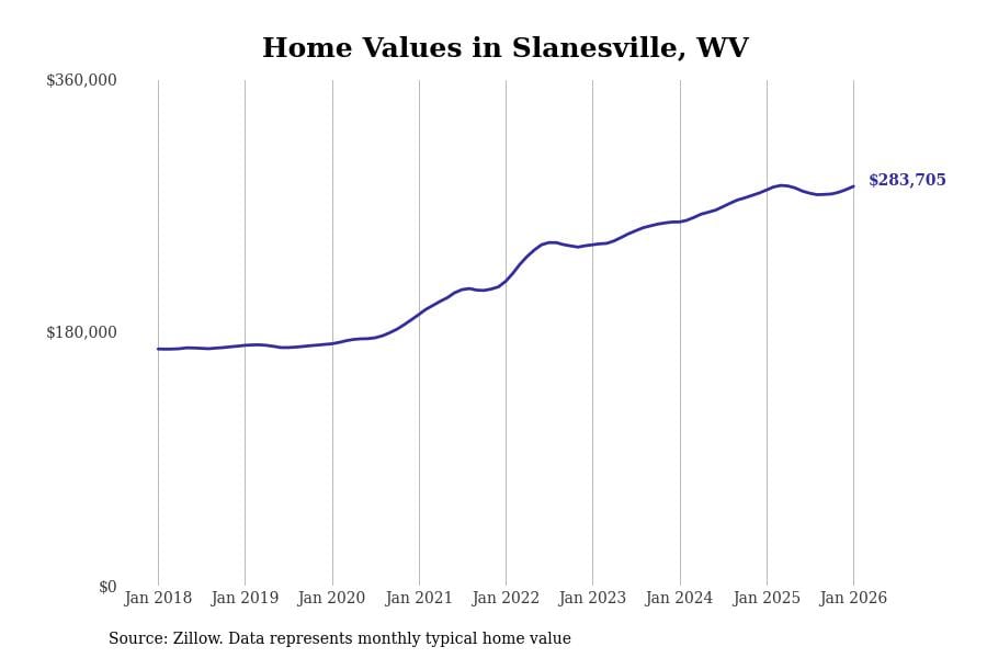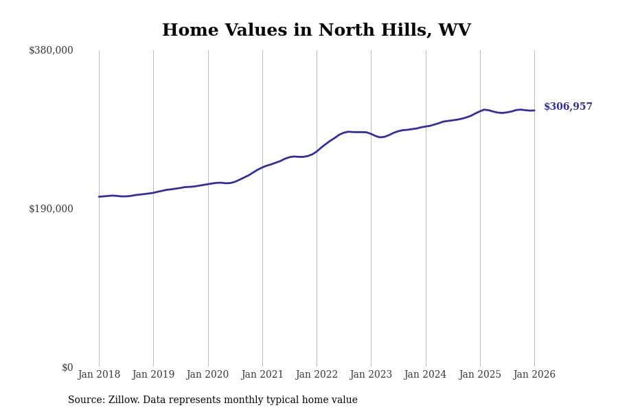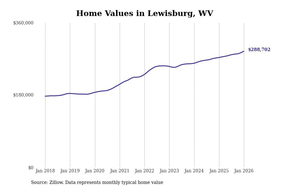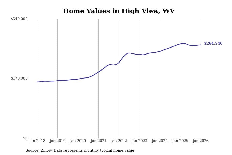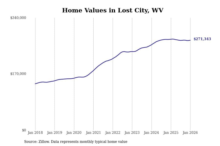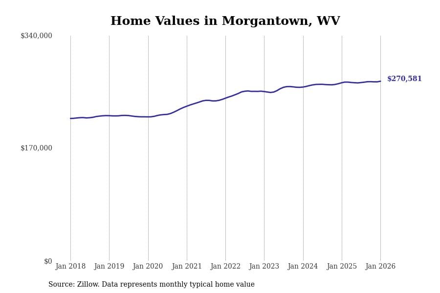 Stacker compiled a list of cities with the most expensive homes in West Virginia using data from Zillow. Cities are ranked by the Zillow Home Values Index for all homes as of January 2026. The charts in this story were created automatically using Matplotlib.