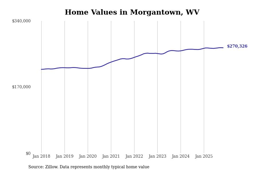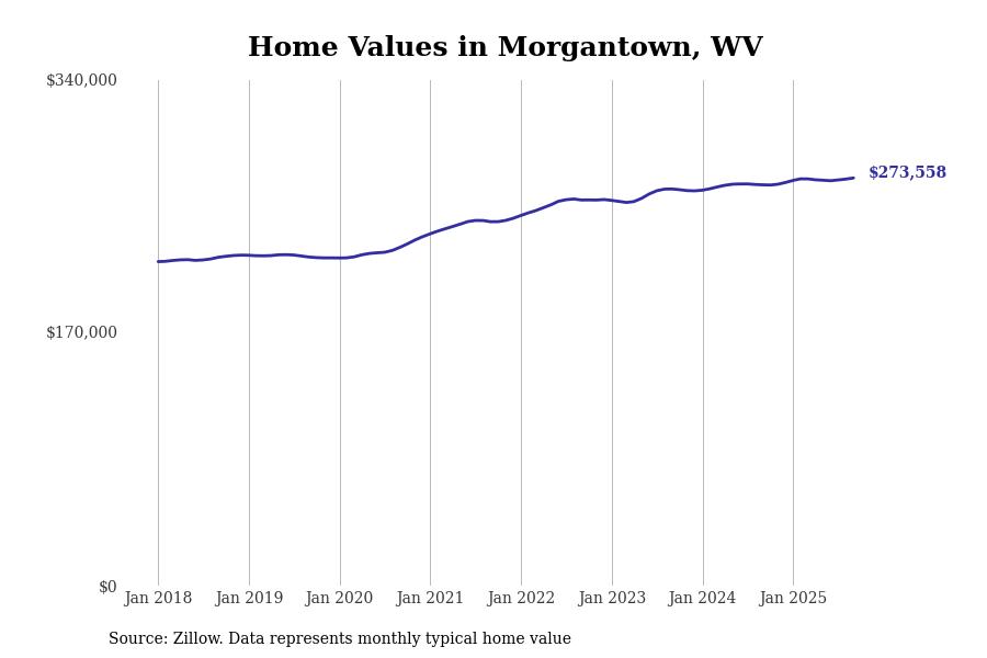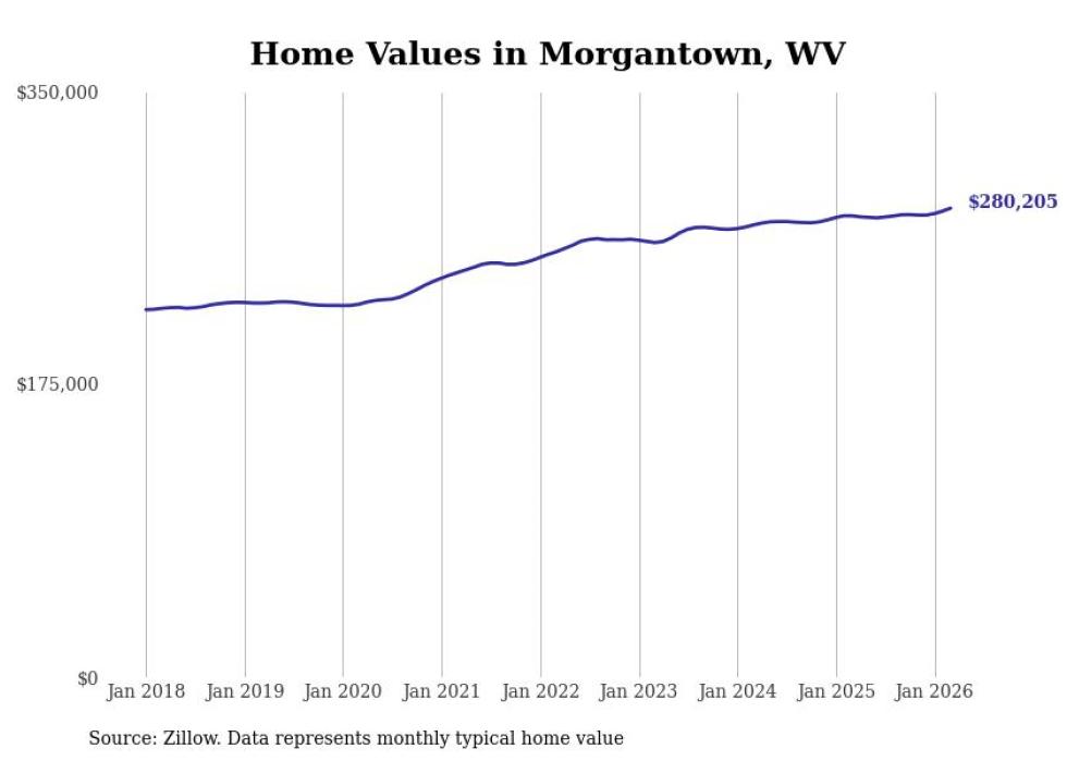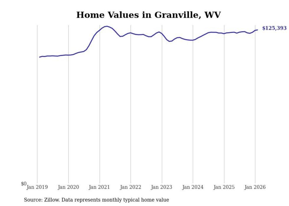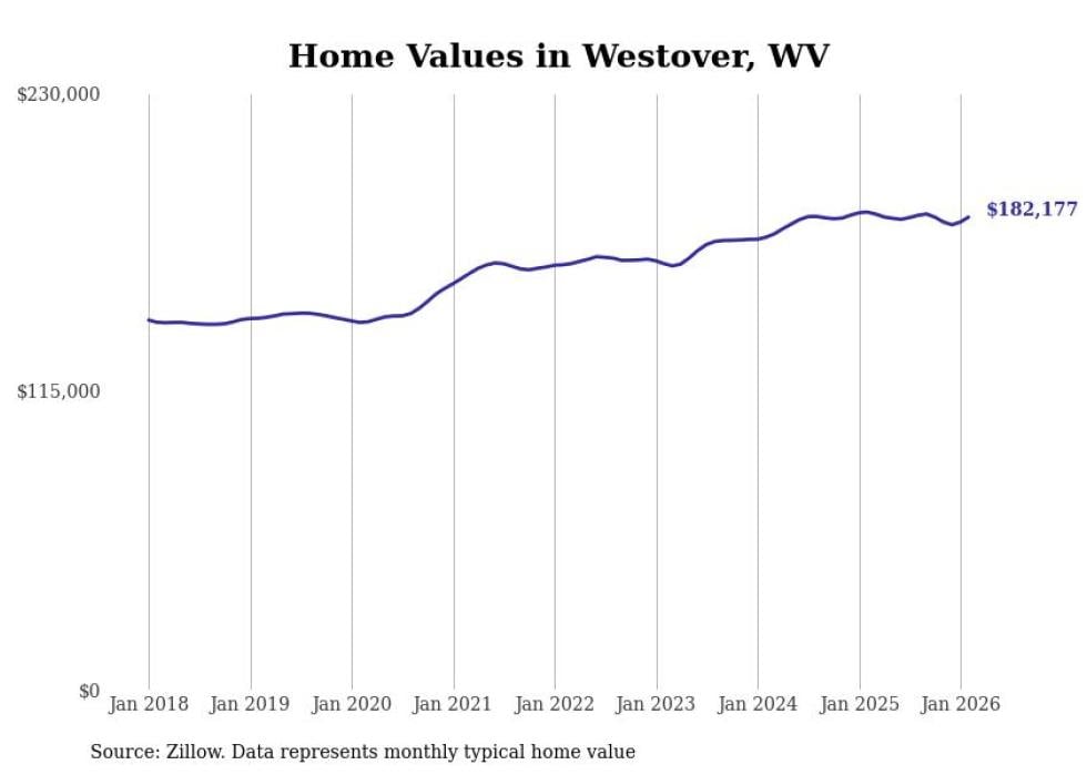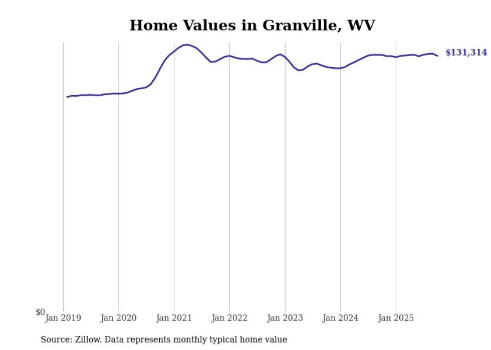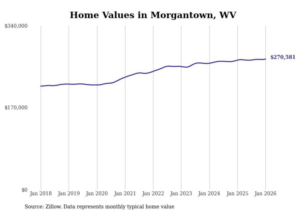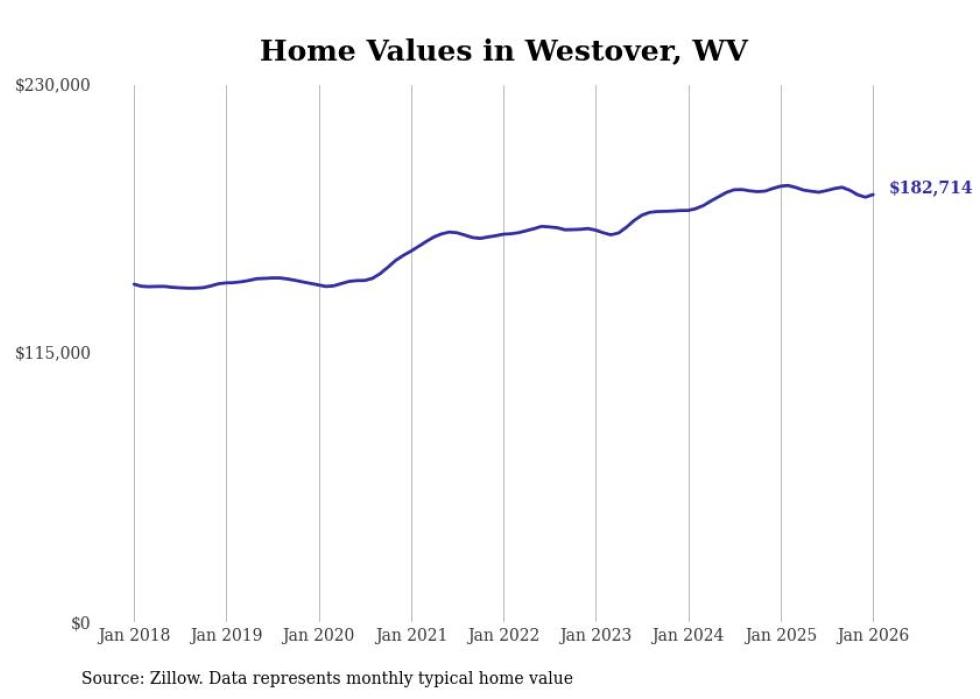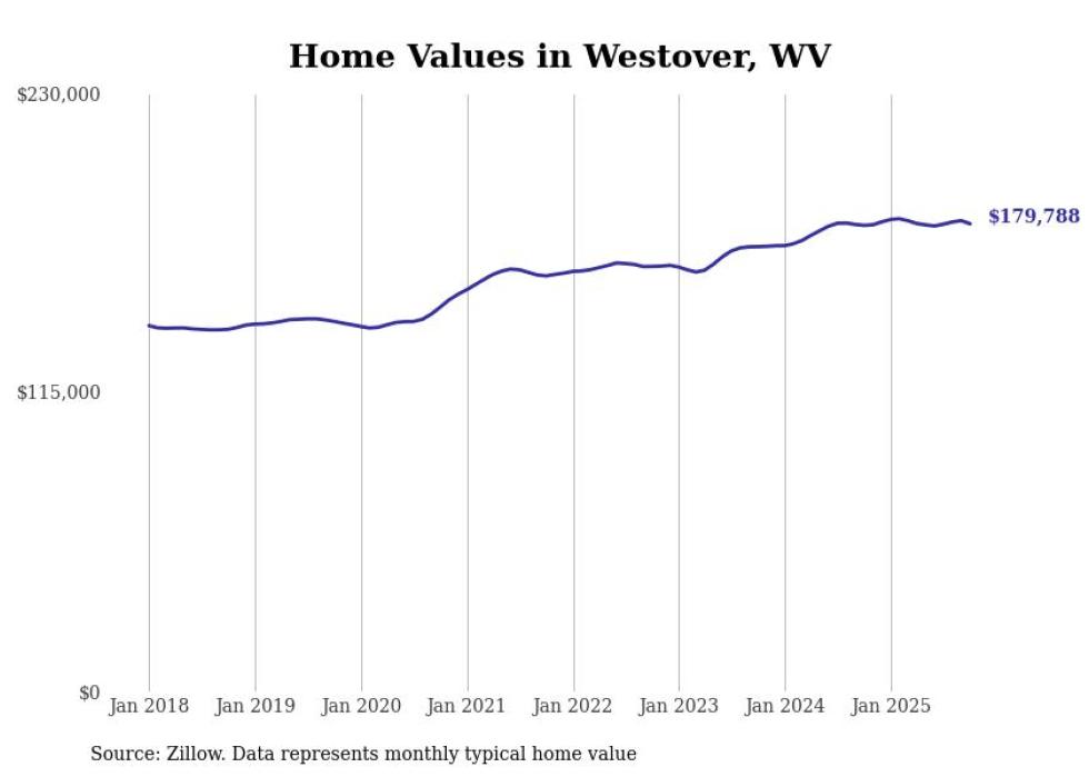 Stacker compiled a list of cities with the most expensive homes in the Morgantown metro area using data from Zillow. Charts show the monthly typical home value since January 2018. All 20 cities and towns with data available were included in the list.