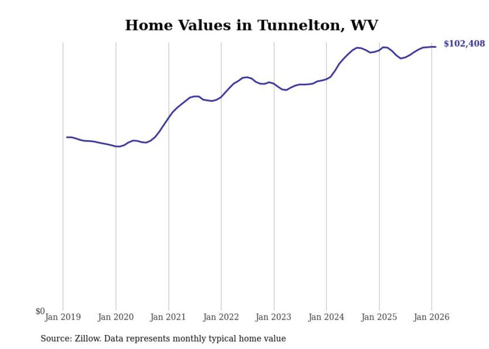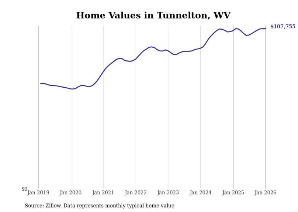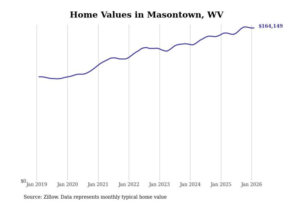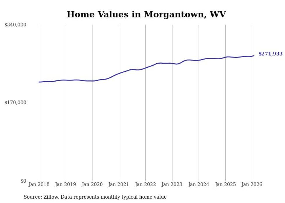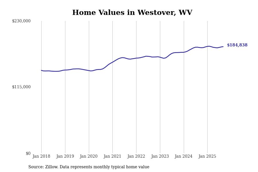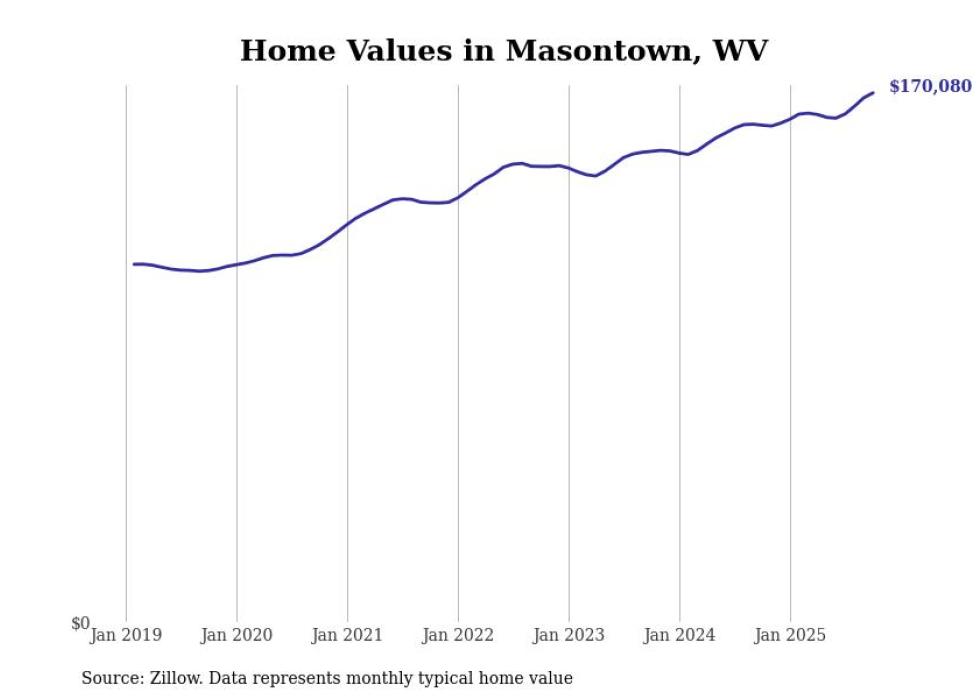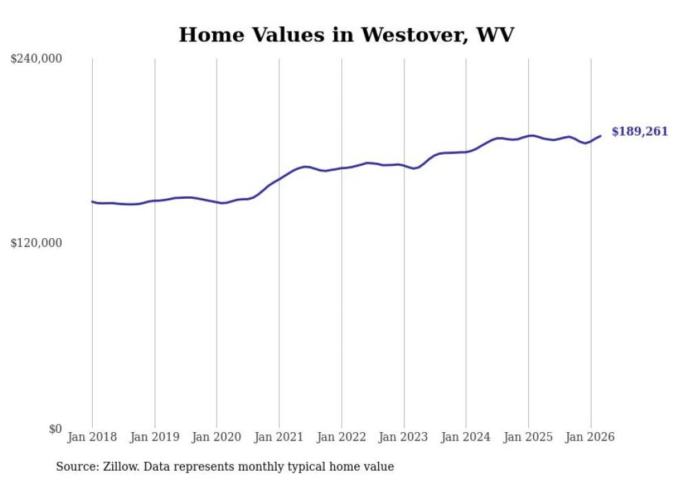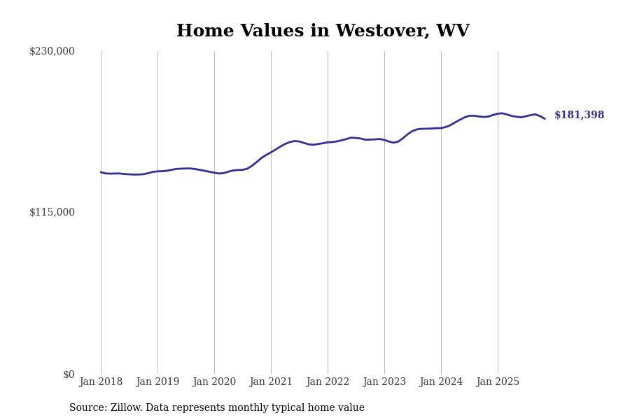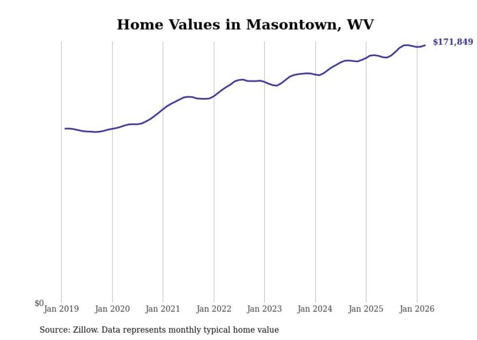 Stacker compiled a list of cities with the most expensive homes in the Morgantown metro area using data from Zillow. Charts show the monthly typical home value since January 2018. All 20 cities and towns with data available were included in the list.