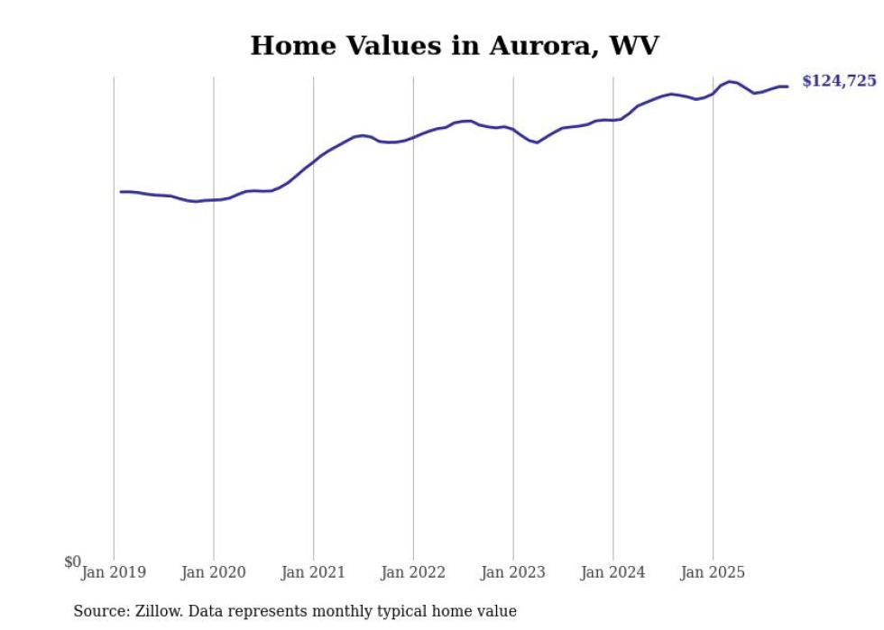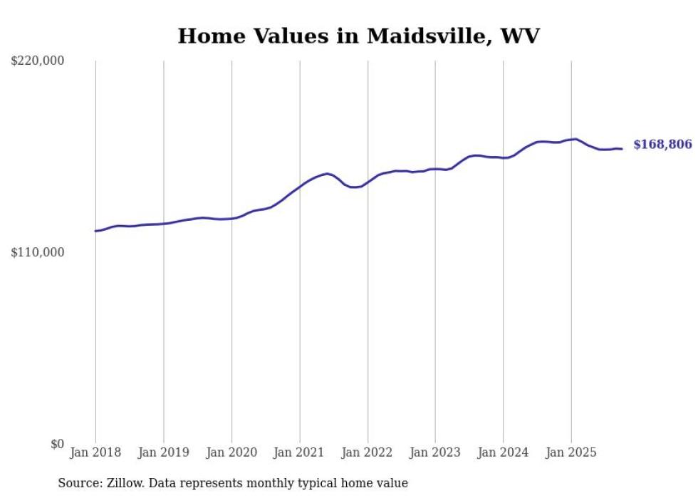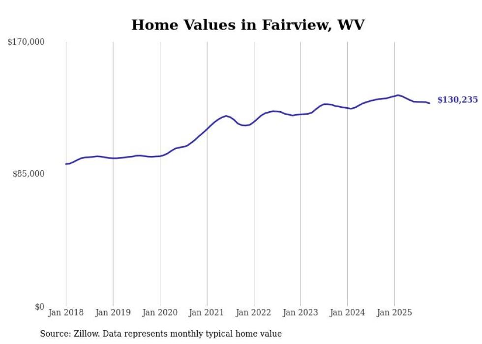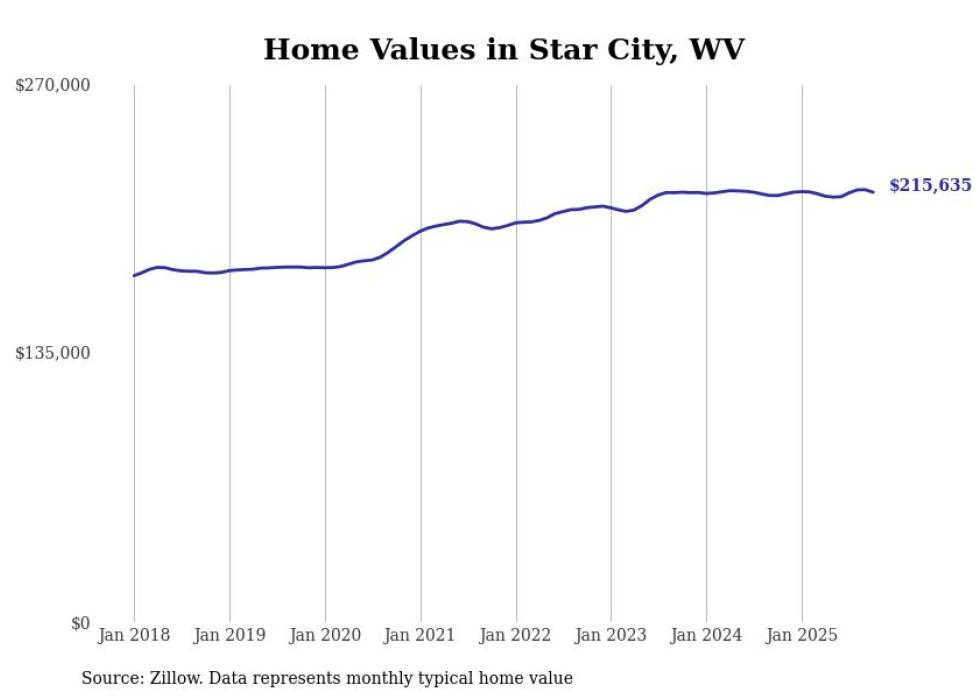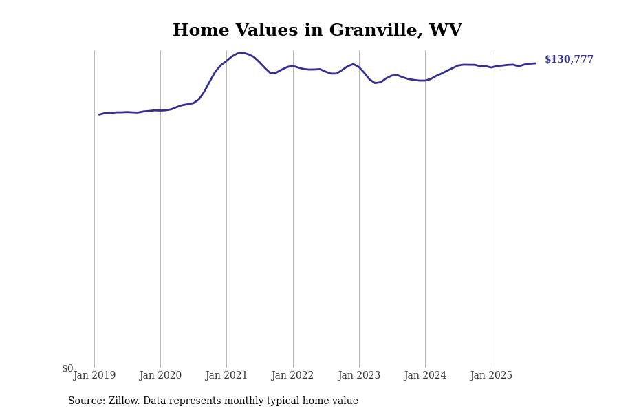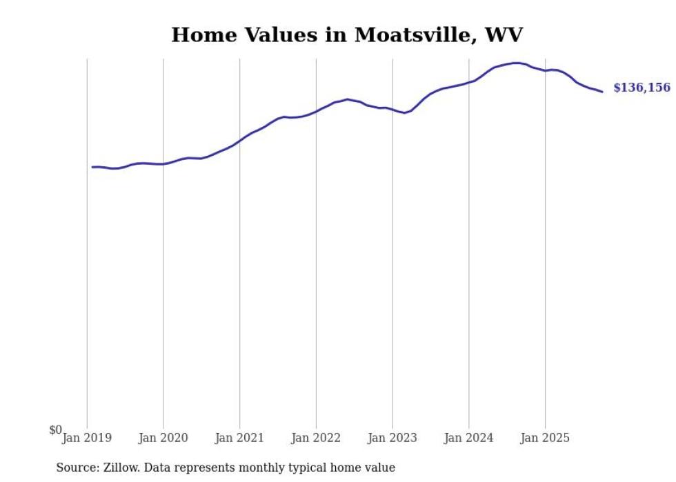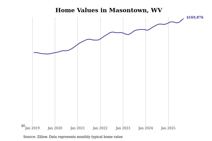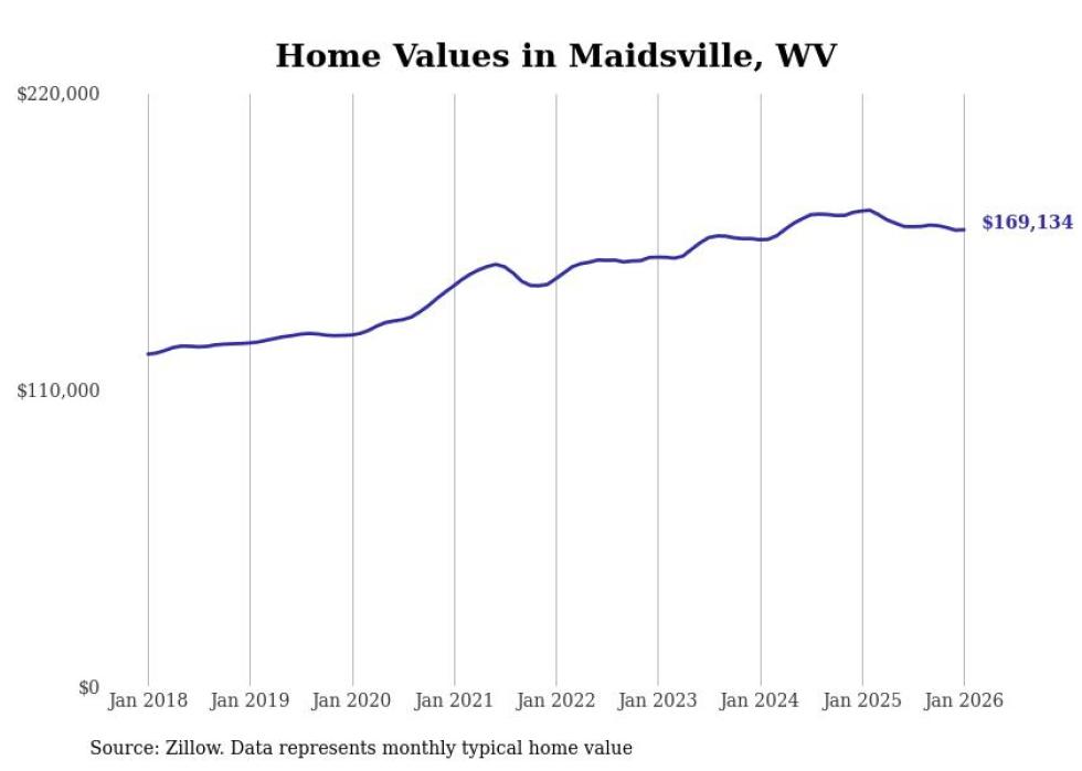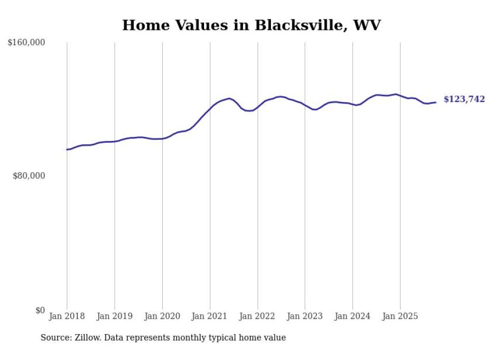 Stacker compiled a list of cities with the most expensive homes in the Morgantown metro area using data from Zillow. Charts show the monthly typical home value since January 2018. All 20 cities and towns with data available were included in the list.