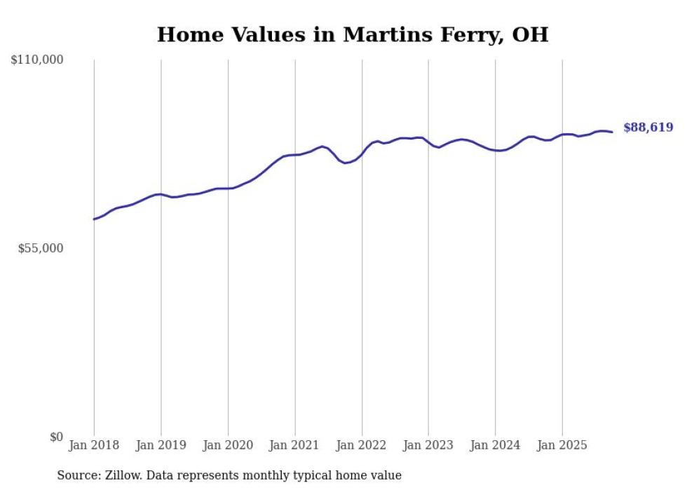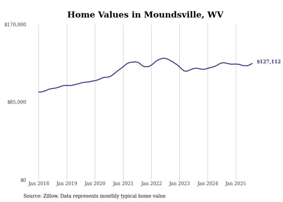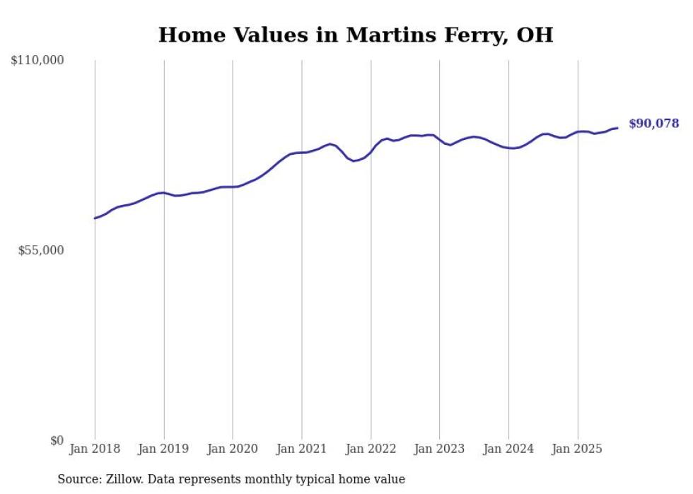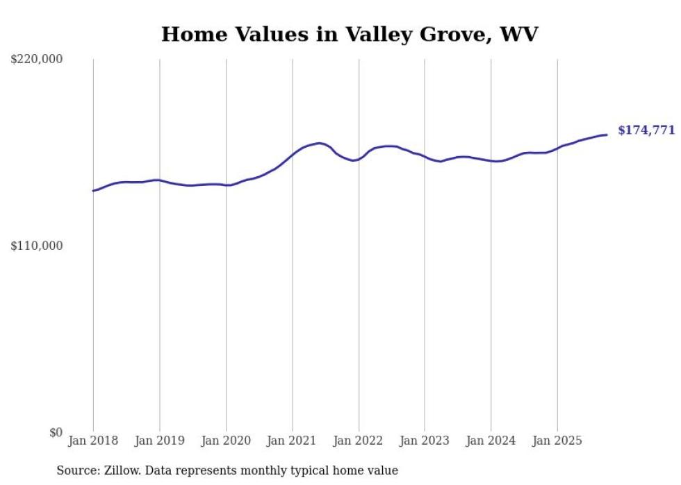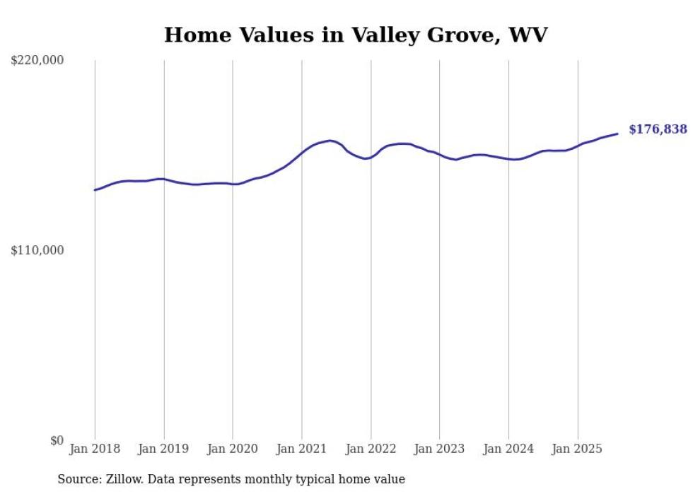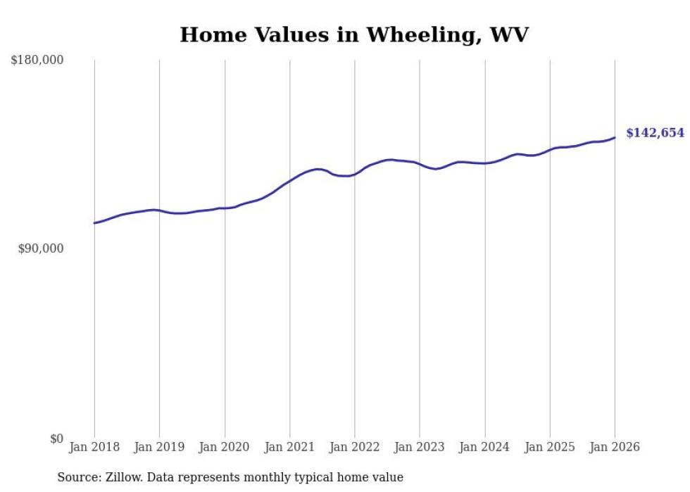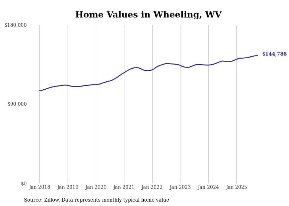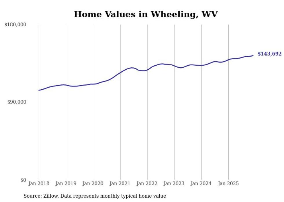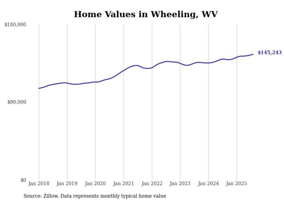 Stacker compiled a list of cities with the most expensive homes in the Wheeling, WV-OH metro area using data from Zillow. Charts show the monthly typical home value since January 2018.