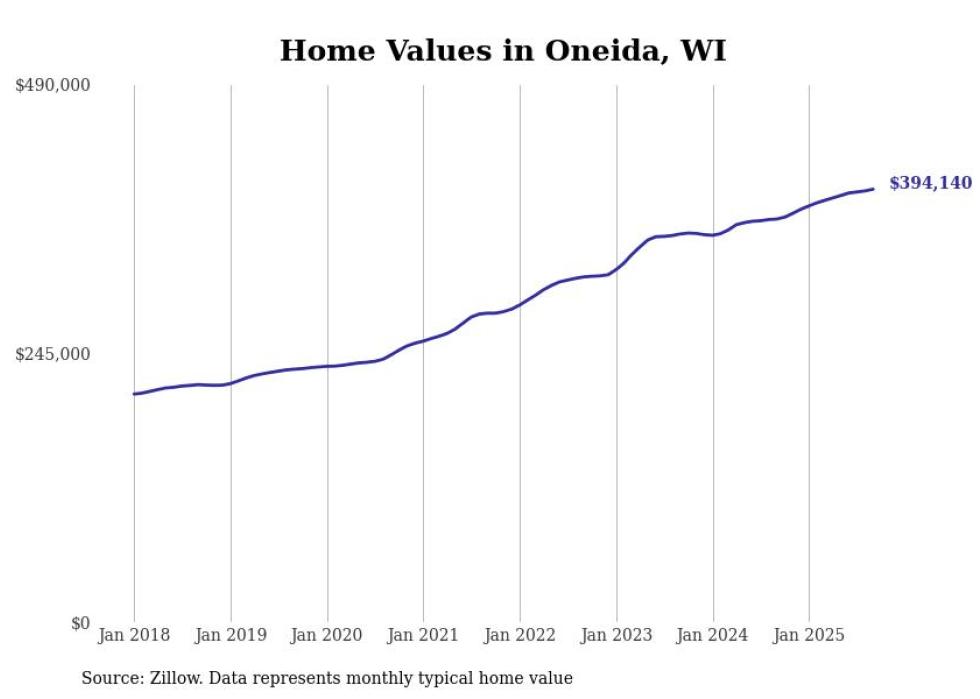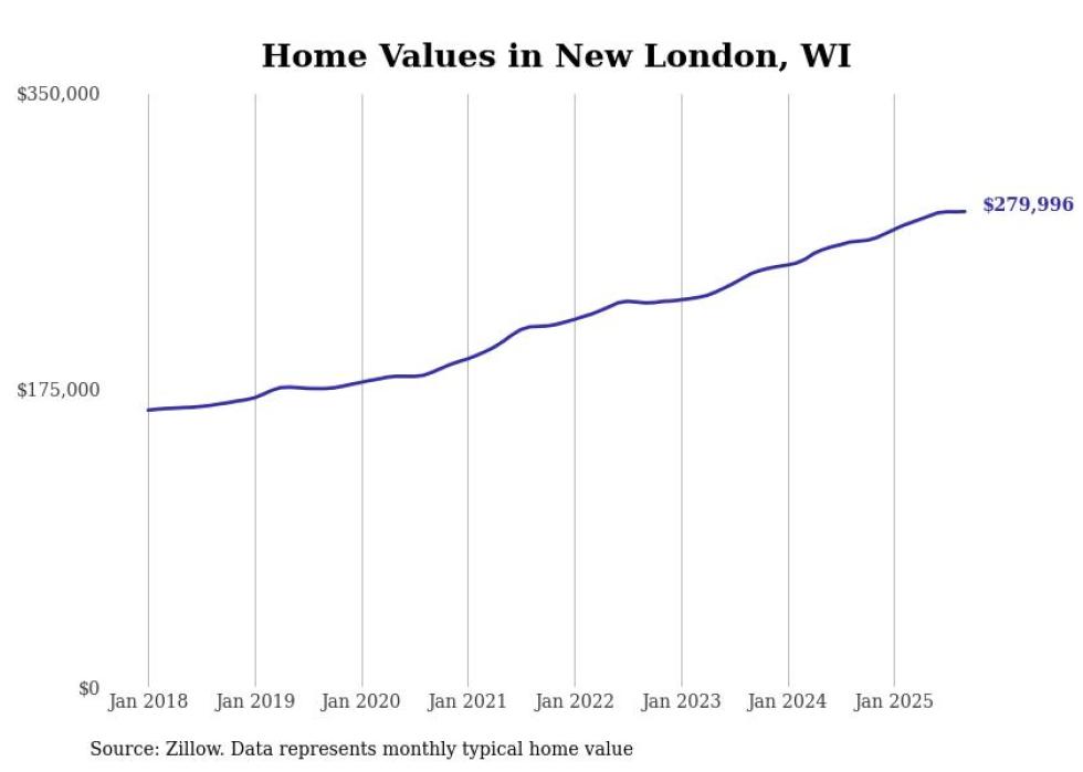 Stacker compiled a list of cities with the most expensive homes in the Appleton metro area using data from Zillow. Charts show the monthly typical home value since January 2018. All 23 cities and towns with data available were included in the list.