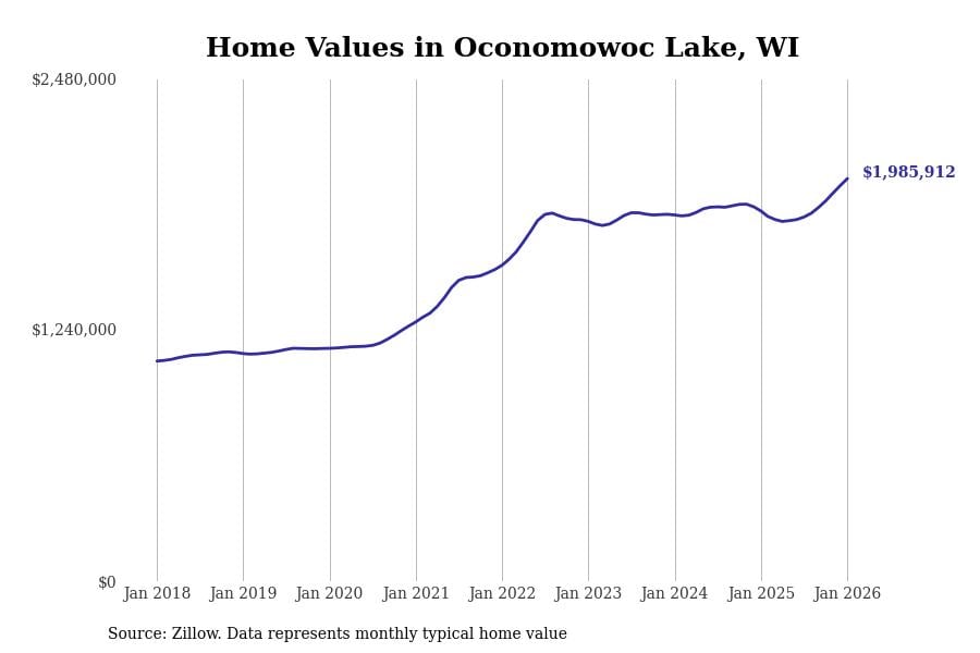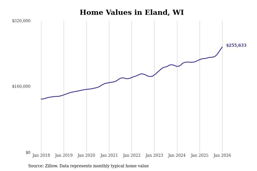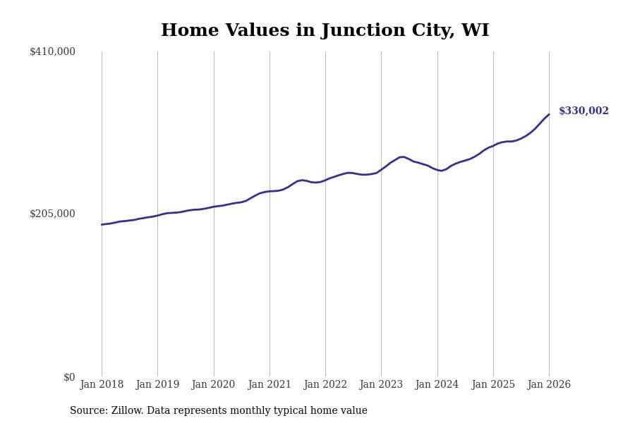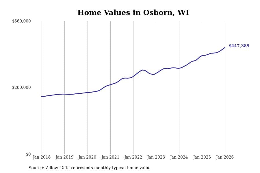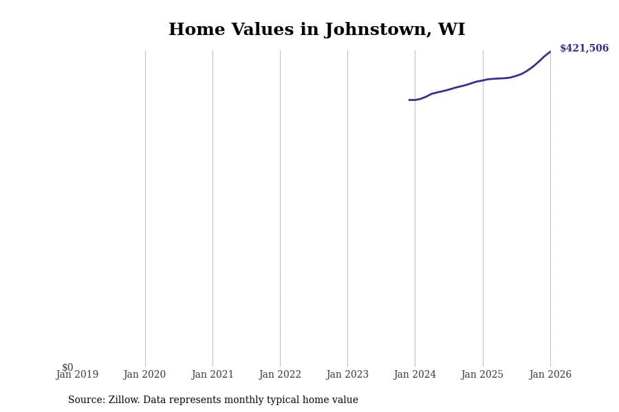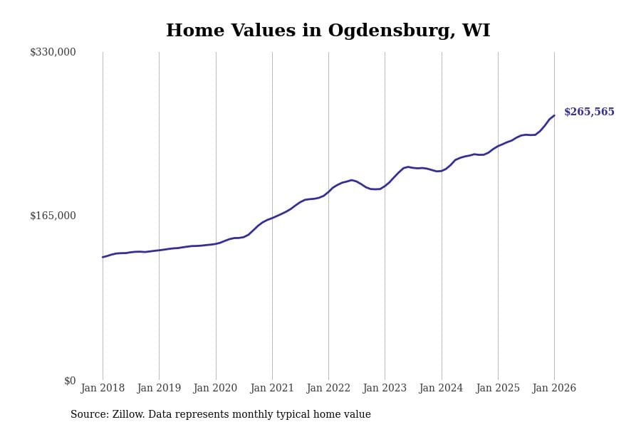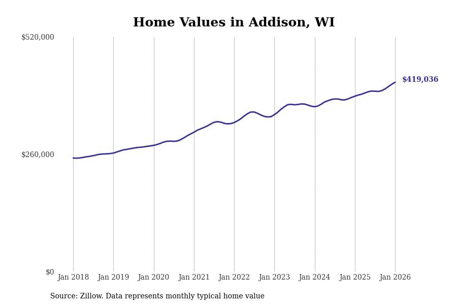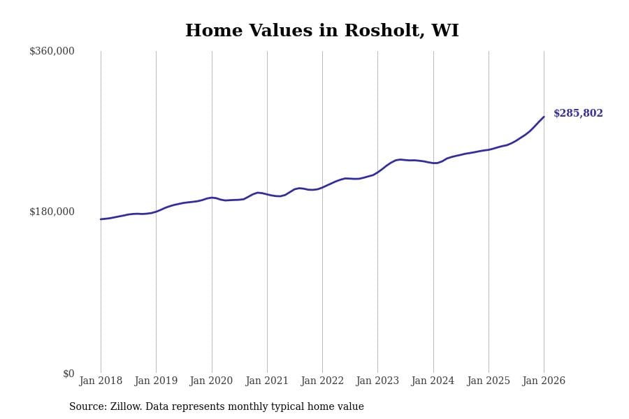 Stacker compiled a list of cities with the fastest-growing home prices in Wisconsin using data from Zillow. Cities are ranked by the dollar change in the Zillow Home Values Index for all homes from the 12 months ending January 2026. The charts in this story were created automatically using Matplotlib. Data was available for 50 cities and towns in Wisconsin.