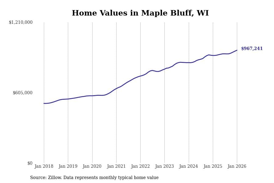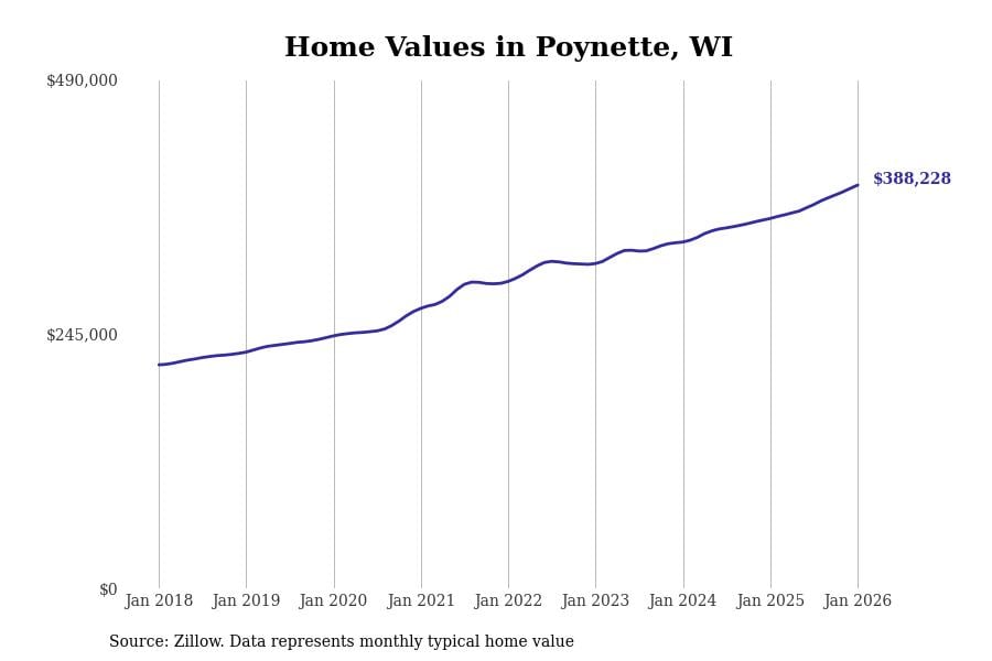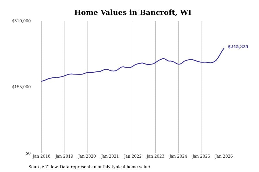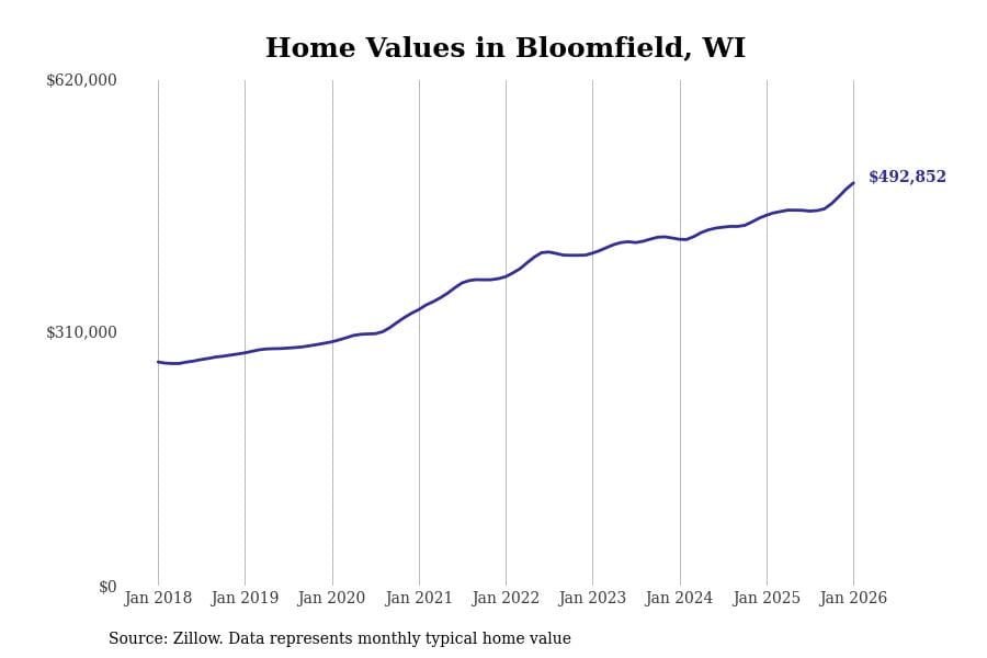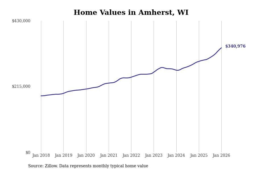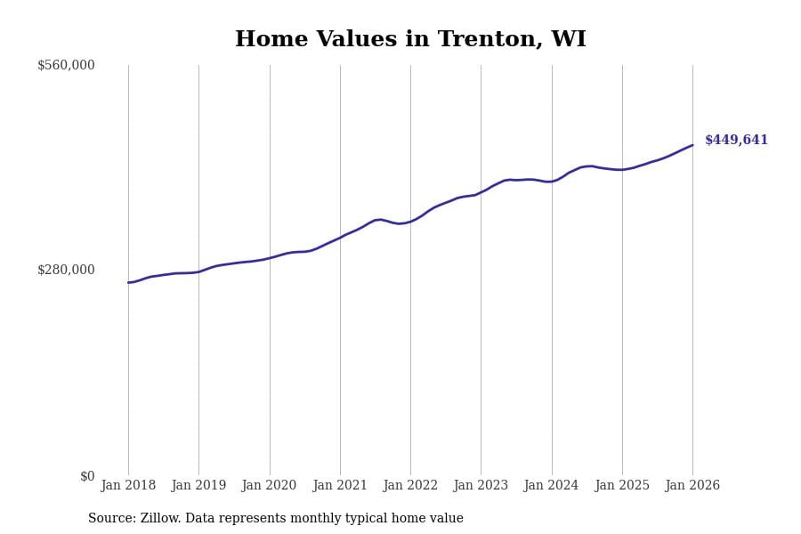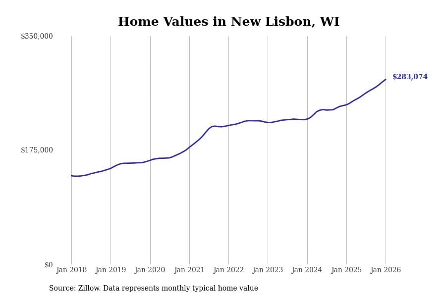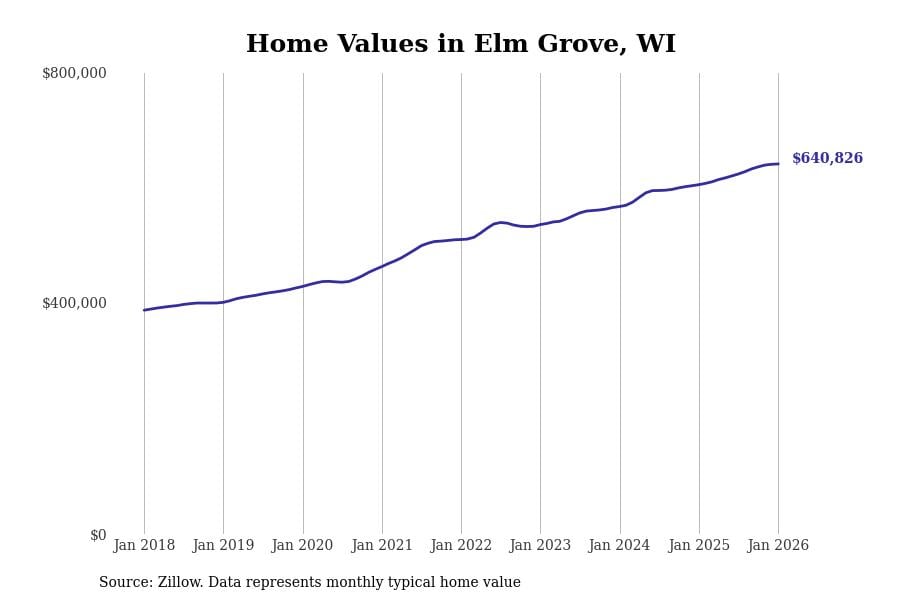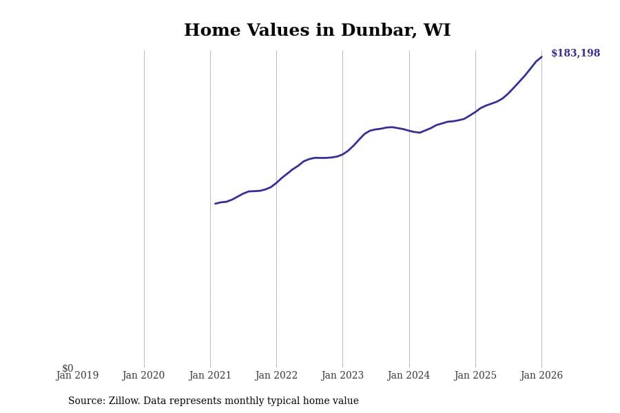 Stacker compiled a list of cities with the fastest-growing home prices in Wisconsin using data from Zillow. Cities are ranked by the dollar change in the Zillow Home Values Index for all homes from the 12 months ending January 2026. The charts in this story were created automatically using Matplotlib. Data was available for 50 cities and towns in Wisconsin.