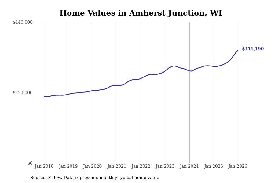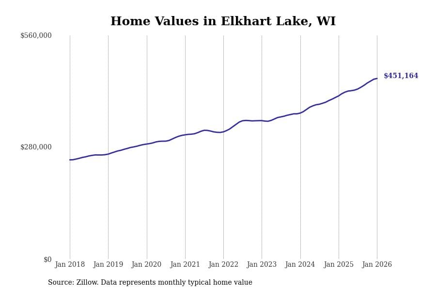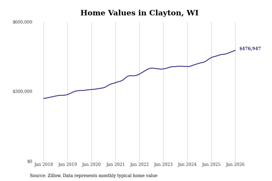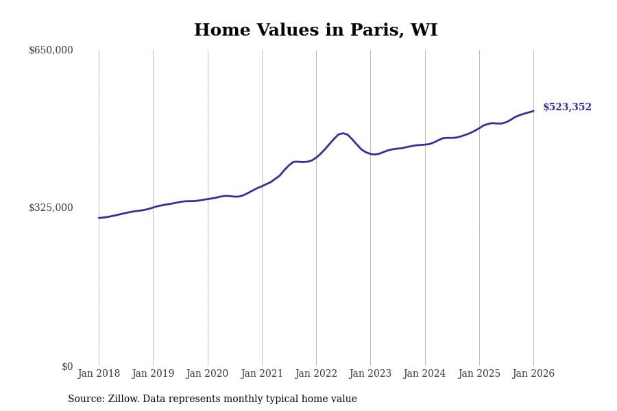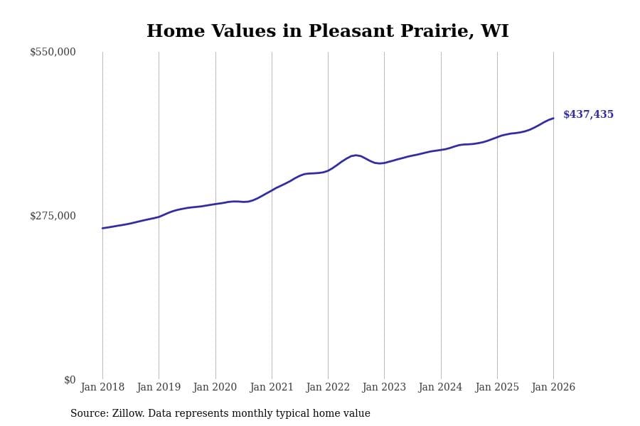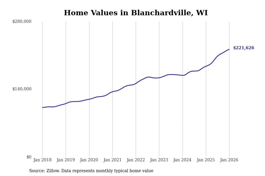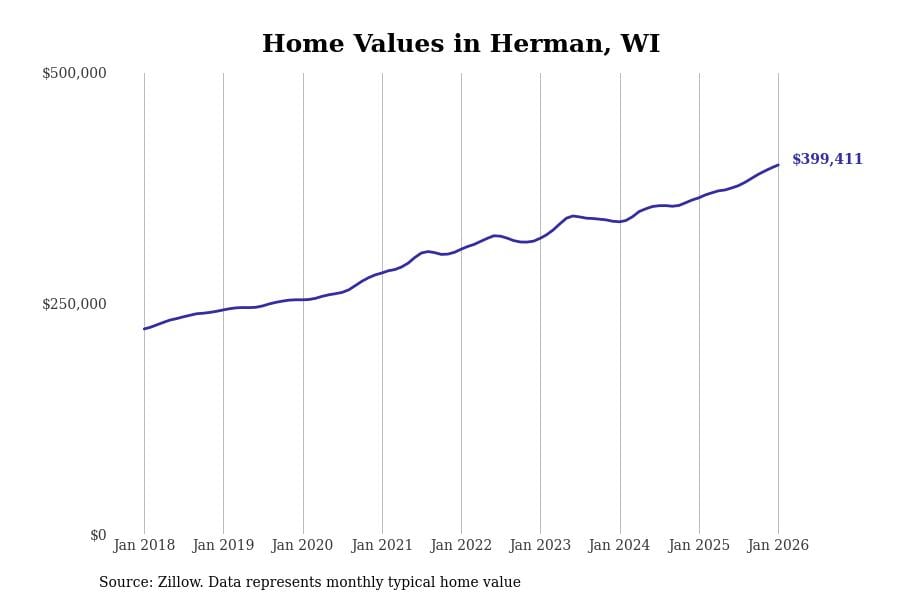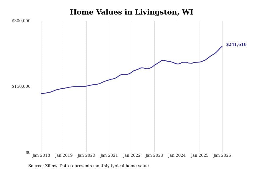 Stacker compiled a list of cities with the fastest-growing home prices in Wisconsin using data from Zillow. Cities are ranked by the dollar change in the Zillow Home Values Index for all homes from the 12 months ending January 2026. The charts in this story were created automatically using Matplotlib. Data was available for 50 cities and towns in Wisconsin.