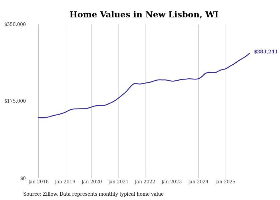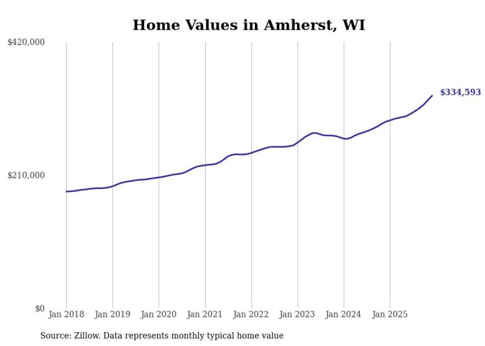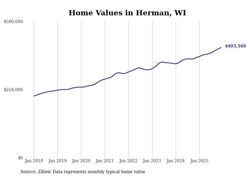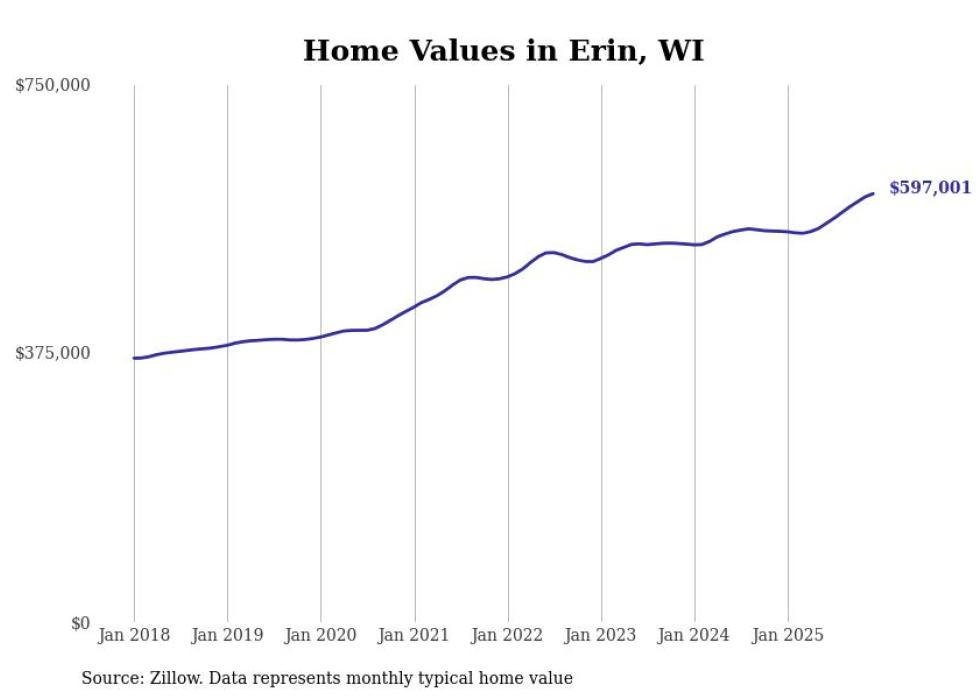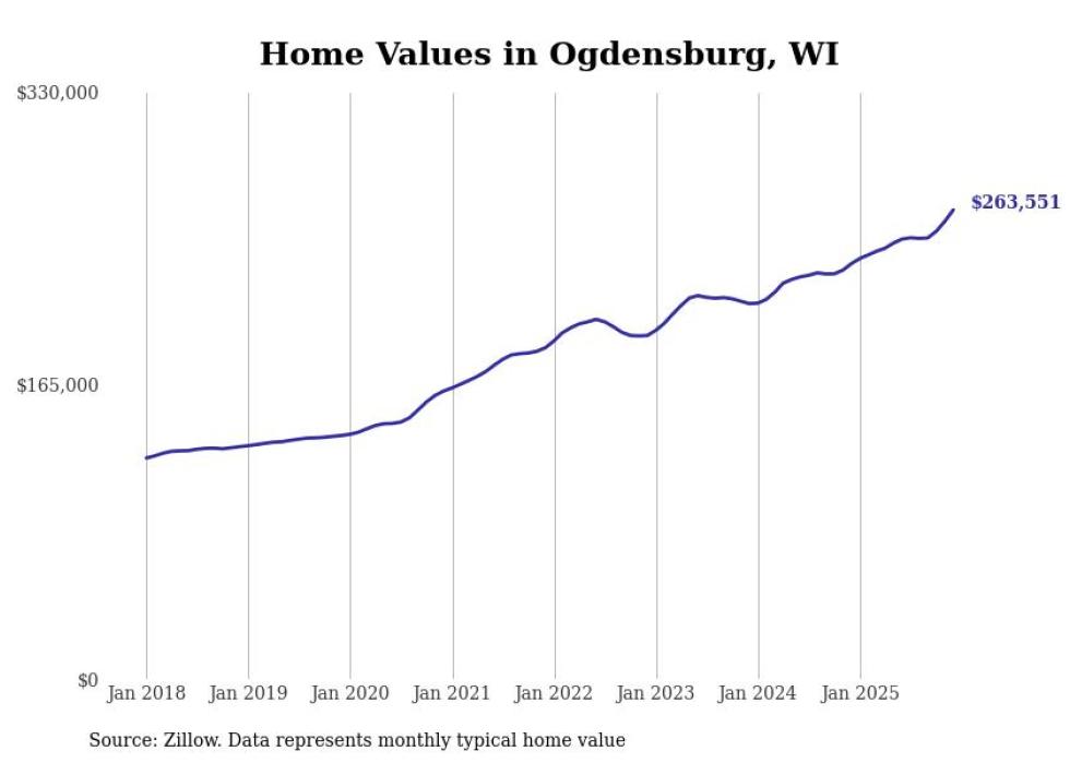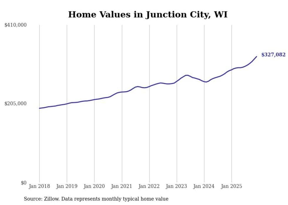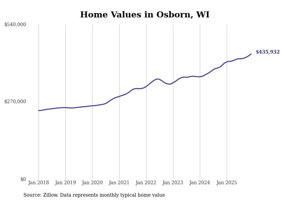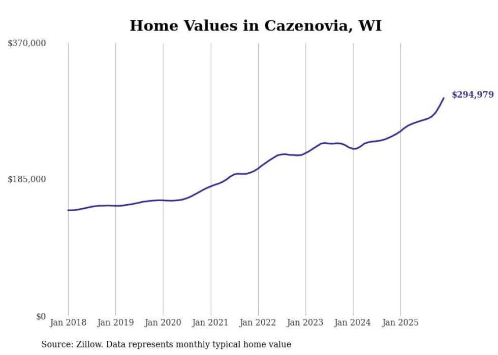 Stacker compiled a list of cities with the fastest-growing home prices in Wisconsin using data from Zillow. Cities are ranked by the dollar change in the Zillow Home Values Index for all homes from the 12 months ending December 2025. The charts in this story were created automatically using Matplotlib. Data was available for 50 cities and towns in Wisconsin.