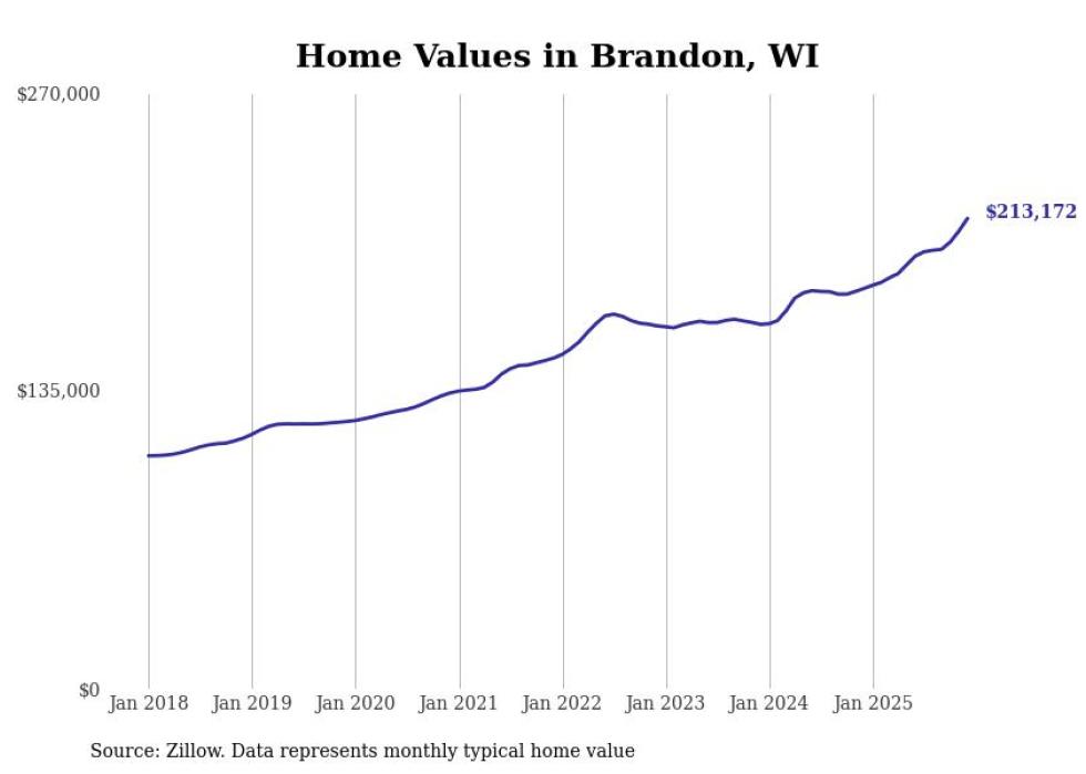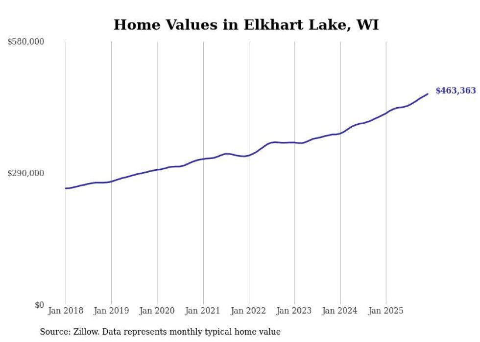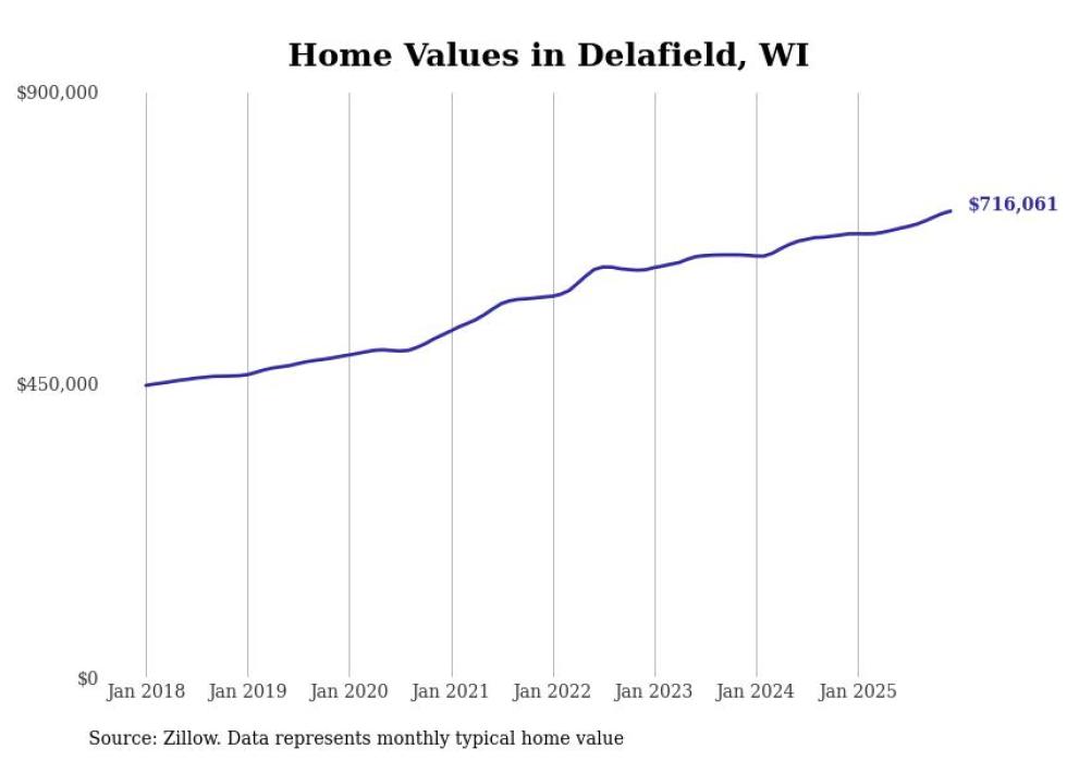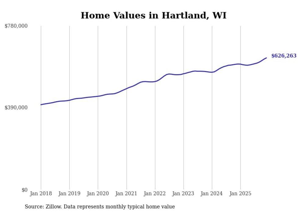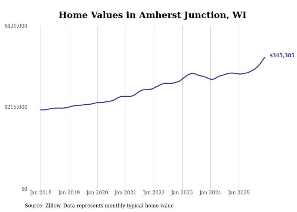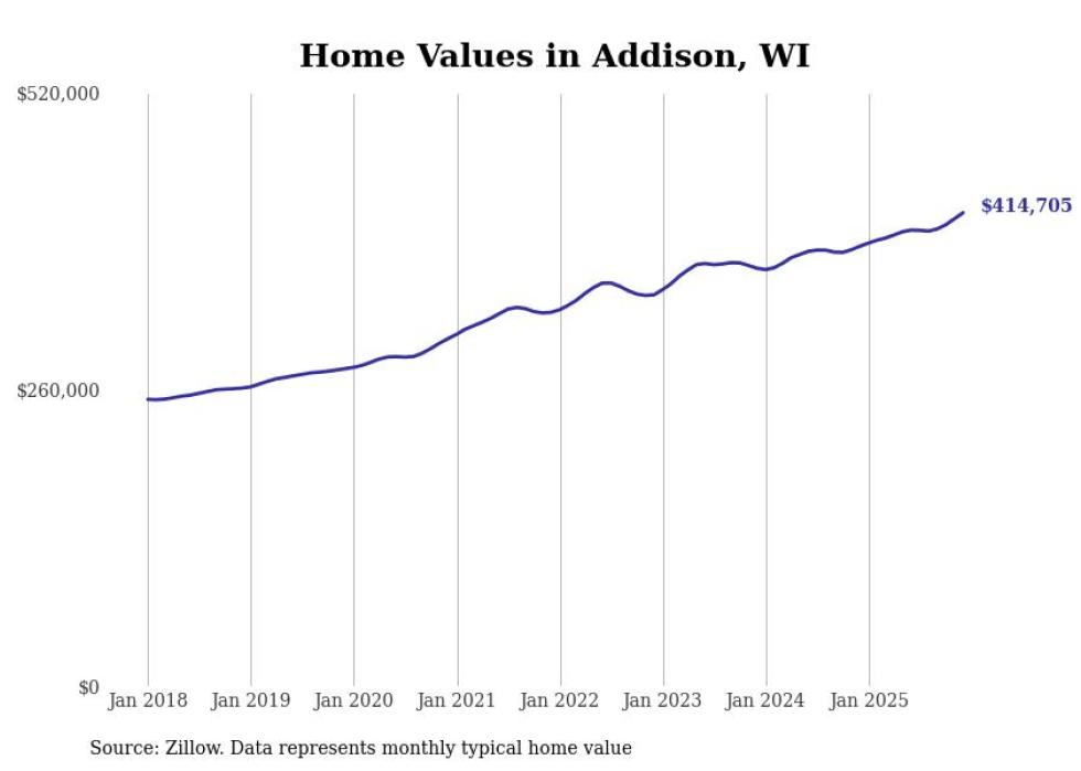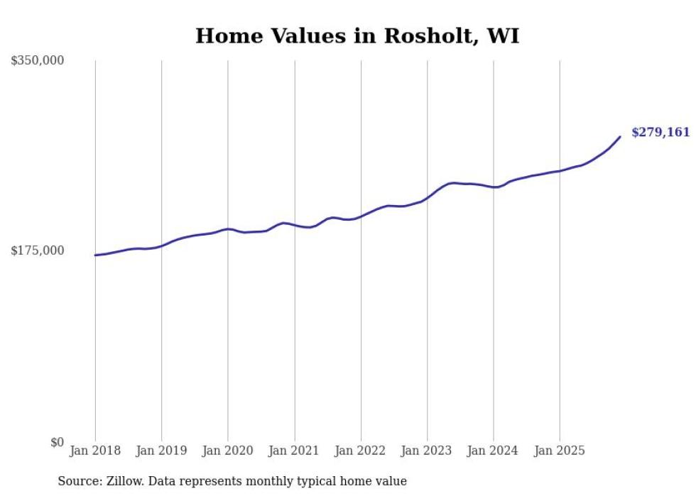 Stacker compiled a list of cities with the fastest-growing home prices in Wisconsin using data from Zillow. Cities are ranked by the dollar change in the Zillow Home Values Index for all homes from the 12 months ending December 2025. The charts in this story were created automatically using Matplotlib. Data was available for 50 cities and towns in Wisconsin.