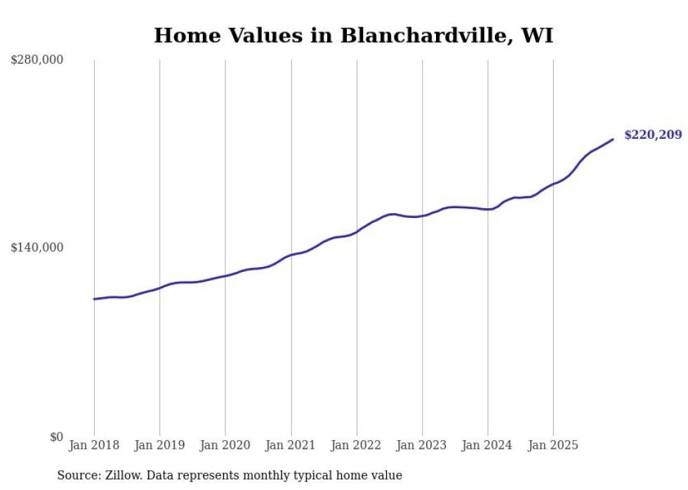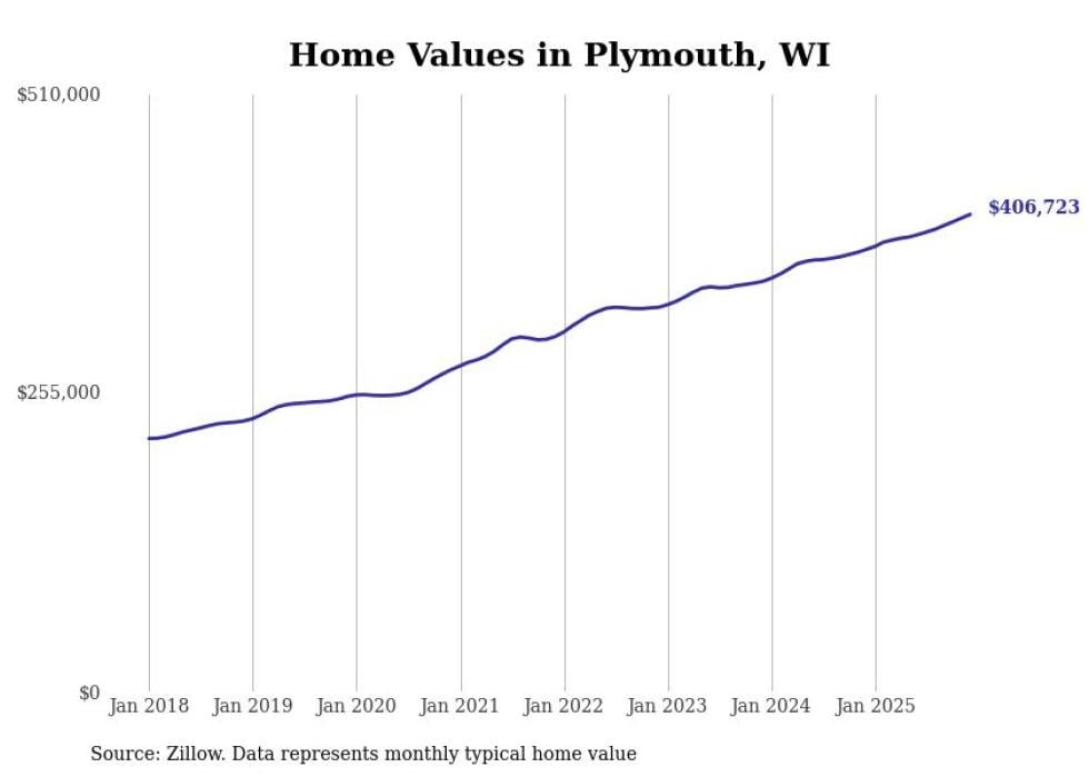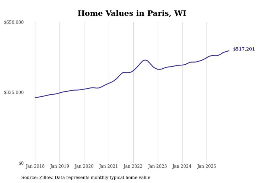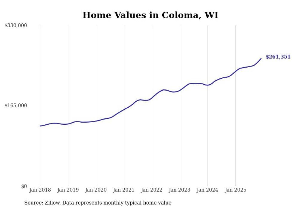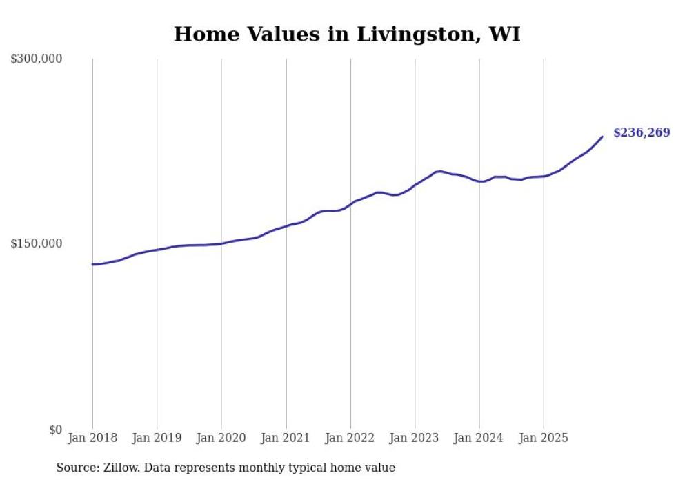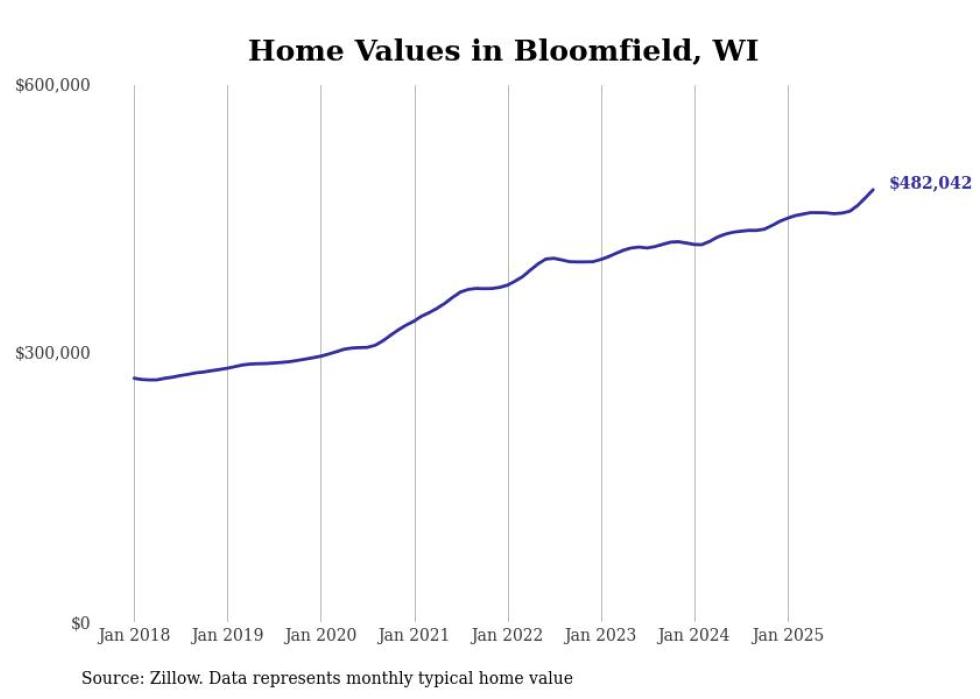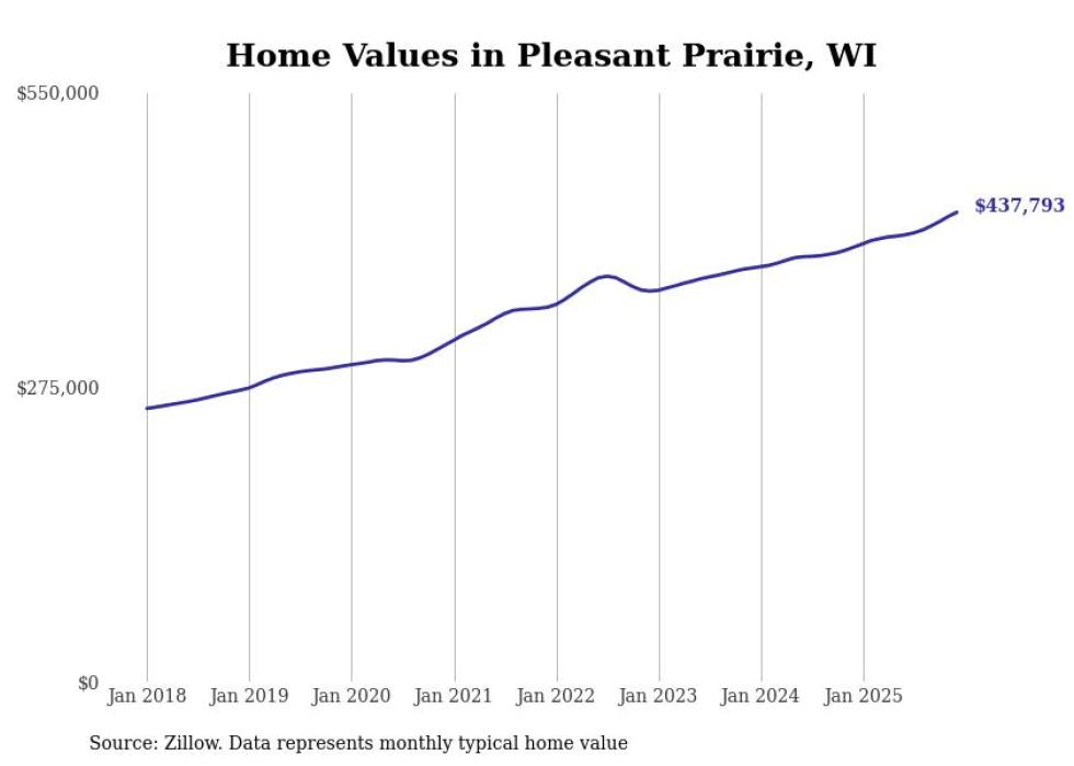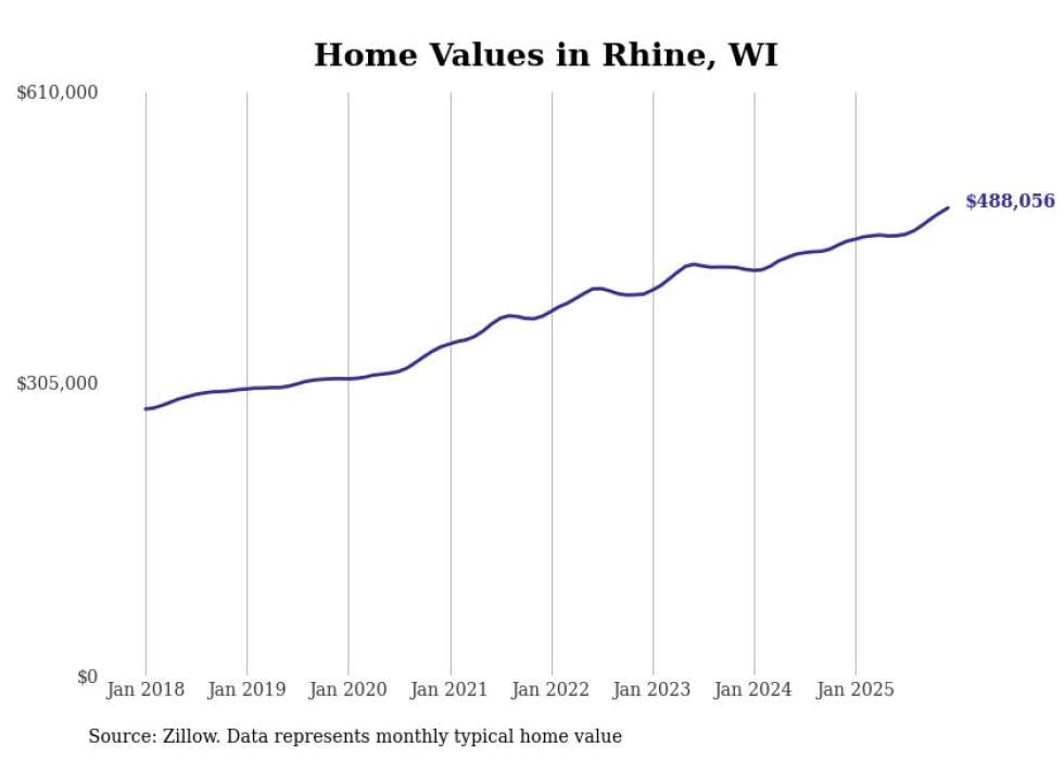 Stacker compiled a list of cities with the fastest-growing home prices in Wisconsin using data from Zillow. Cities are ranked by the dollar change in the Zillow Home Values Index for all homes from the 12 months ending December 2025. The charts in this story were created automatically using Matplotlib. Data was available for 50 cities and towns in Wisconsin.