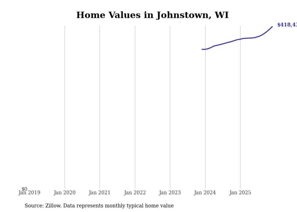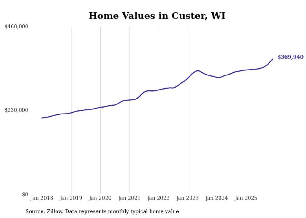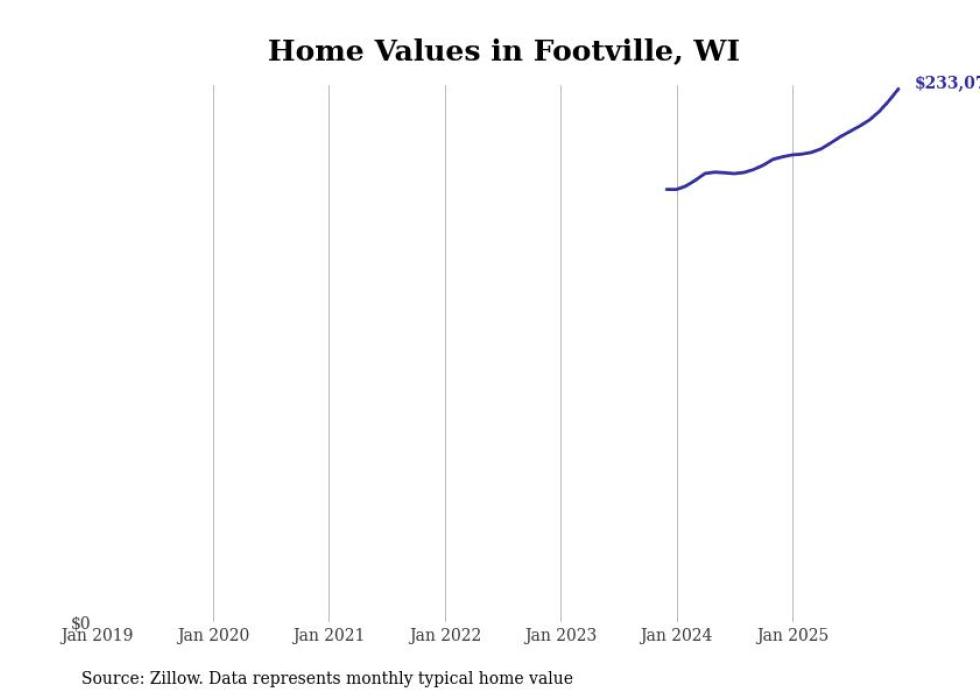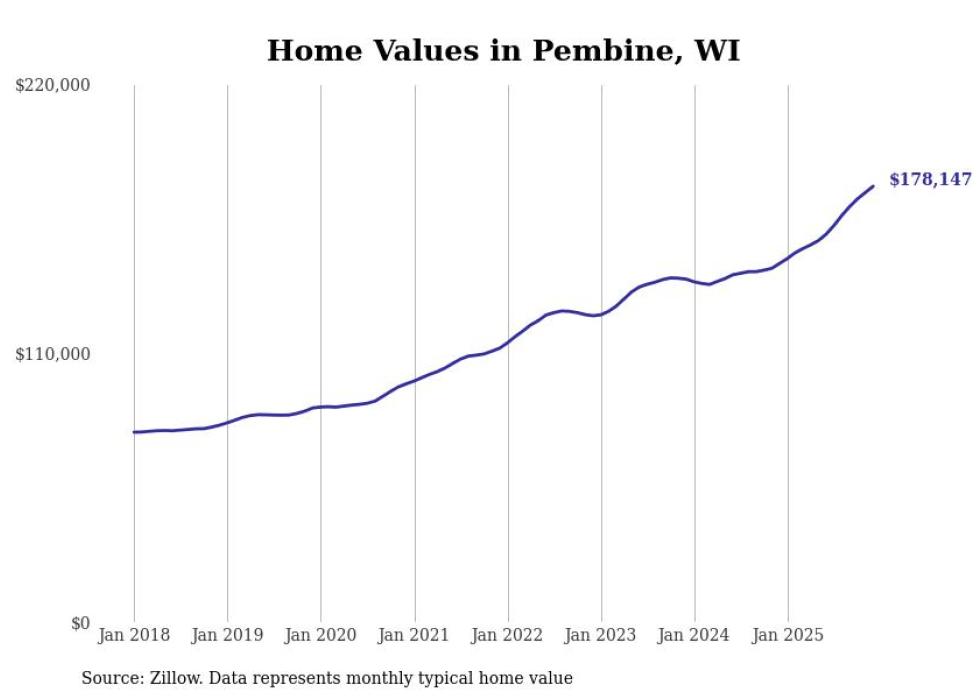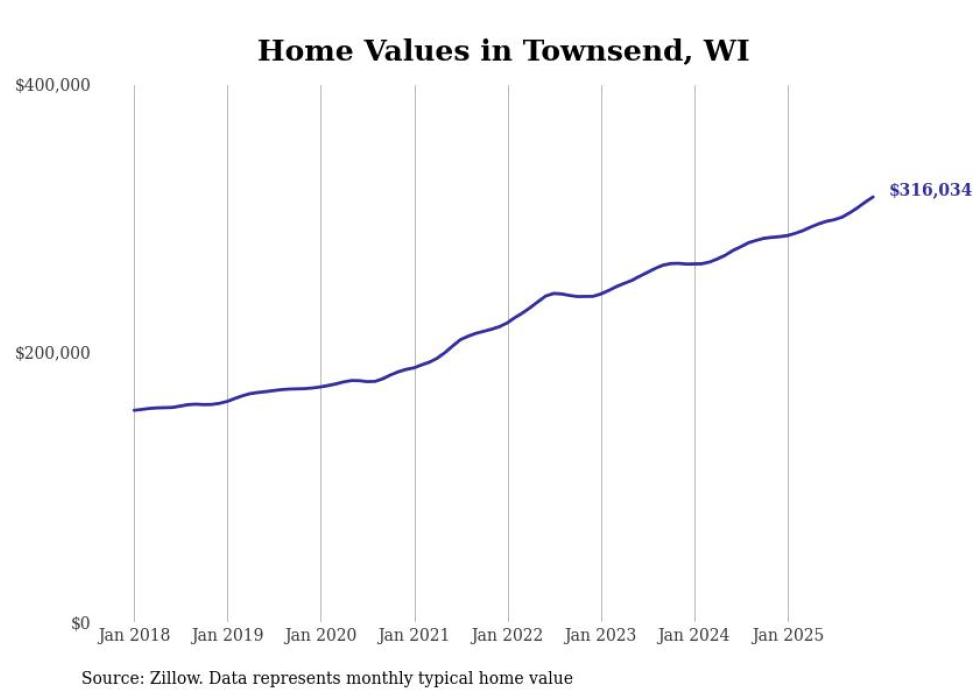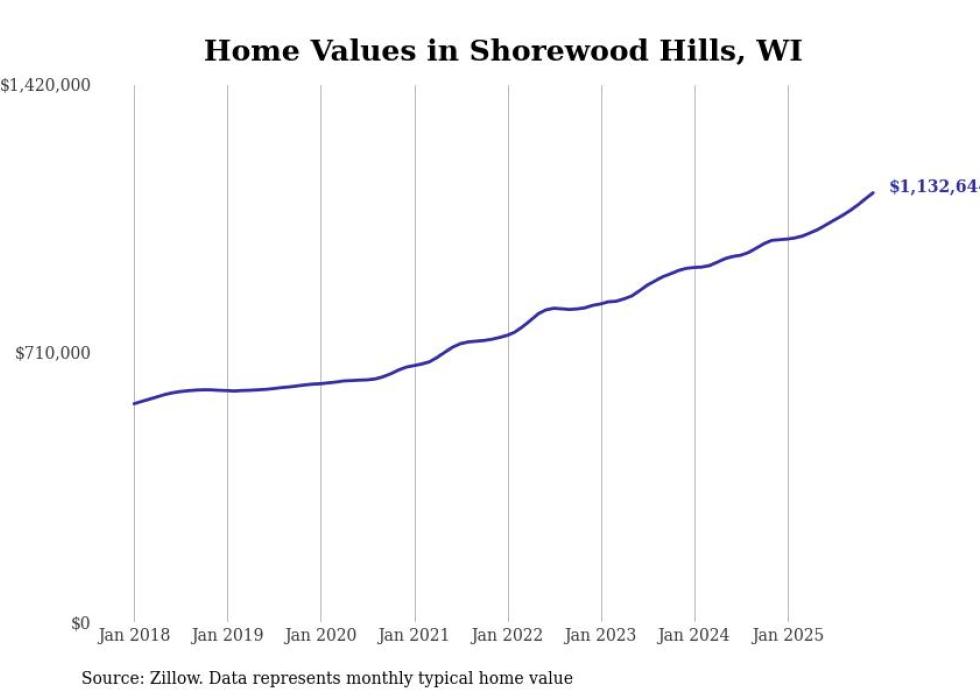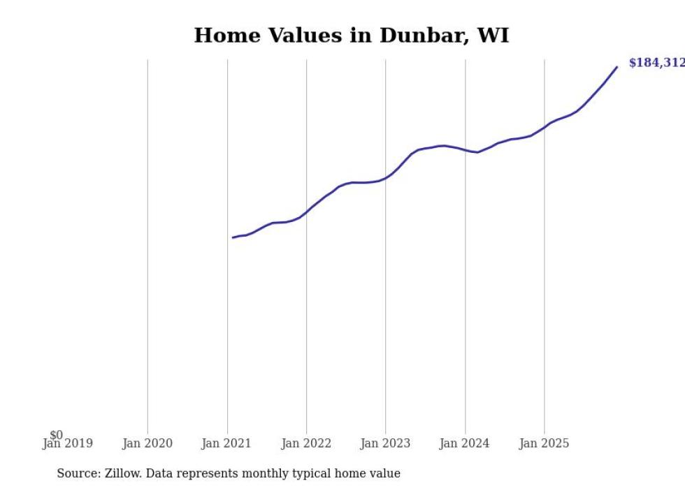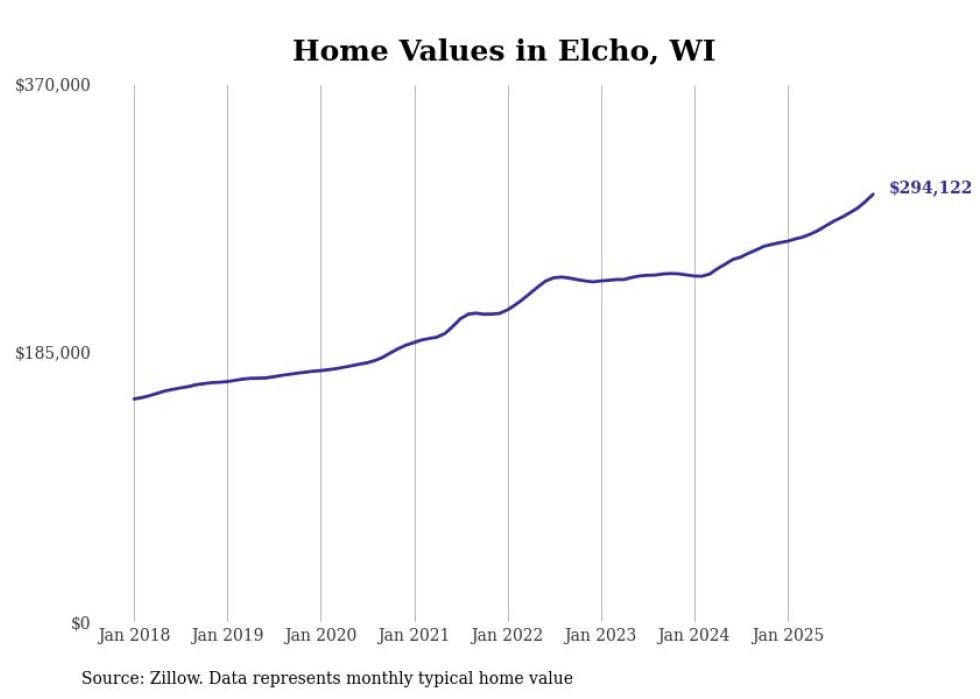 Stacker compiled a list of cities with the fastest-growing home prices in Wisconsin using data from Zillow. Cities are ranked by the dollar change in the Zillow Home Values Index for all homes from the 12 months ending December 2025. The charts in this story were created automatically using Matplotlib. Data was available for 50 cities and towns in Wisconsin.