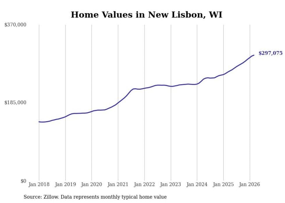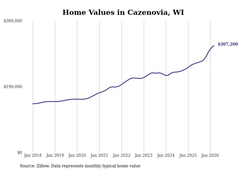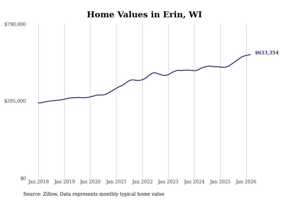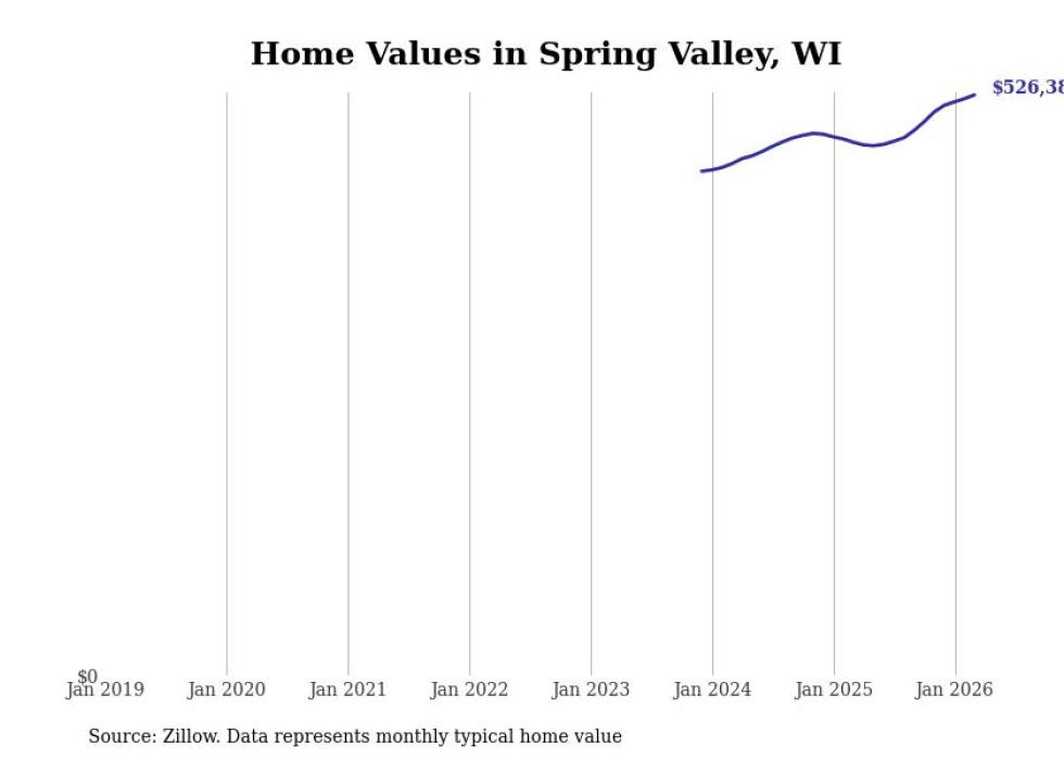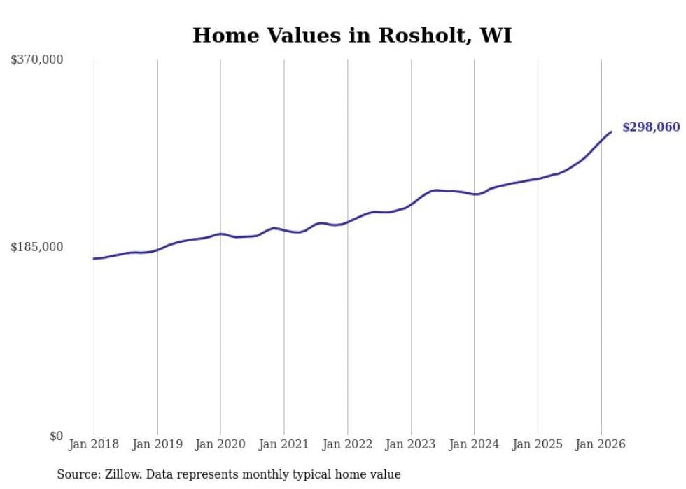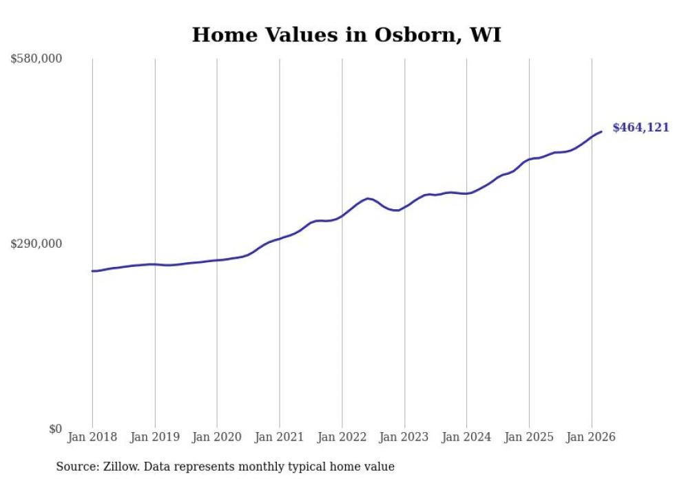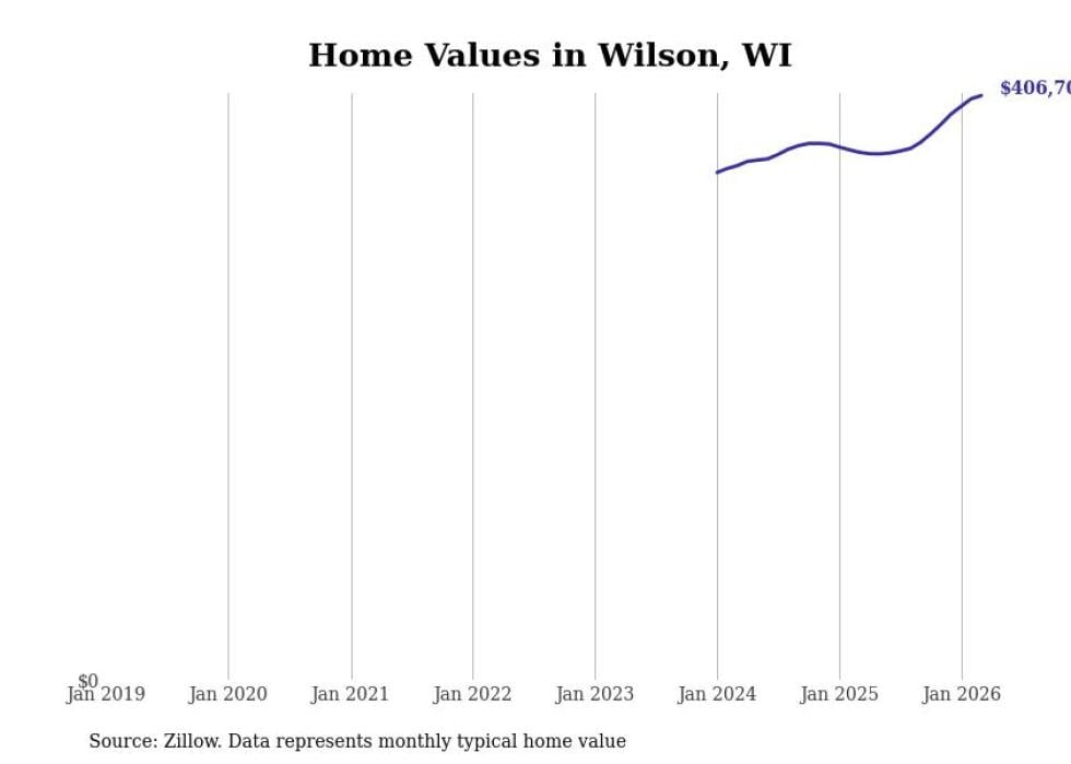 Stacker compiled a list of cities with the fastest-growing home prices in Wisconsin using data from Zillow. Cities are ranked by the dollar change in the Zillow Home Values Index for all homes from the 12 months ending March 2026. The charts in this story were created automatically using Matplotlib. Data was available for 50 cities and towns in Wisconsin.