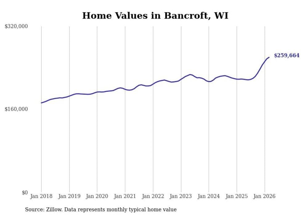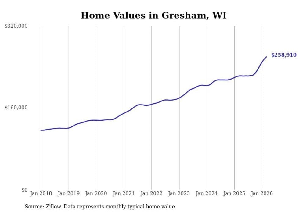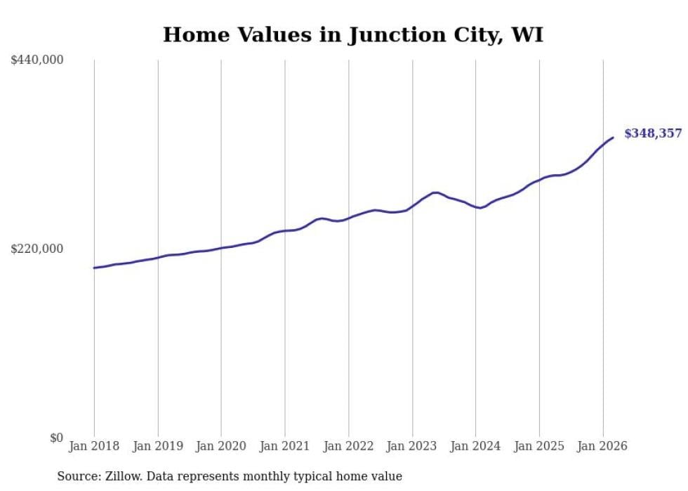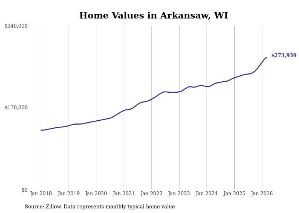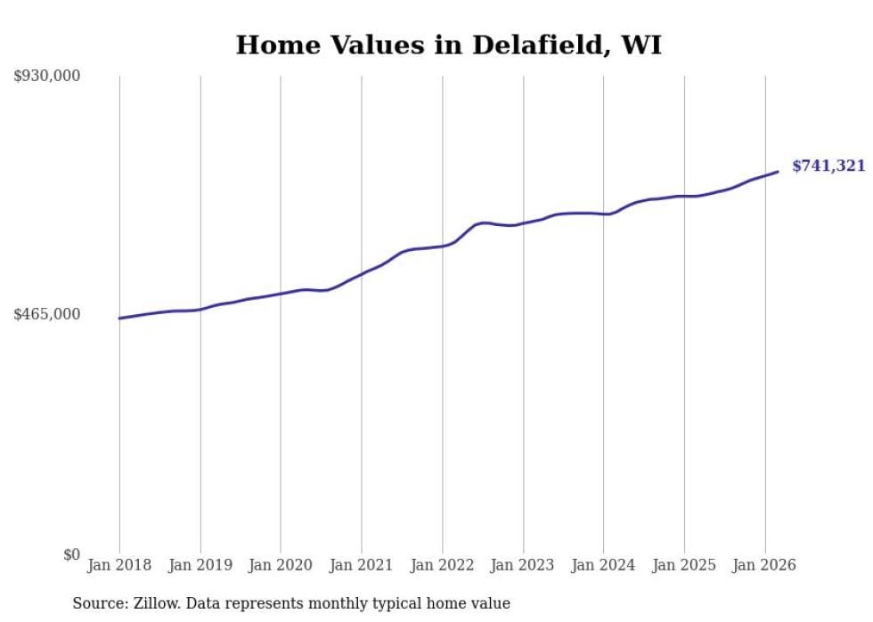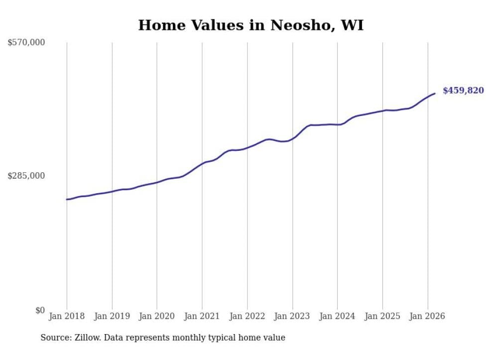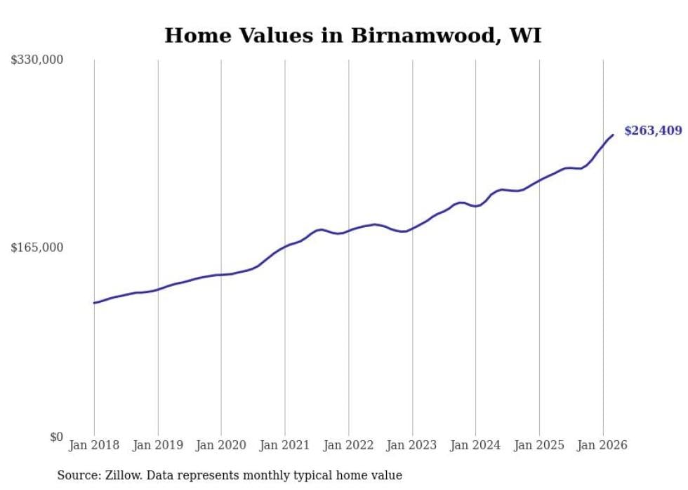 Stacker compiled a list of cities with the fastest-growing home prices in Wisconsin using data from Zillow. Cities are ranked by the dollar change in the Zillow Home Values Index for all homes from the 12 months ending March 2026. The charts in this story were created automatically using Matplotlib. Data was available for 50 cities and towns in Wisconsin.