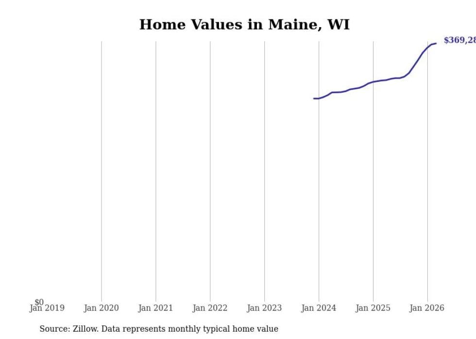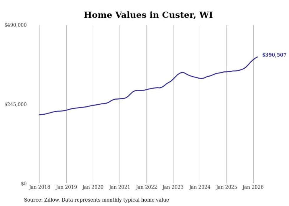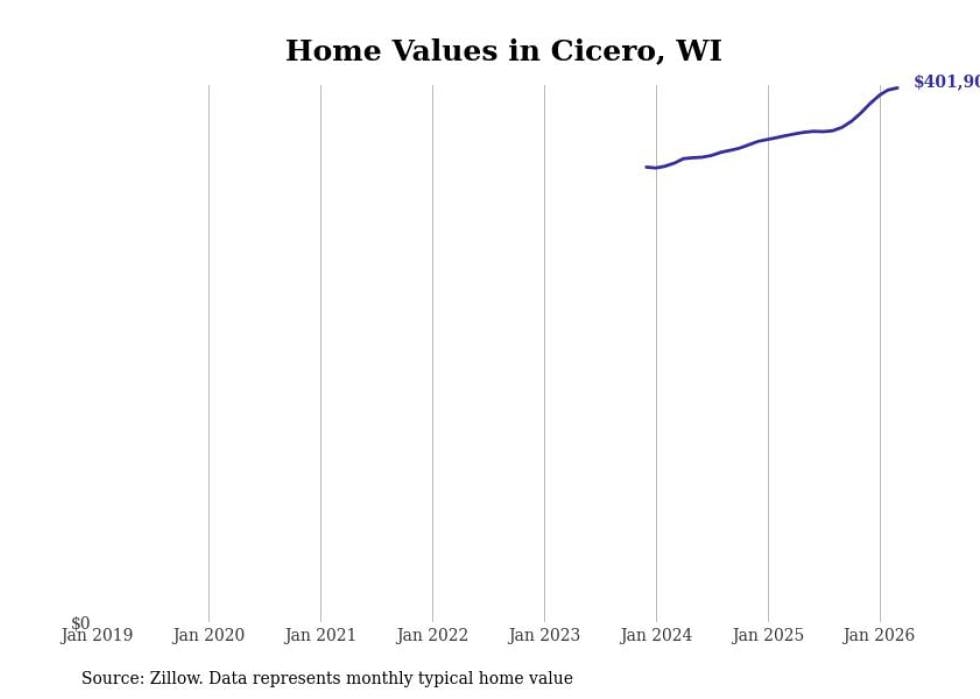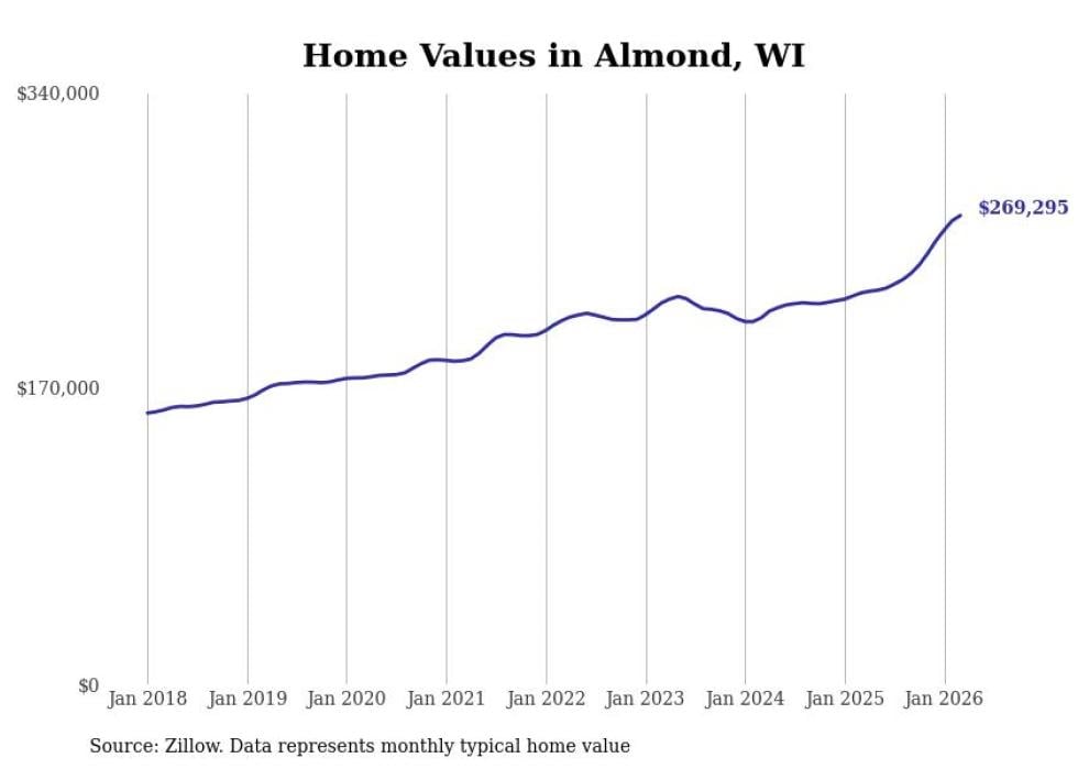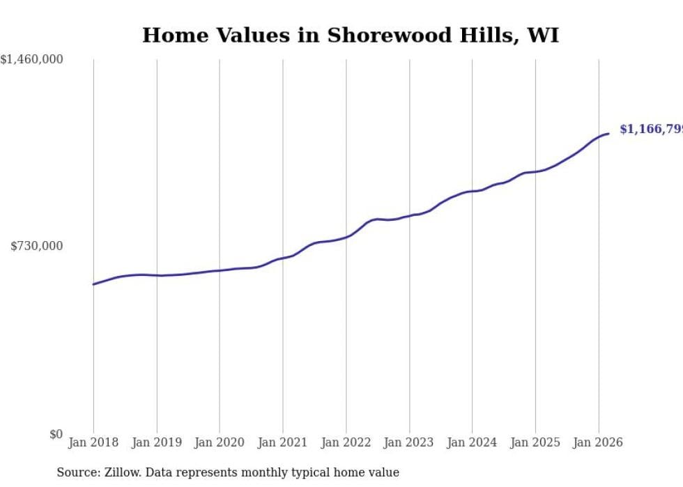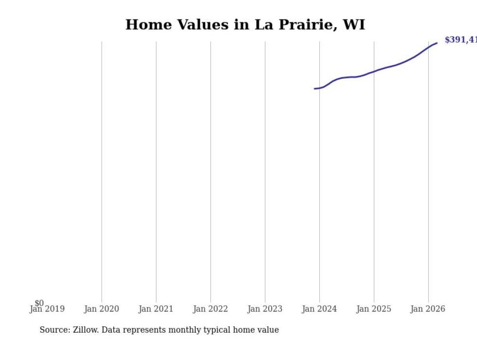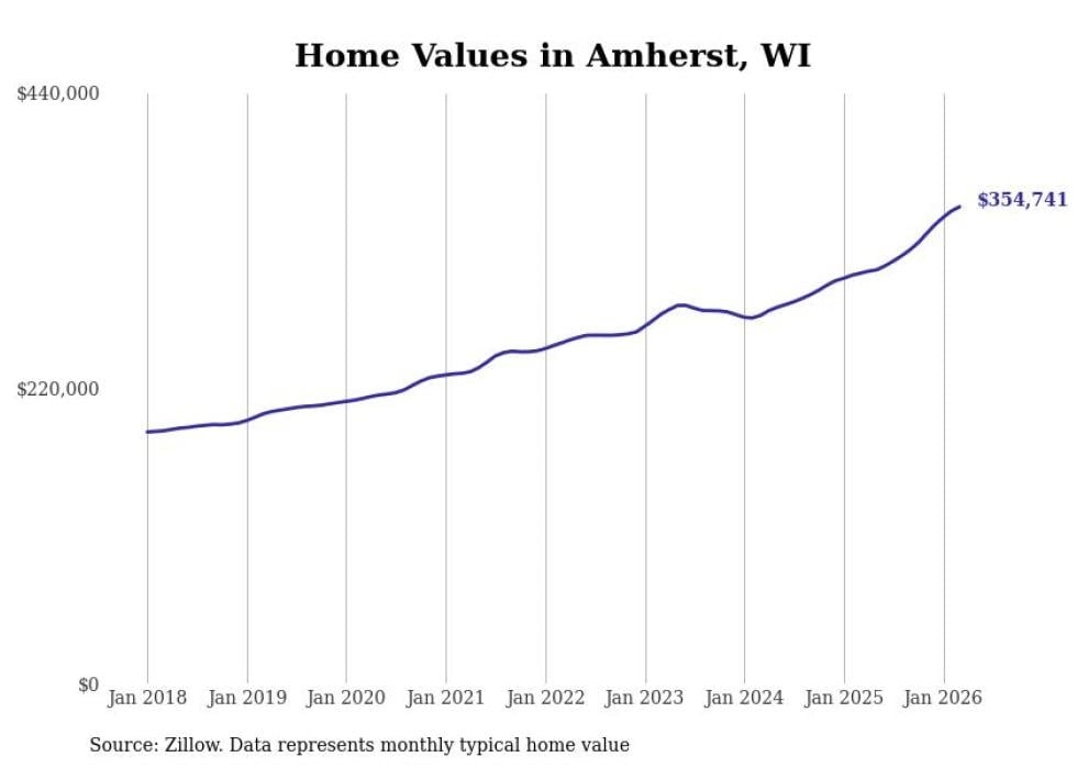 Stacker compiled a list of cities with the fastest-growing home prices in Wisconsin using data from Zillow. Cities are ranked by the dollar change in the Zillow Home Values Index for all homes from the 12 months ending March 2026. The charts in this story were created automatically using Matplotlib. Data was available for 50 cities and towns in Wisconsin.