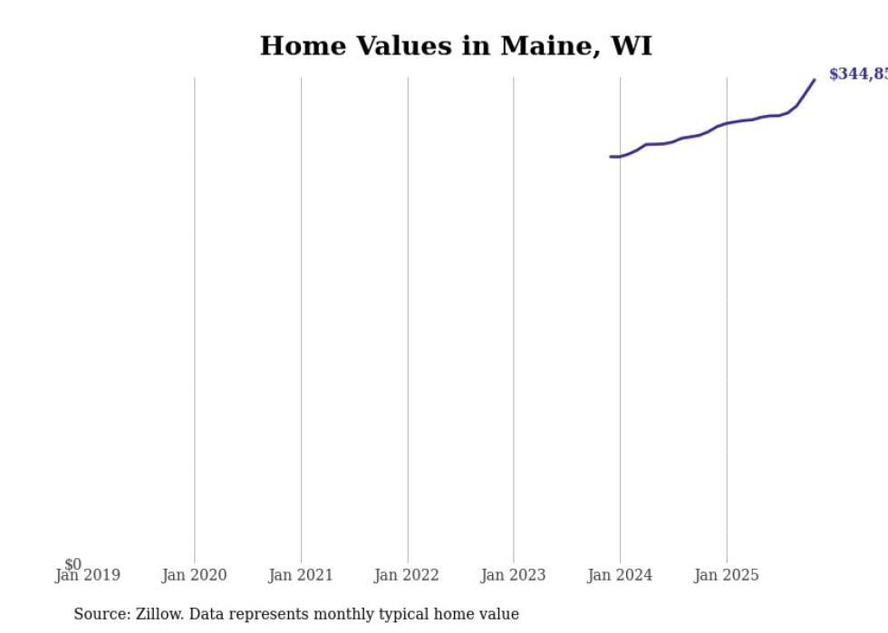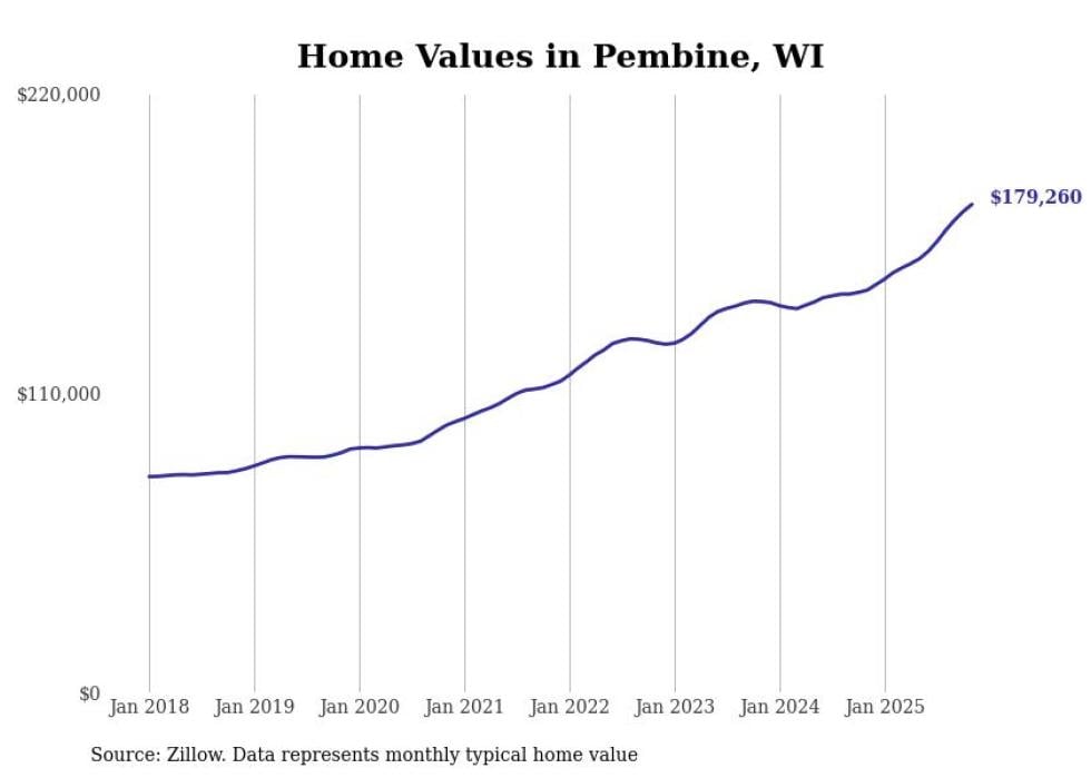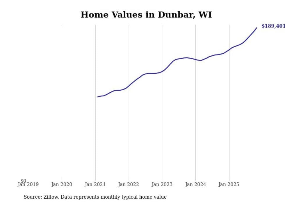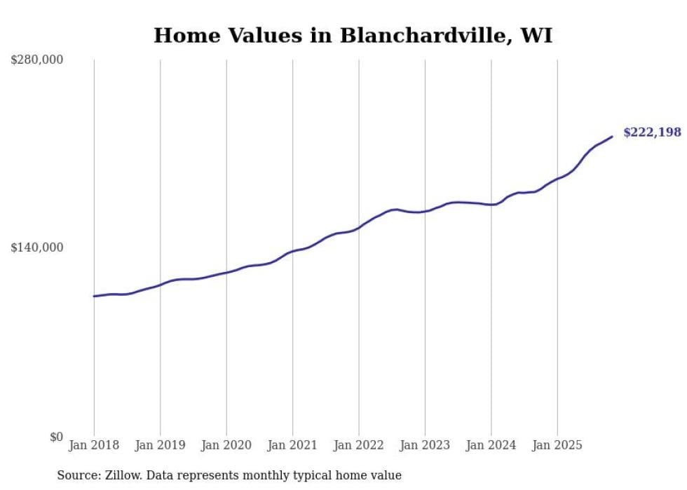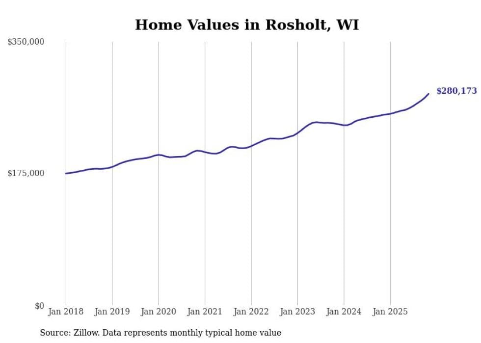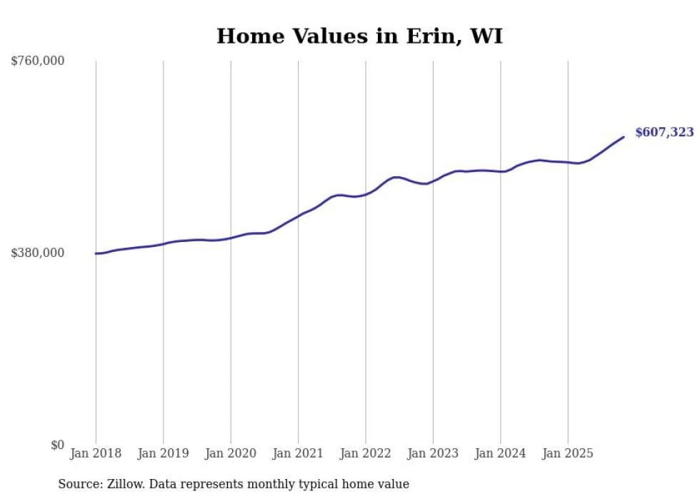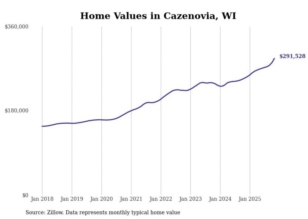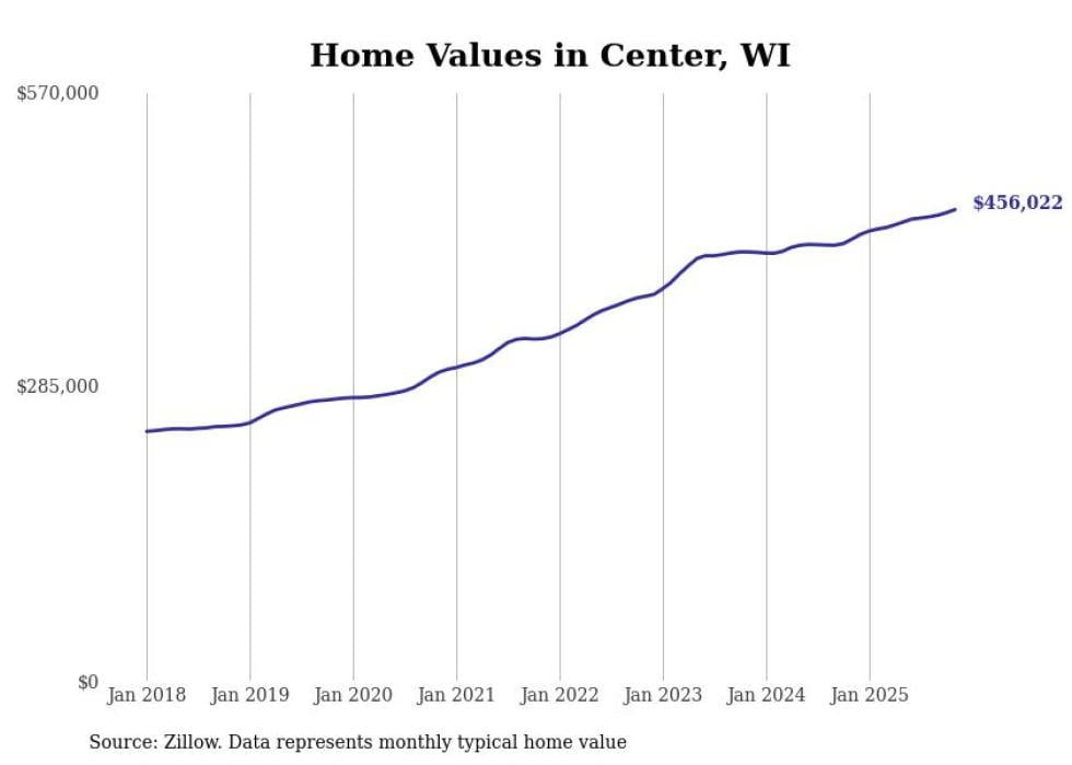 Stacker compiled a list of cities with the fastest-growing home prices in Wisconsin using data from Zillow. Cities are ranked by the dollar change in the Zillow Home Values Index for all homes from the 12 months ending November 2025. The charts in this story were created automatically using Matplotlib. Data was available for 50 cities and towns in Wisconsin.