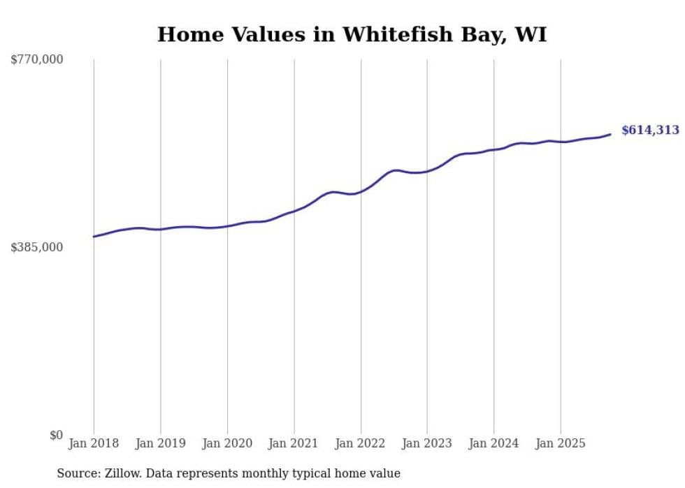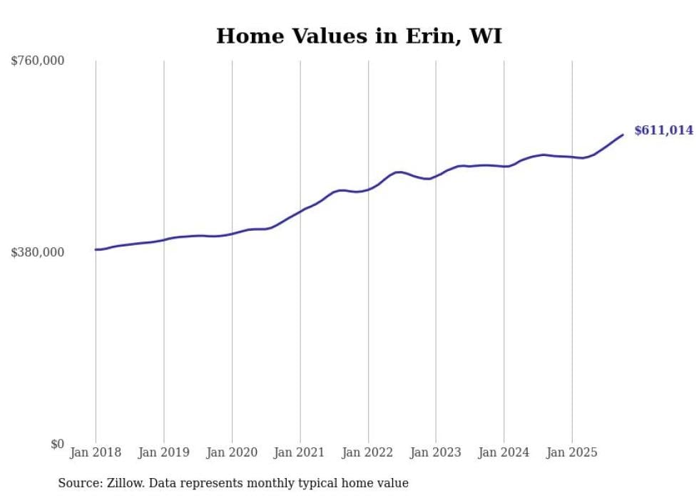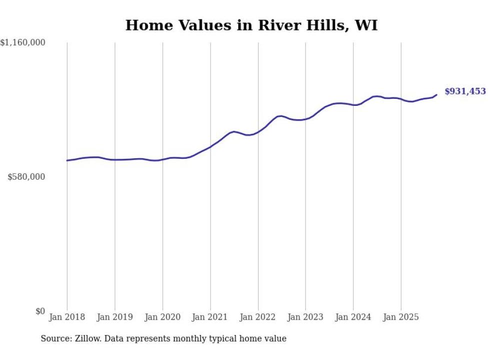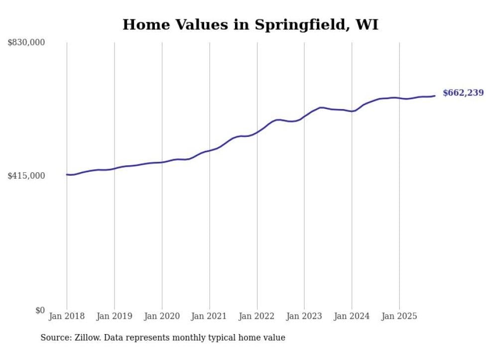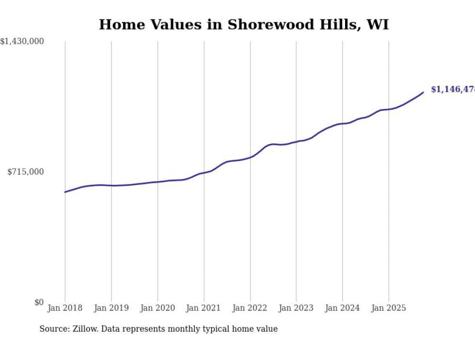 Stacker compiled a list of cities with the most expensive homes in Wisconsin using data from Zillow. Cities are ranked by the Zillow Home Values Index for all homes as of October 2025. The charts in this story were created automatically using Matplotlib.