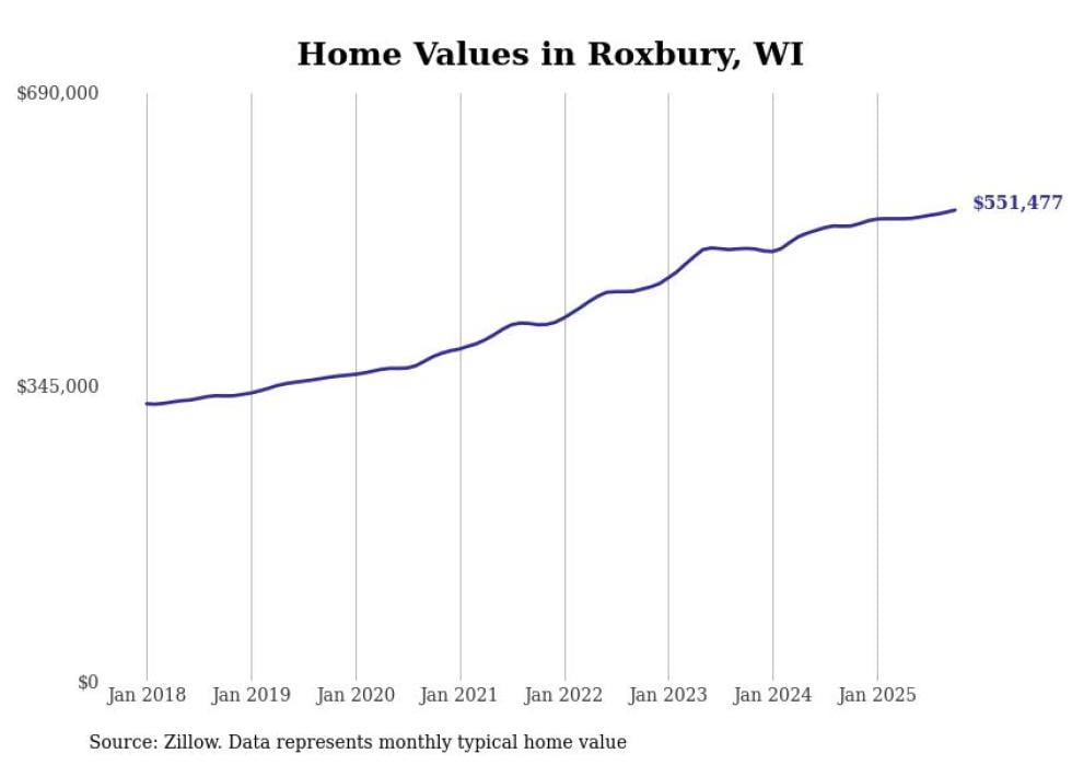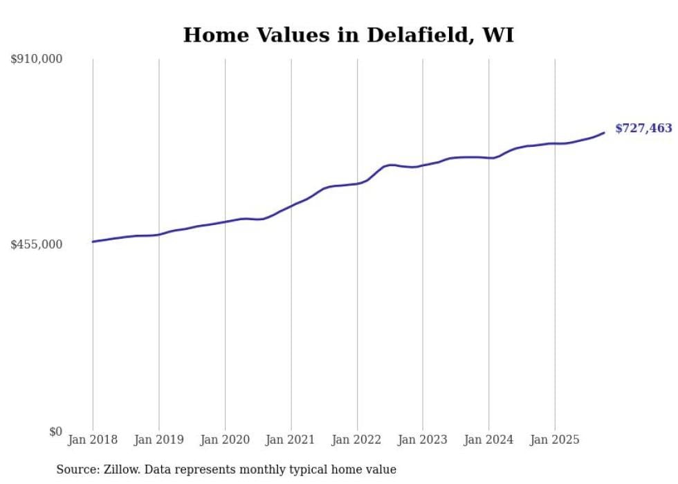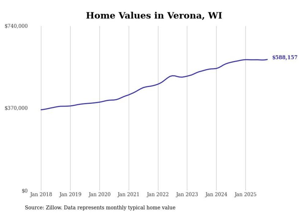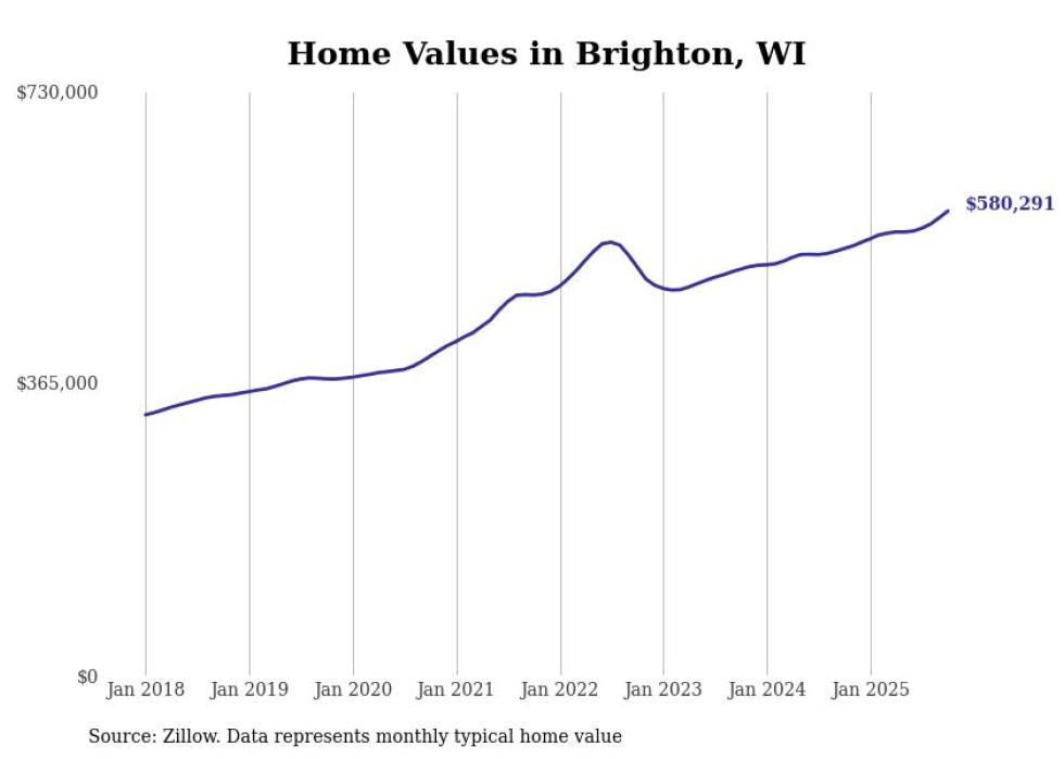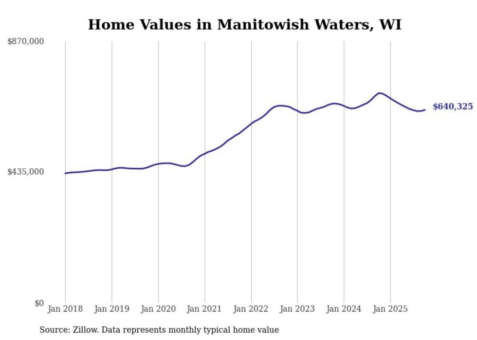 Stacker compiled a list of cities with the most expensive homes in Wisconsin using data from Zillow. Cities are ranked by the Zillow Home Values Index for all homes as of October 2025. The charts in this story were created automatically using Matplotlib.