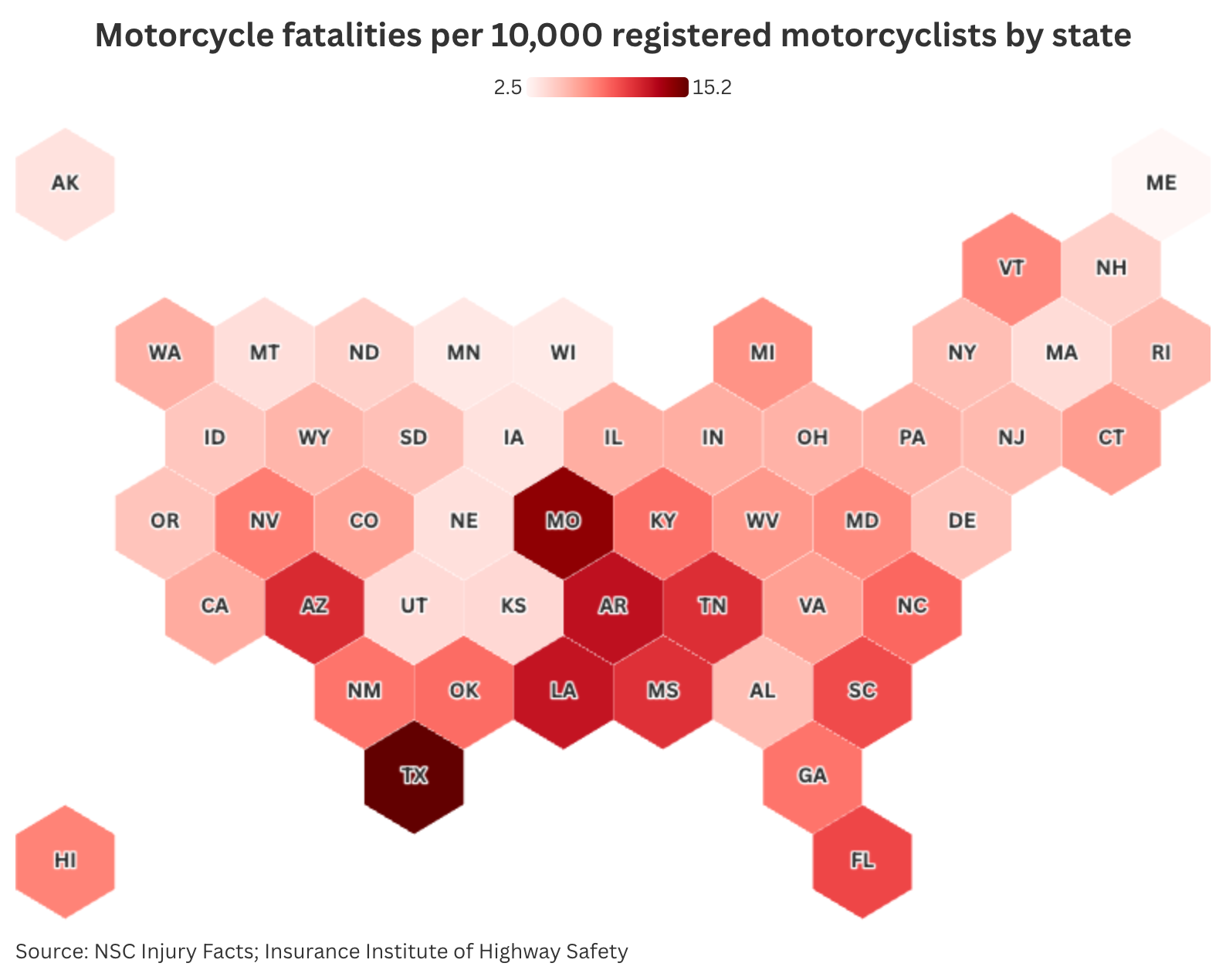 Top 5 most dangerous states based on motorcycle fatalities per 10,000 registered motorcyclists