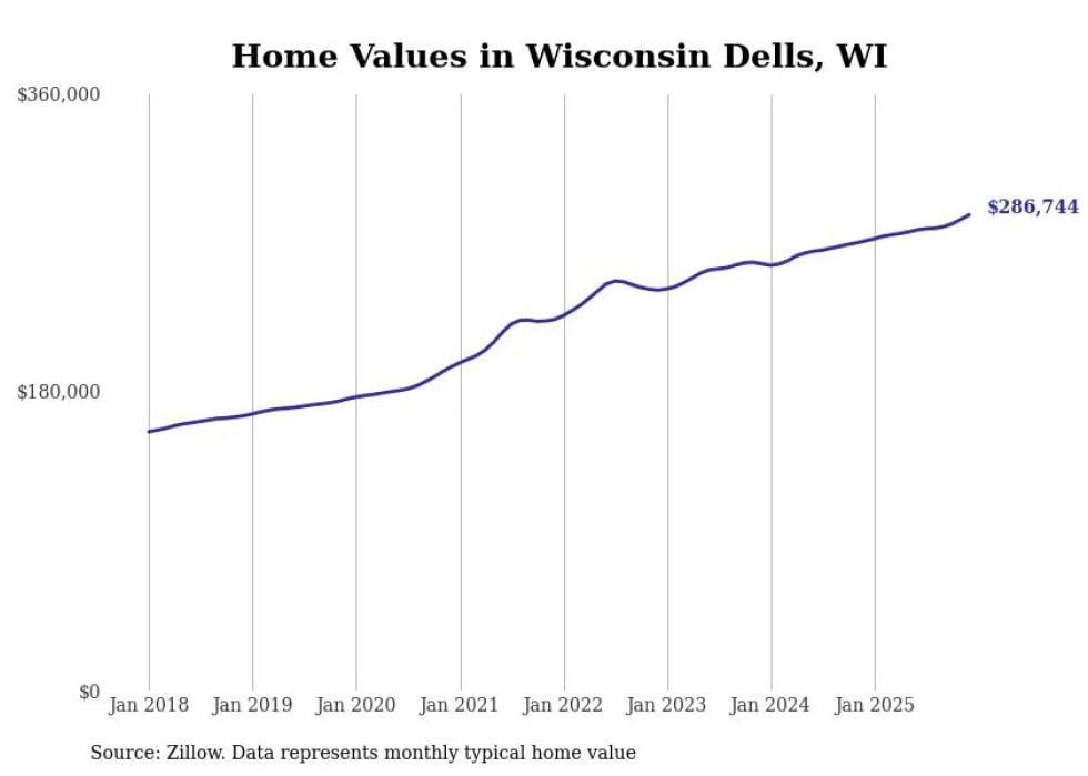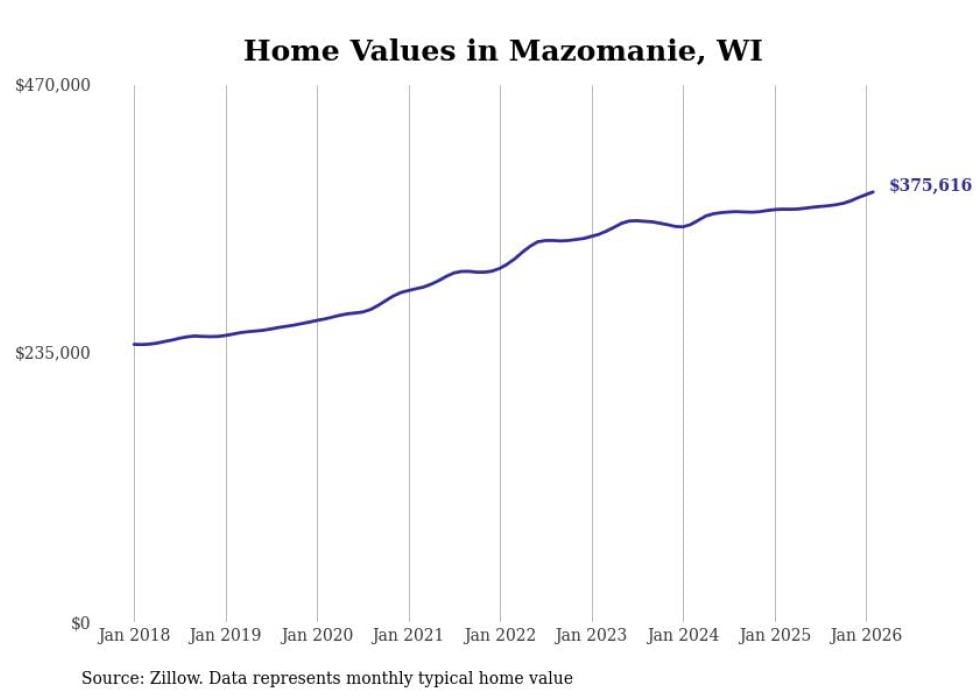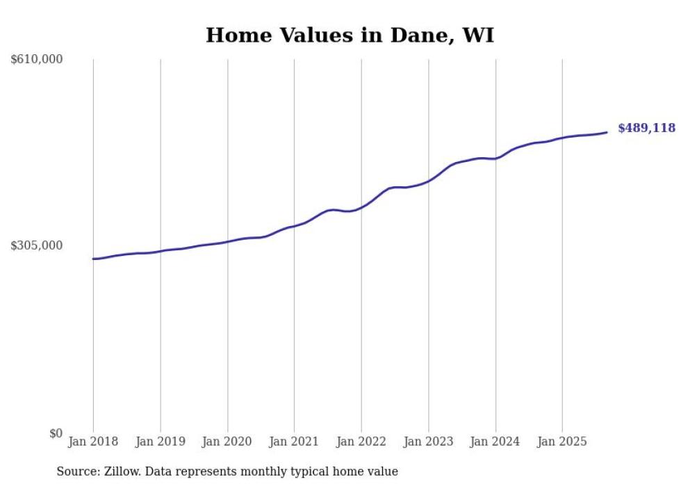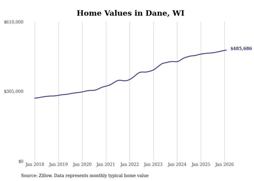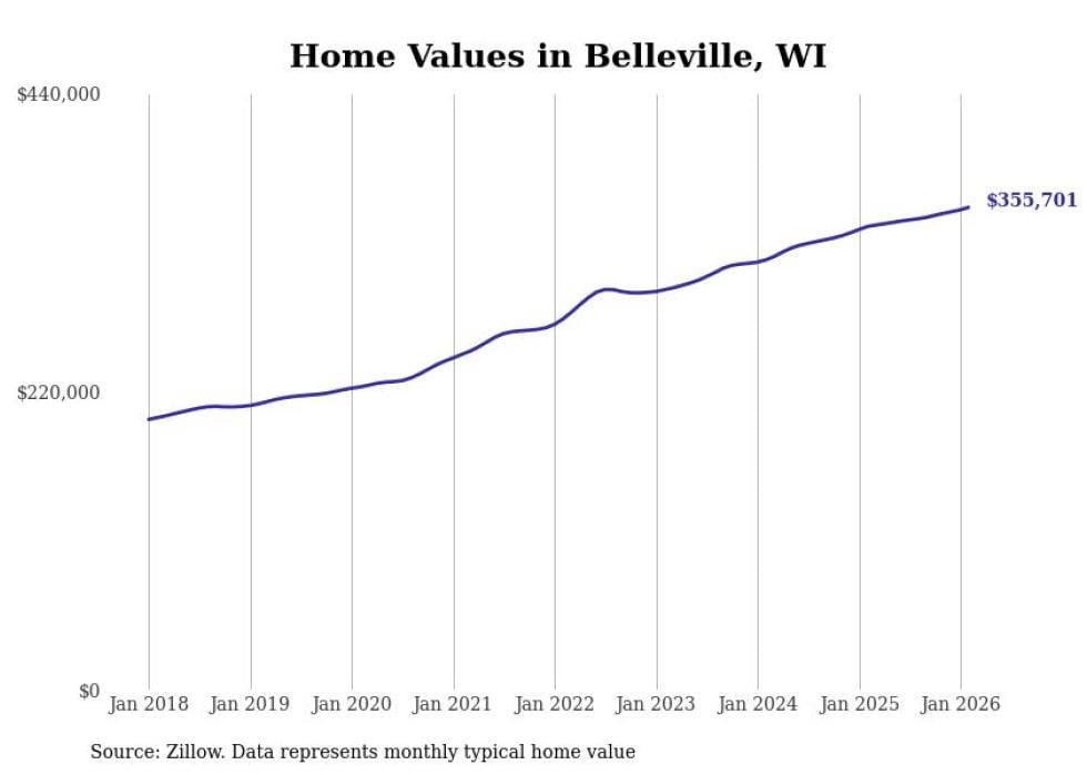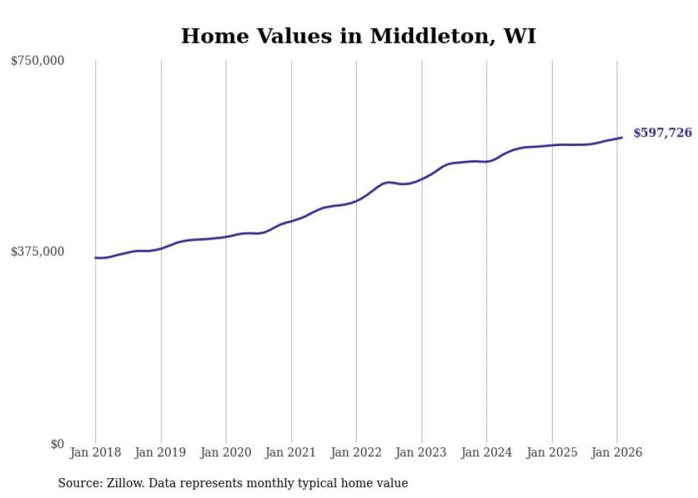 Stacker compiled a list of cities with the most expensive homes in the Madison, WI metro area using data from Zillow. Charts show the monthly typical home value since January 2018.