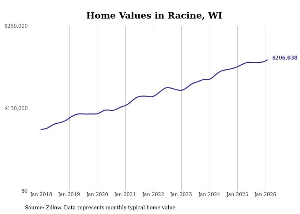 Stacker compiled a list of cities with the most expensive homes in the Racine, WI metro area using data from Zillow. Charts show the monthly typical home value since January 2018.