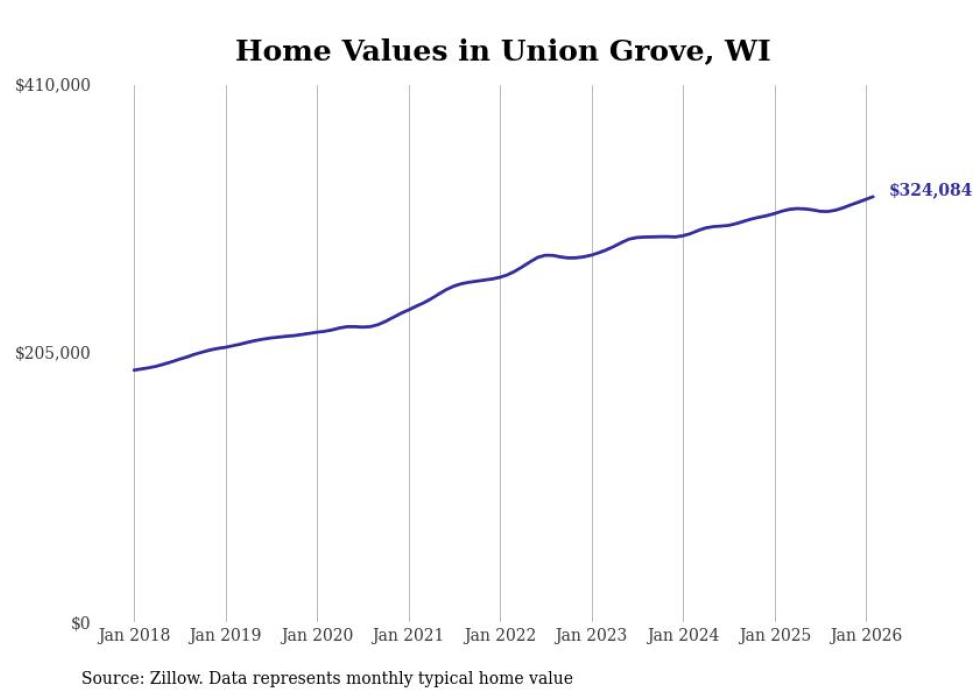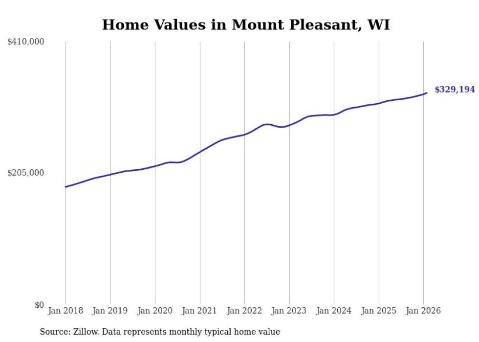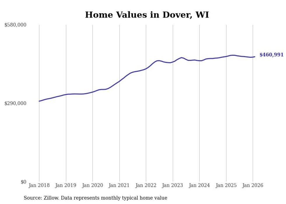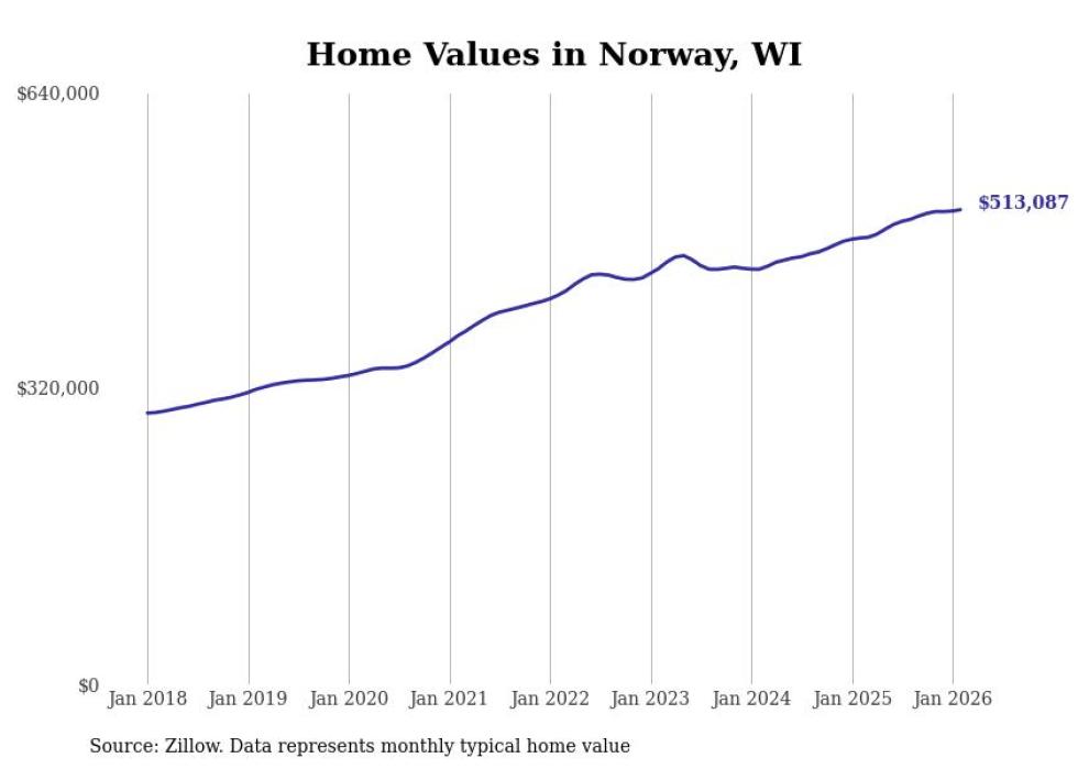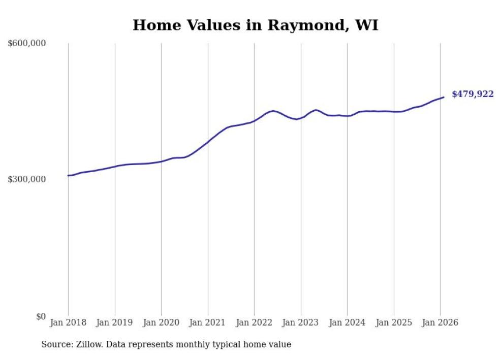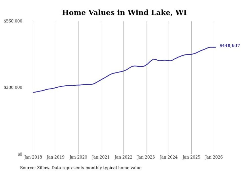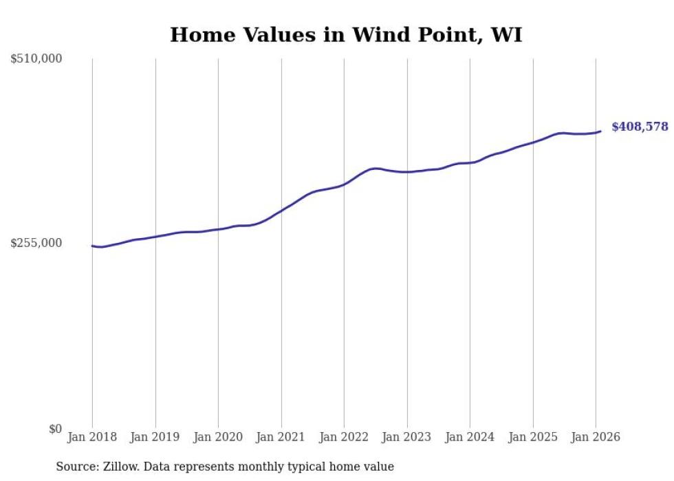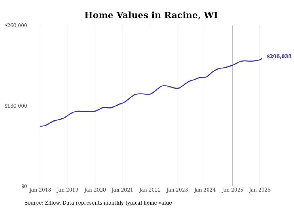 Stacker compiled a list of cities with the most expensive homes in the Racine metro area using data from Zillow. Charts show the monthly typical home value since January 2018. All 15 cities and towns with data available were included in the list.