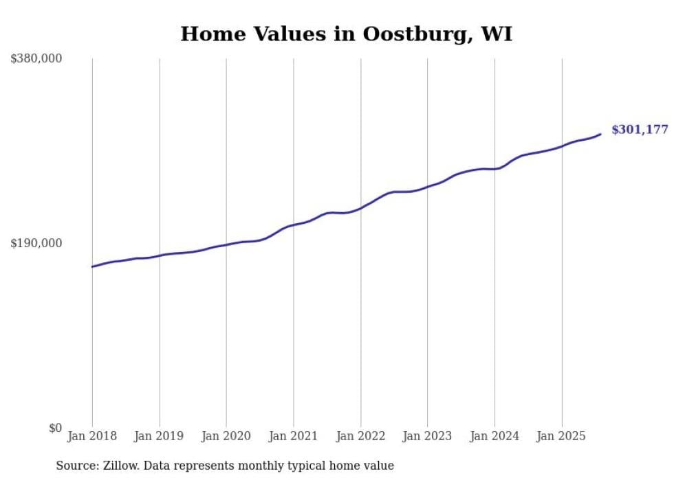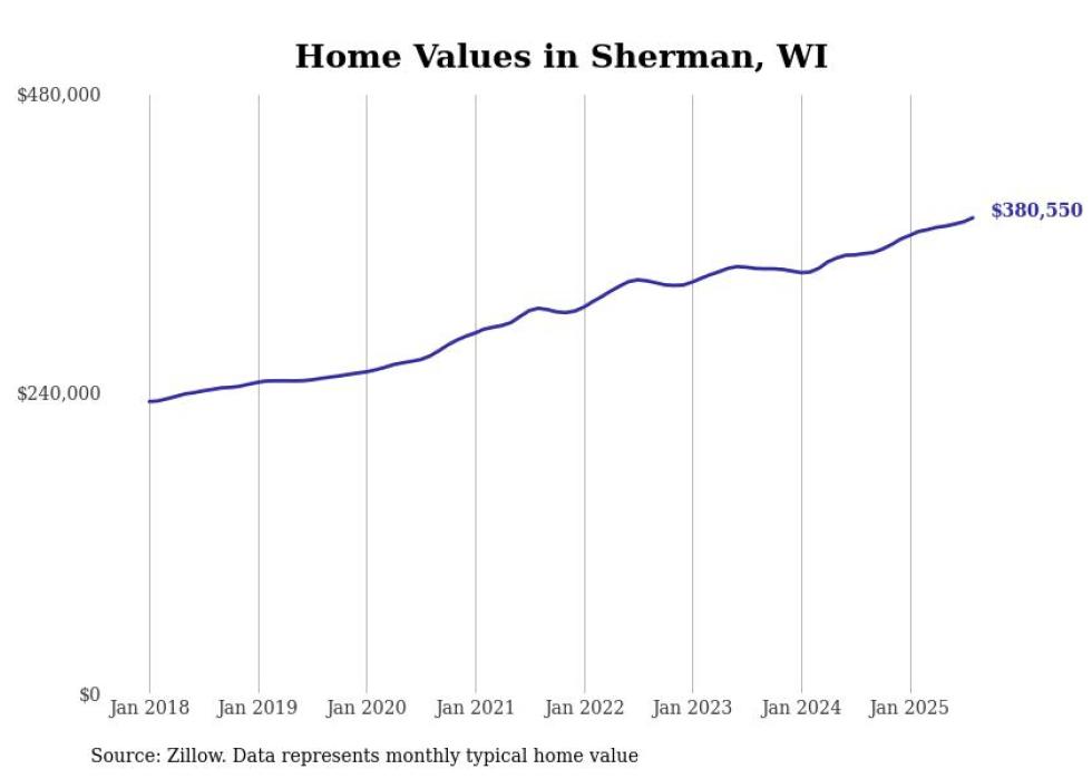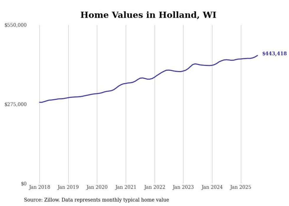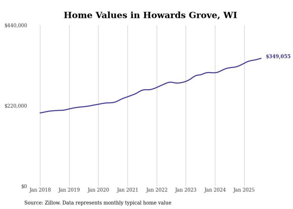 Stacker compiled a list of cities with the most expensive homes in the Sheboygan metro area using data from Zillow. Charts show the monthly typical home value since January 2018. All 18 cities and towns with data available were included in the list.