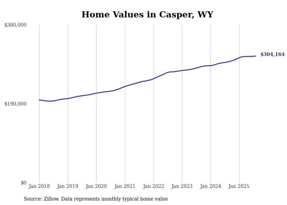 Stacker compiled a list of cities with the most expensive homes in the Casper, WY metro area using data from Zillow. Charts show the monthly typical home value since January 2018.