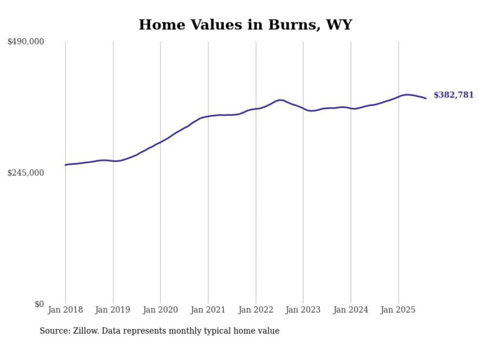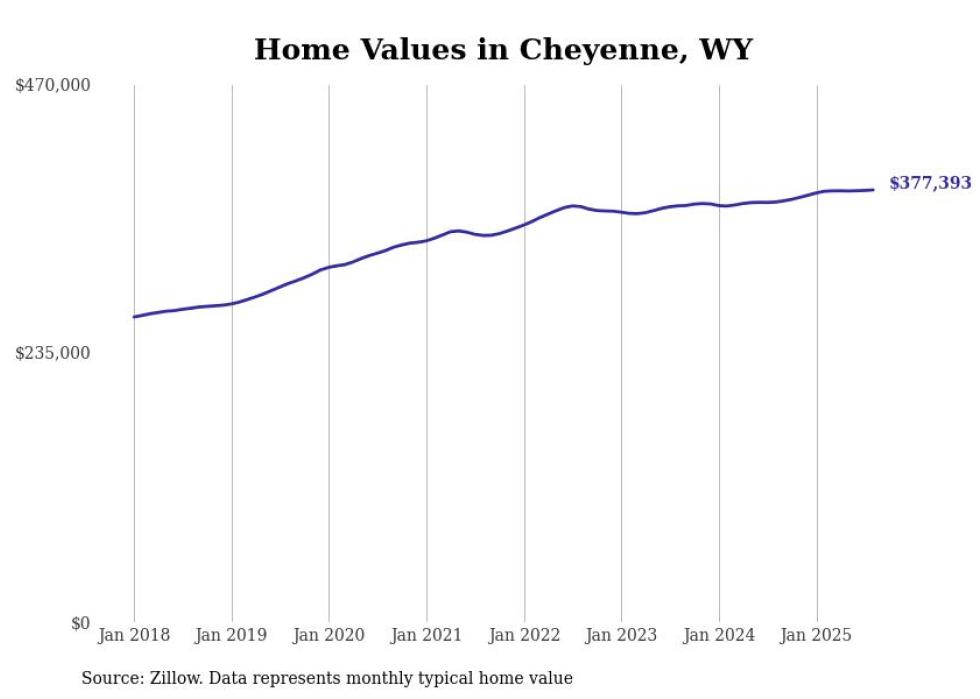 Stacker compiled a list of cities with the most expensive homes in the Cheyenne metro area using data from Zillow. Charts show the monthly typical home value since January 2018. All 4 cities and towns with data available were included in the list.