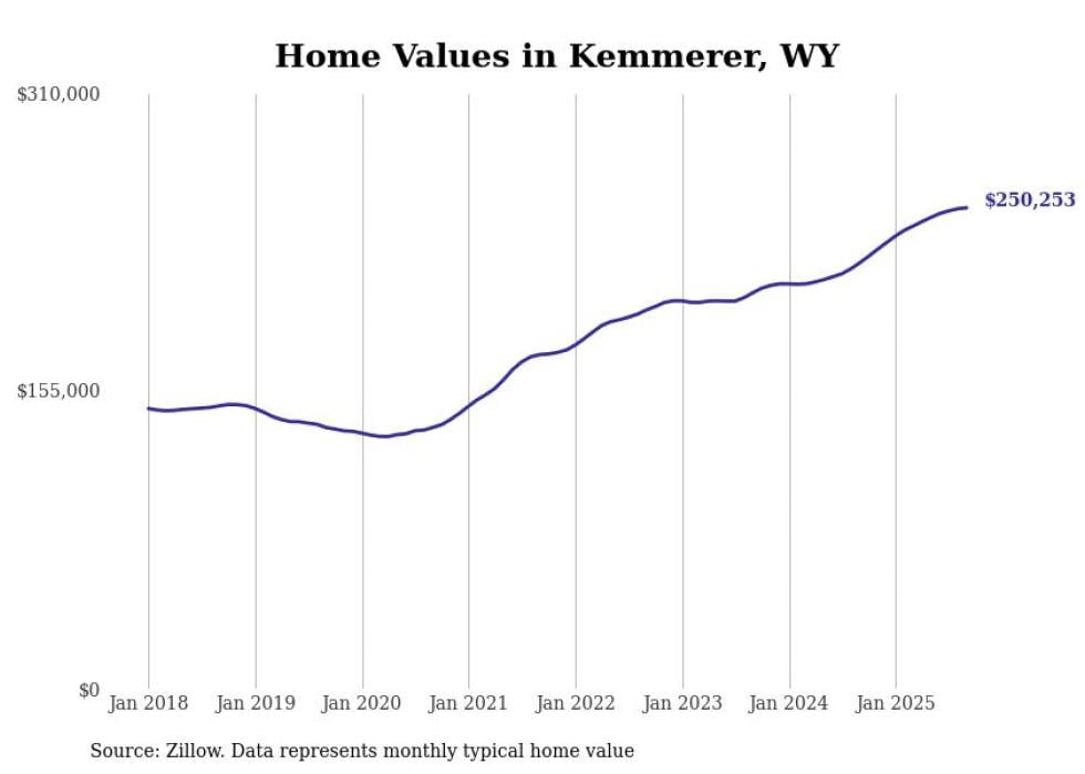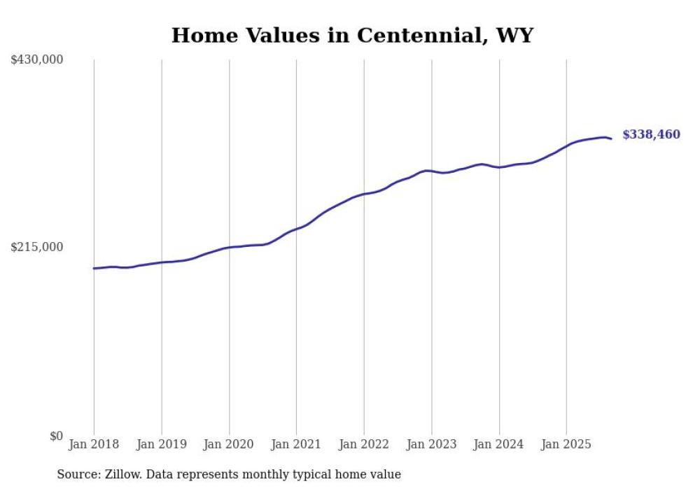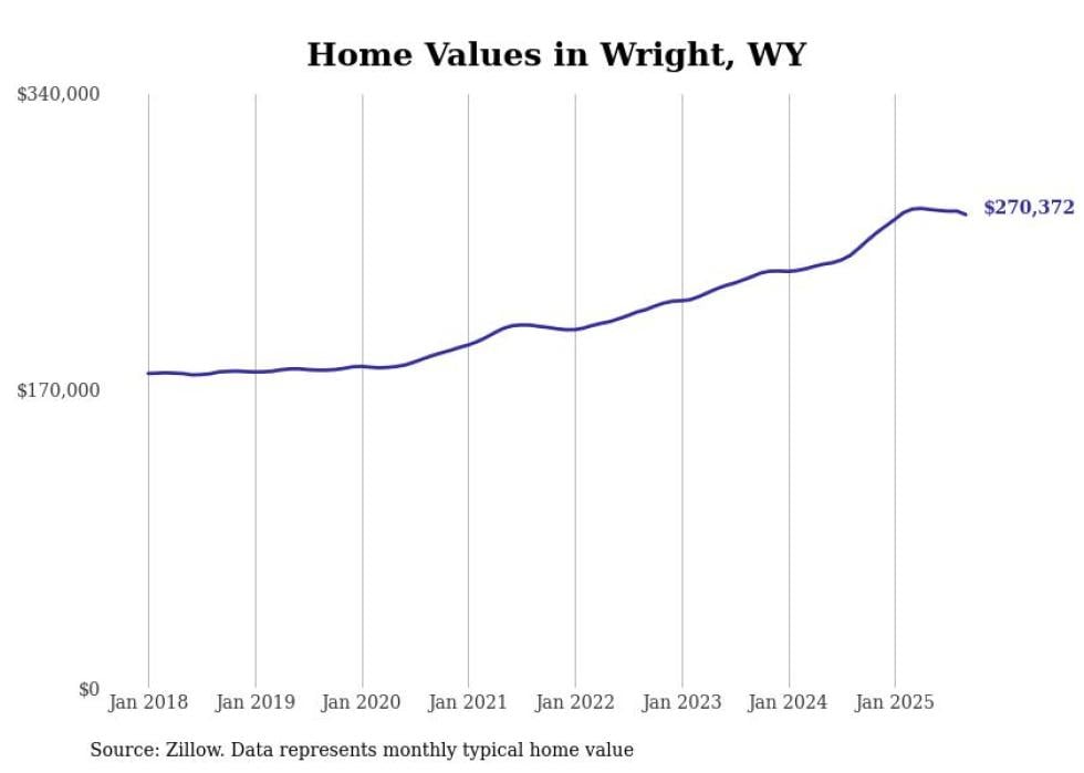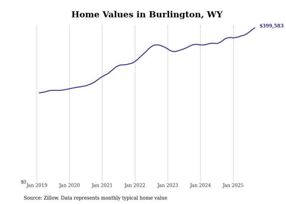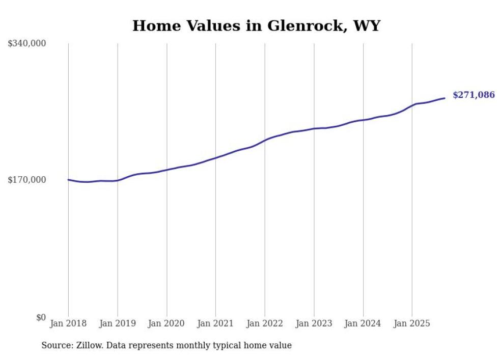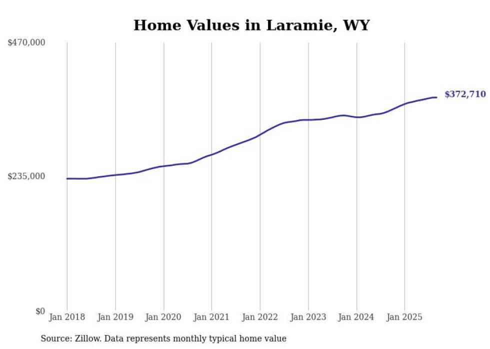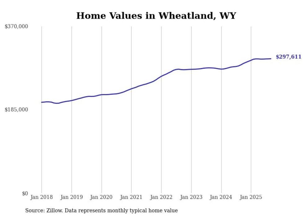 Stacker compiled a list of cities with the fastest-growing home prices in Wyoming using data from Zillow. Cities are ranked by the dollar change in the Zillow Home Values Index for all homes from the 12 months ending September 2025. The charts in this story were created automatically using Matplotlib. Data was available for 50 cities and towns in Wyoming.