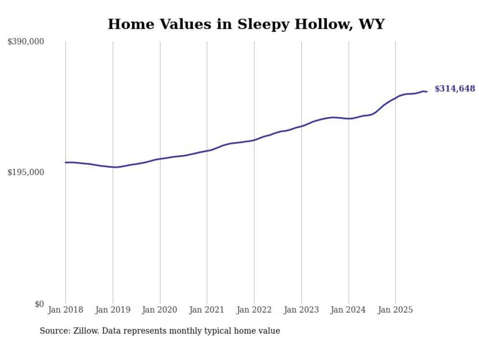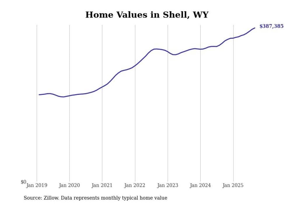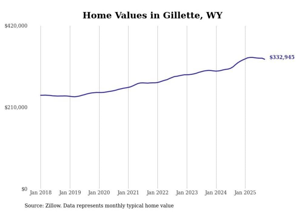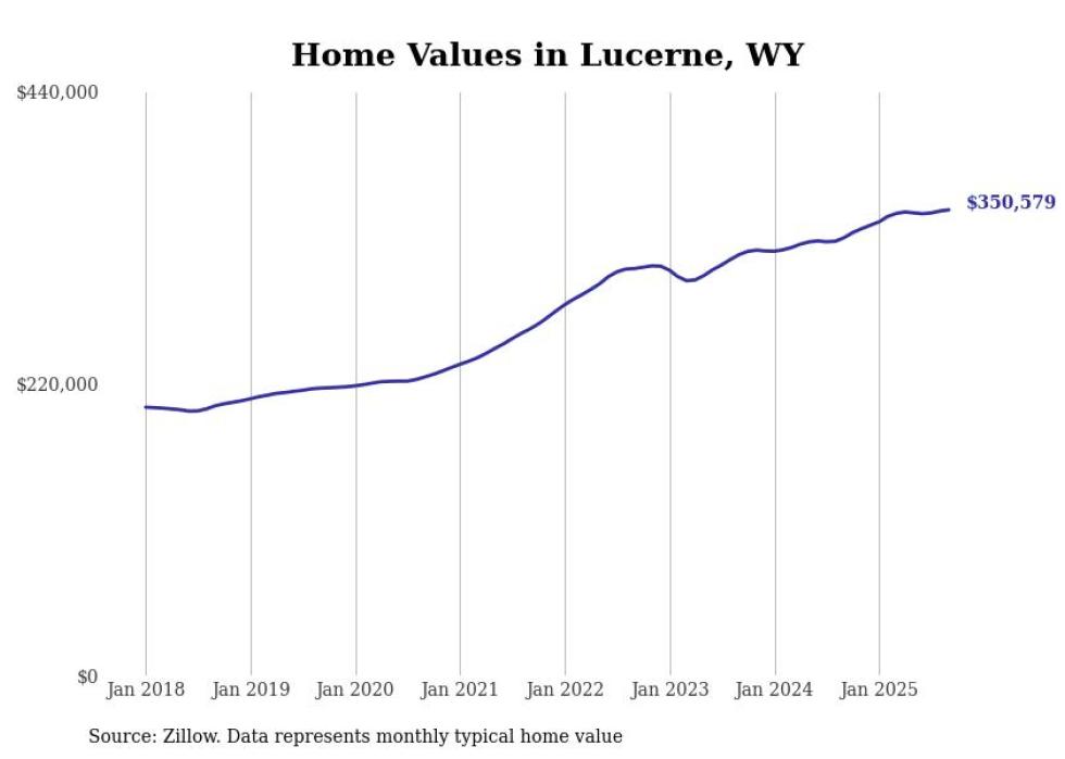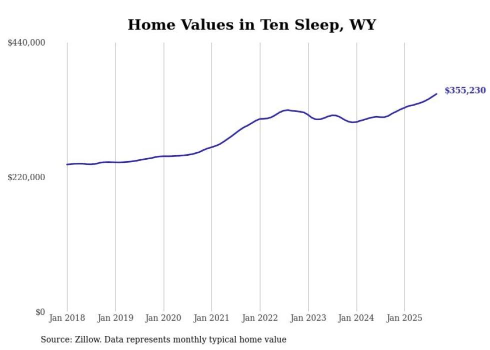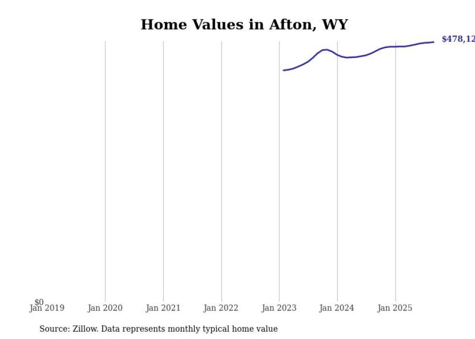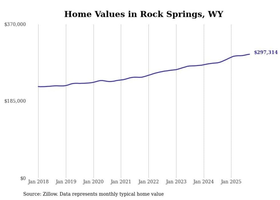 Stacker compiled a list of cities with the fastest-growing home prices in Wyoming using data from Zillow. Cities are ranked by the dollar change in the Zillow Home Values Index for all homes from the 12 months ending September 2025. The charts in this story were created automatically using Matplotlib. Data was available for 50 cities and towns in Wyoming.