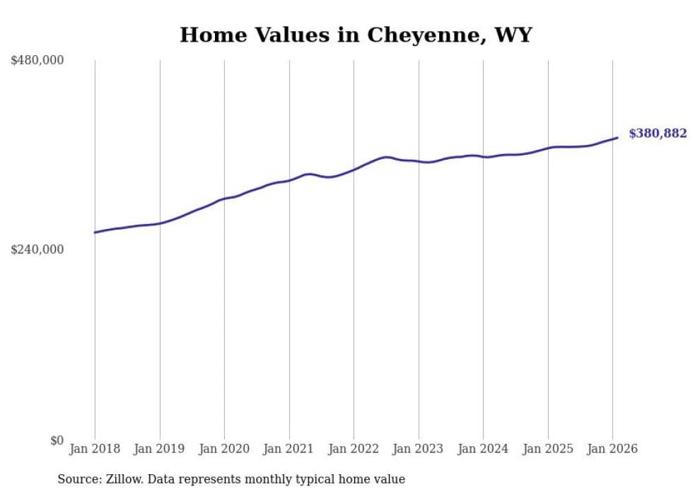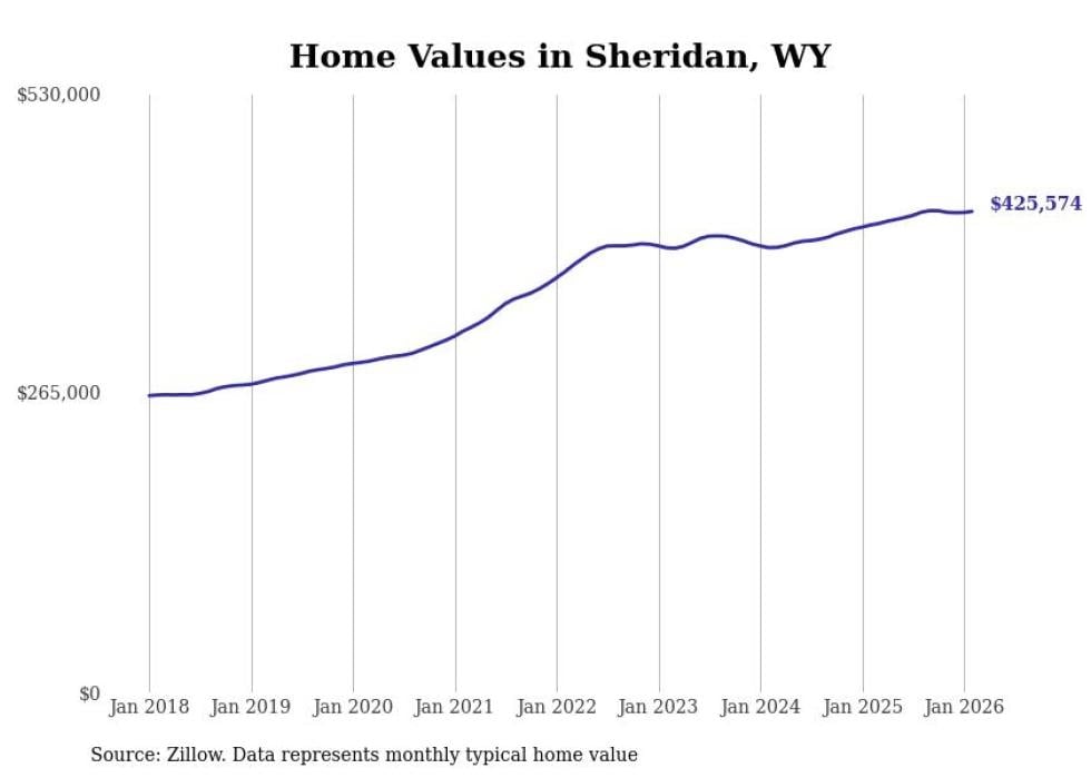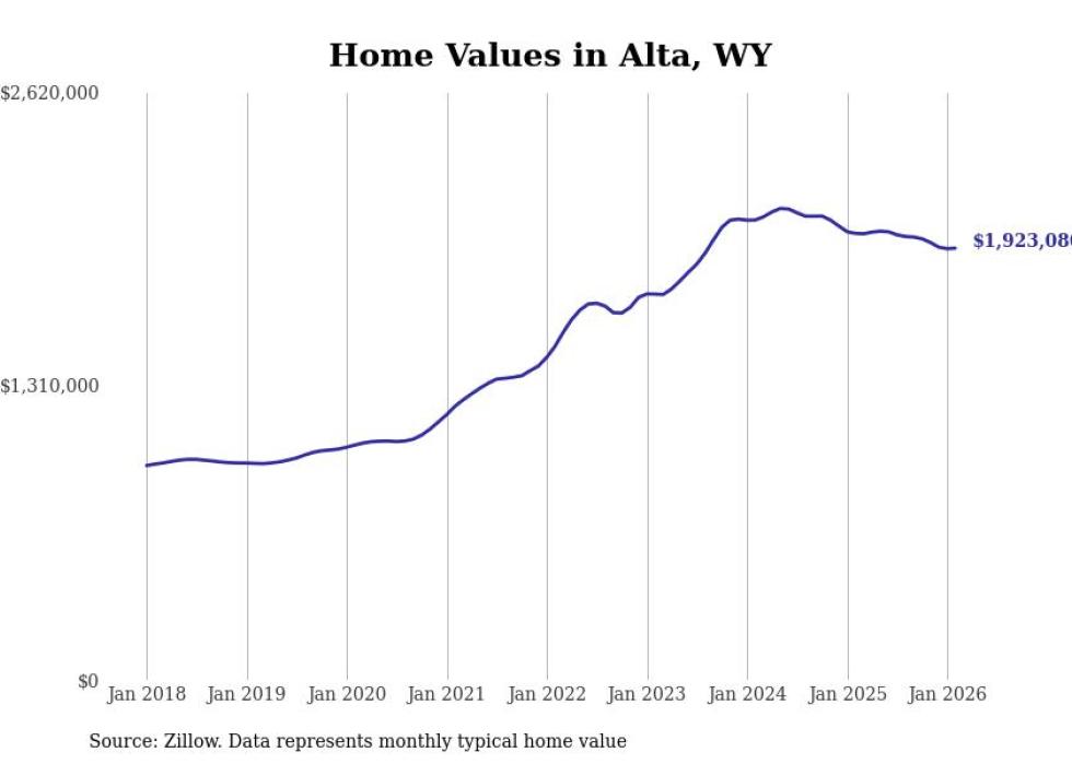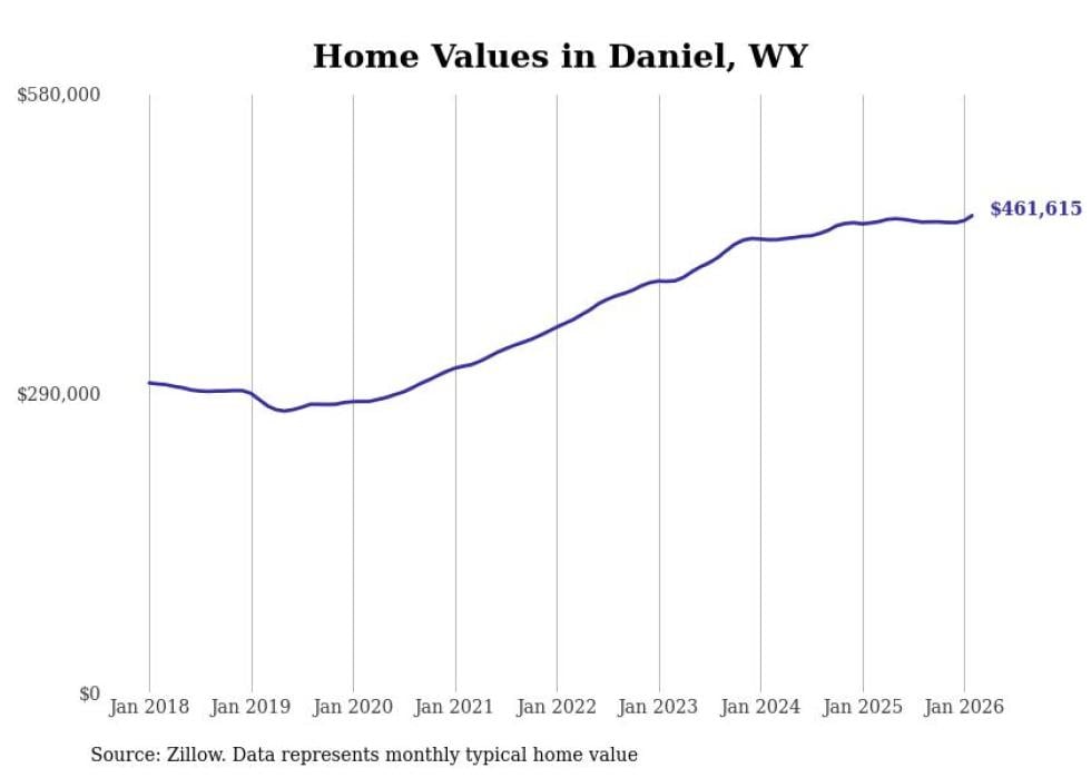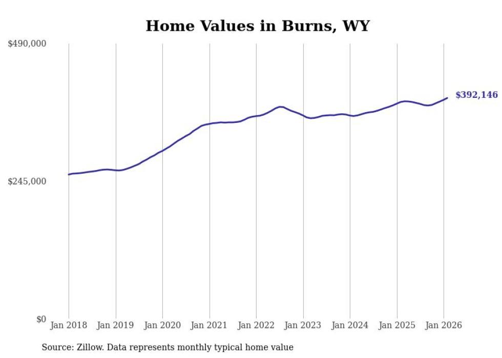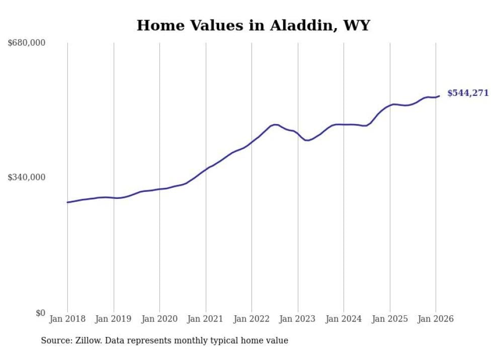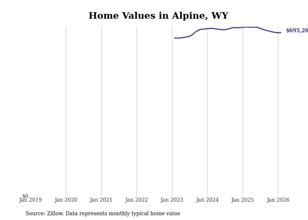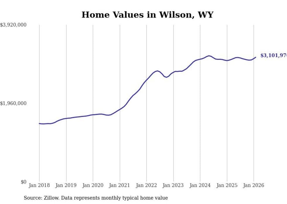 Stacker compiled a list of cities with the most expensive homes in Wyoming using data from Zillow. Cities are ranked by the Zillow Home Values Index for all homes as of February 2026. The charts in this story were created automatically using Matplotlib.