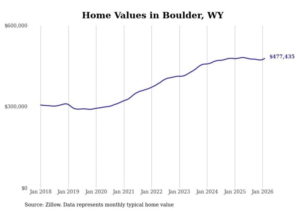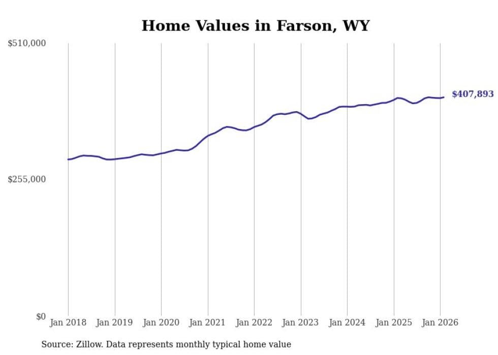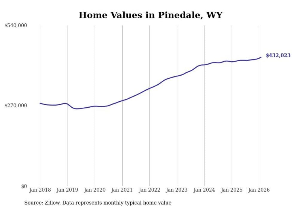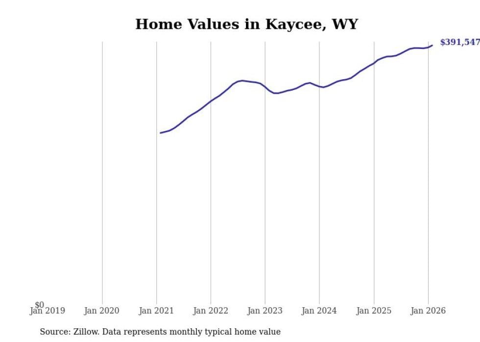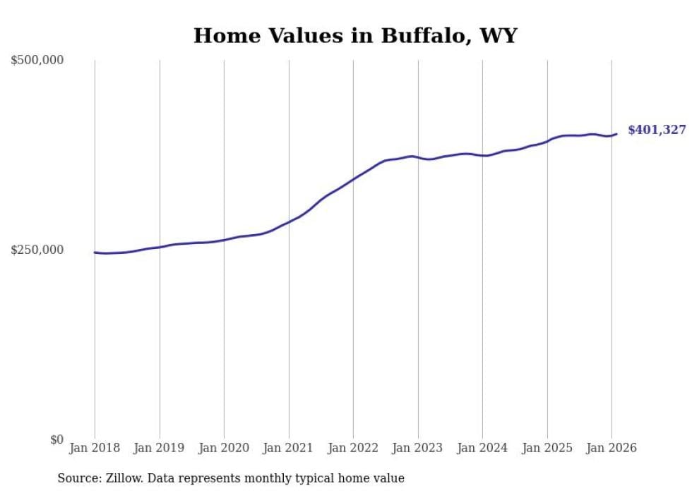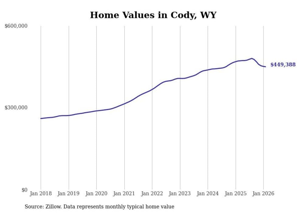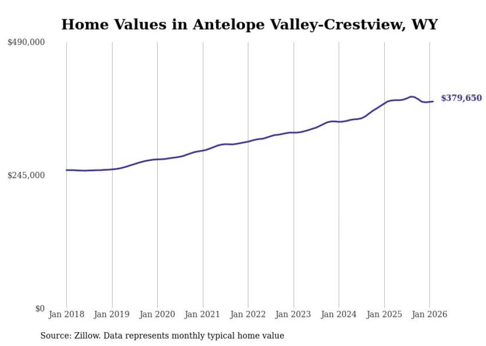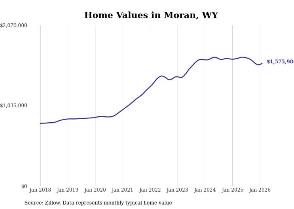 Stacker compiled a list of cities with the most expensive homes in Wyoming using data from Zillow. Cities are ranked by the Zillow Home Values Index for all homes as of February 2026. The charts in this story were created automatically using Matplotlib.