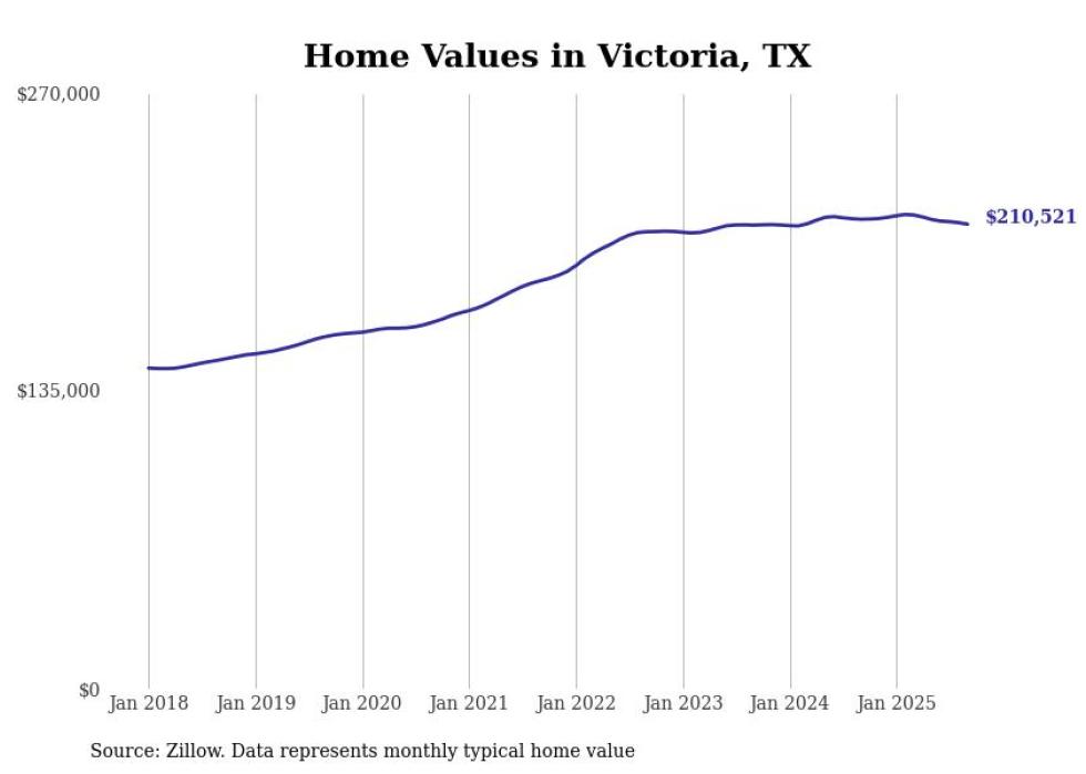 Stacker compiled a list of cities with the most expensive homes in the Victoria, TX metro area using data from Zillow. Charts show the monthly typical home value since January 2018.