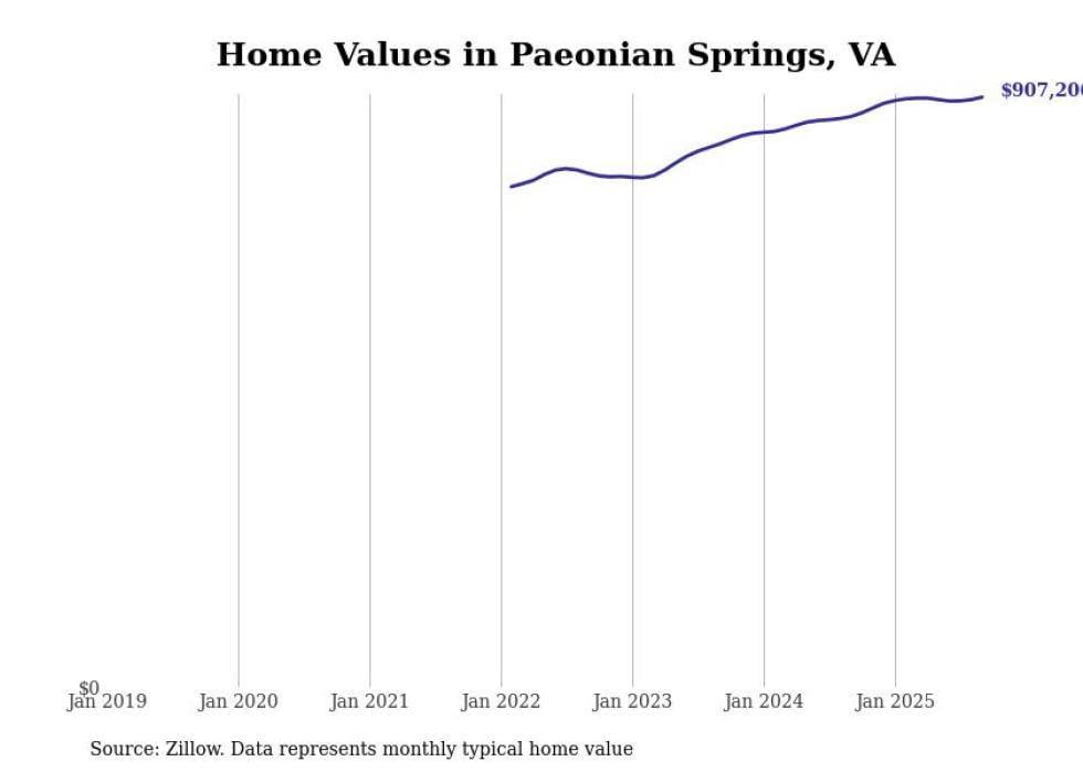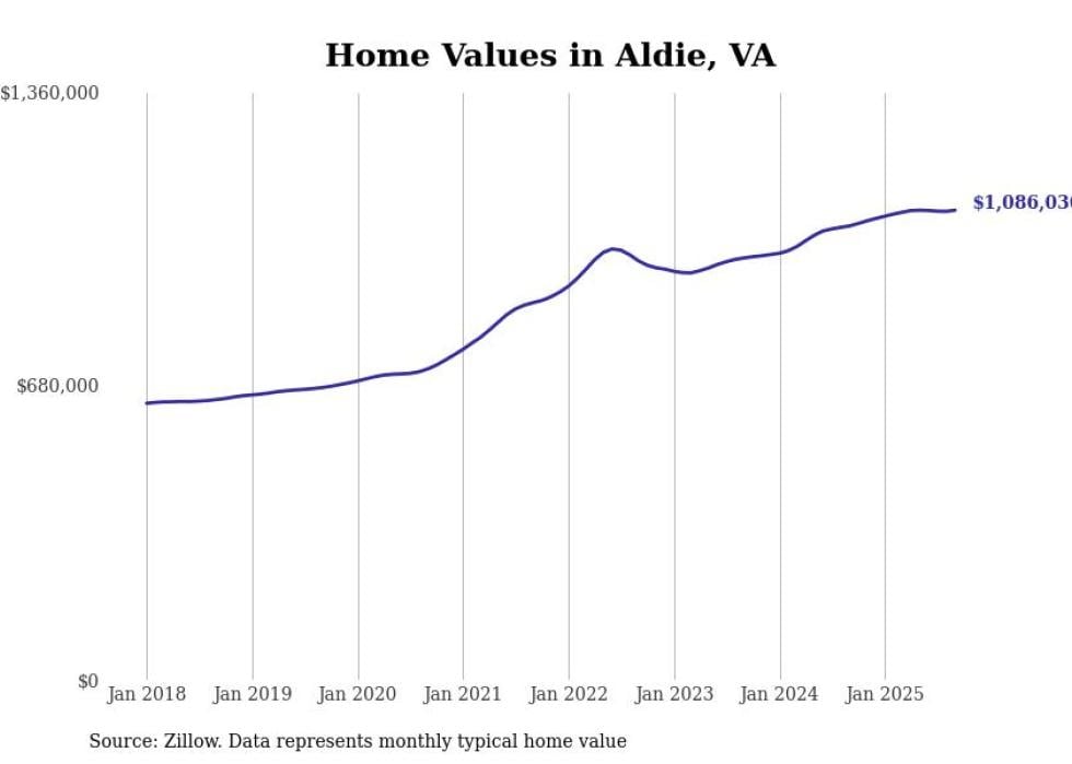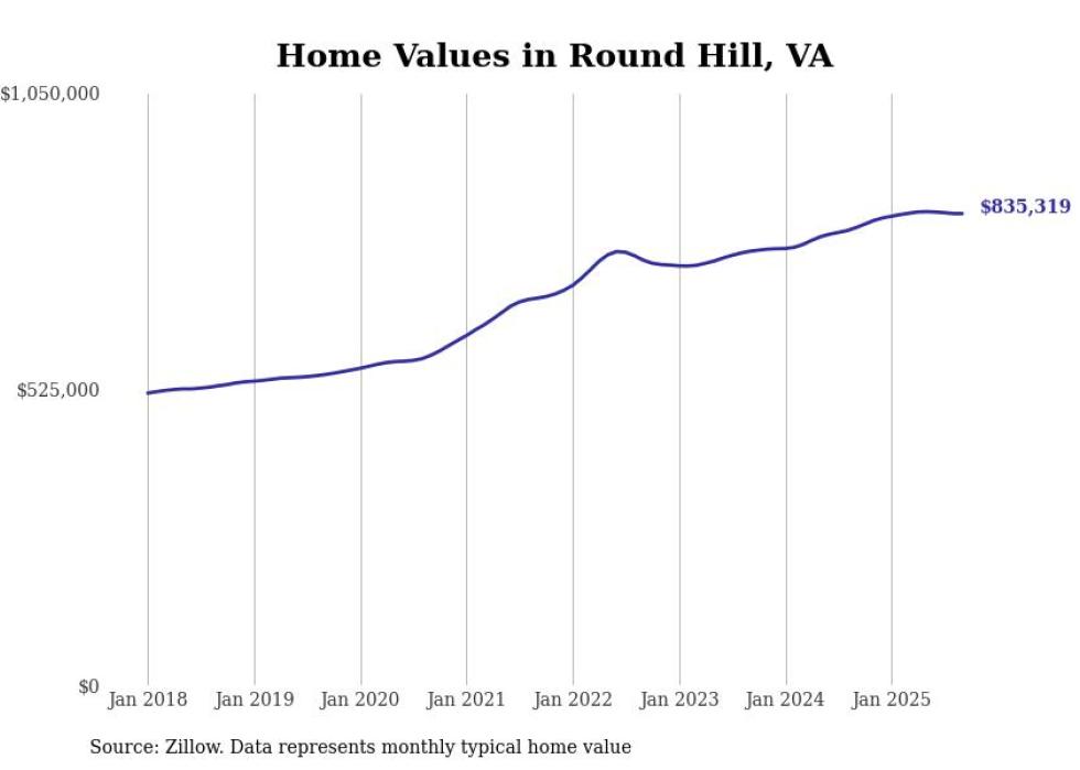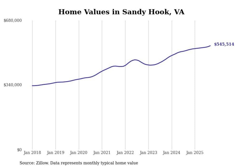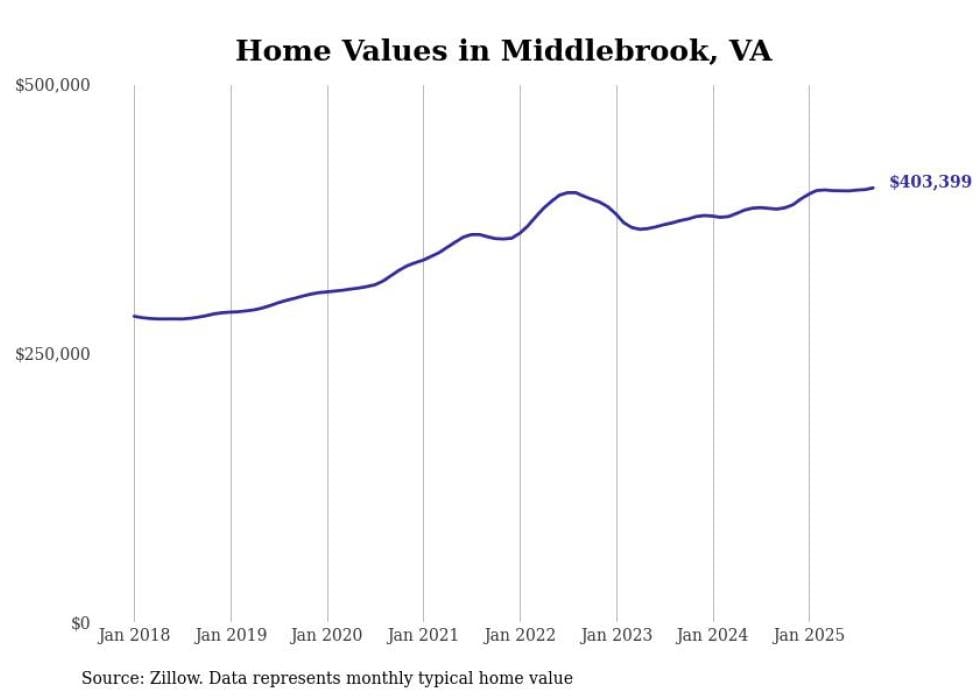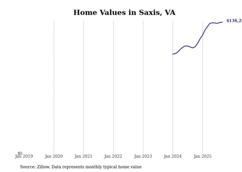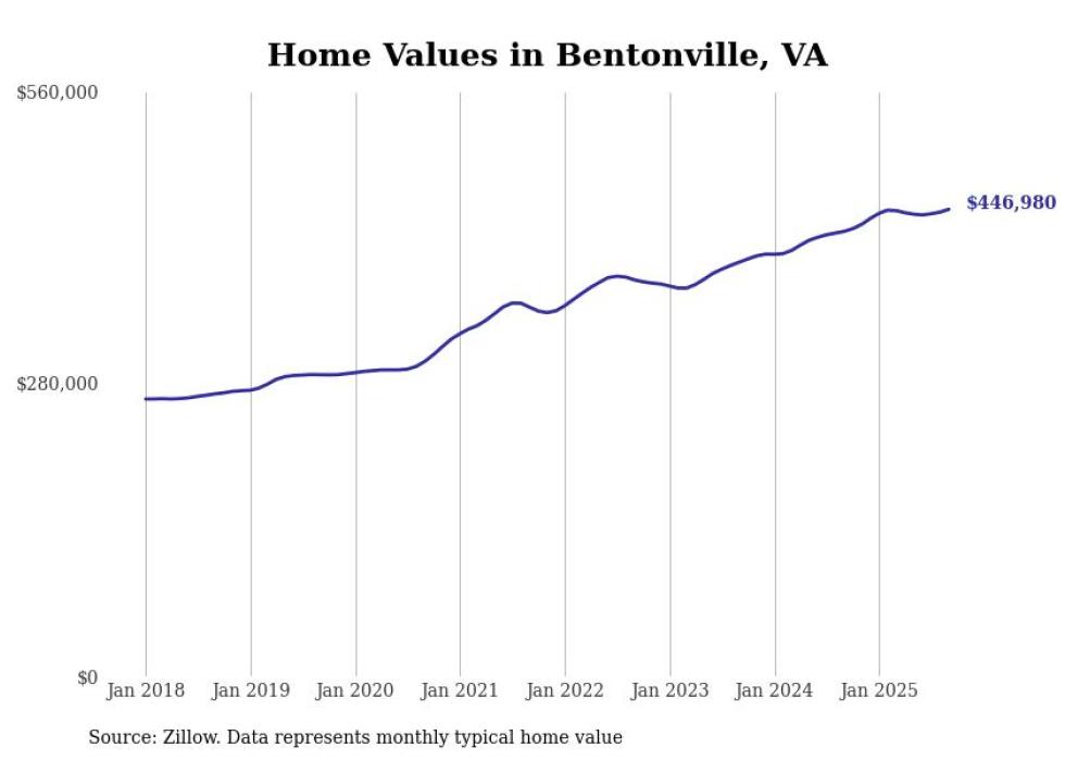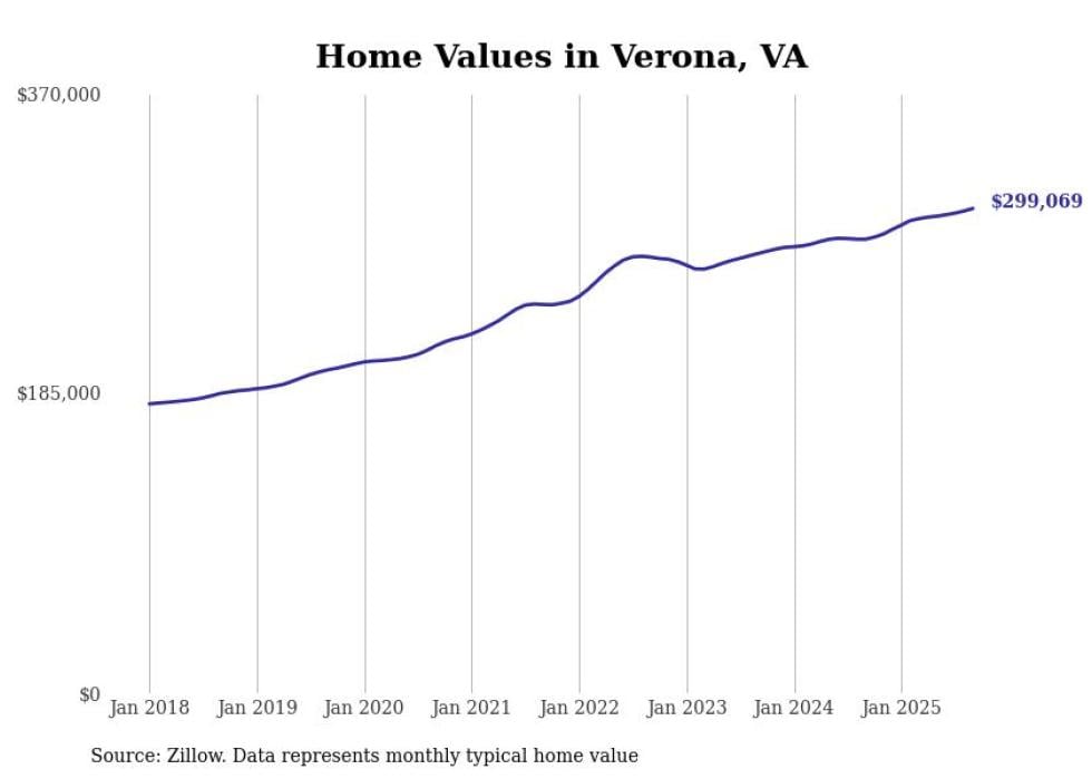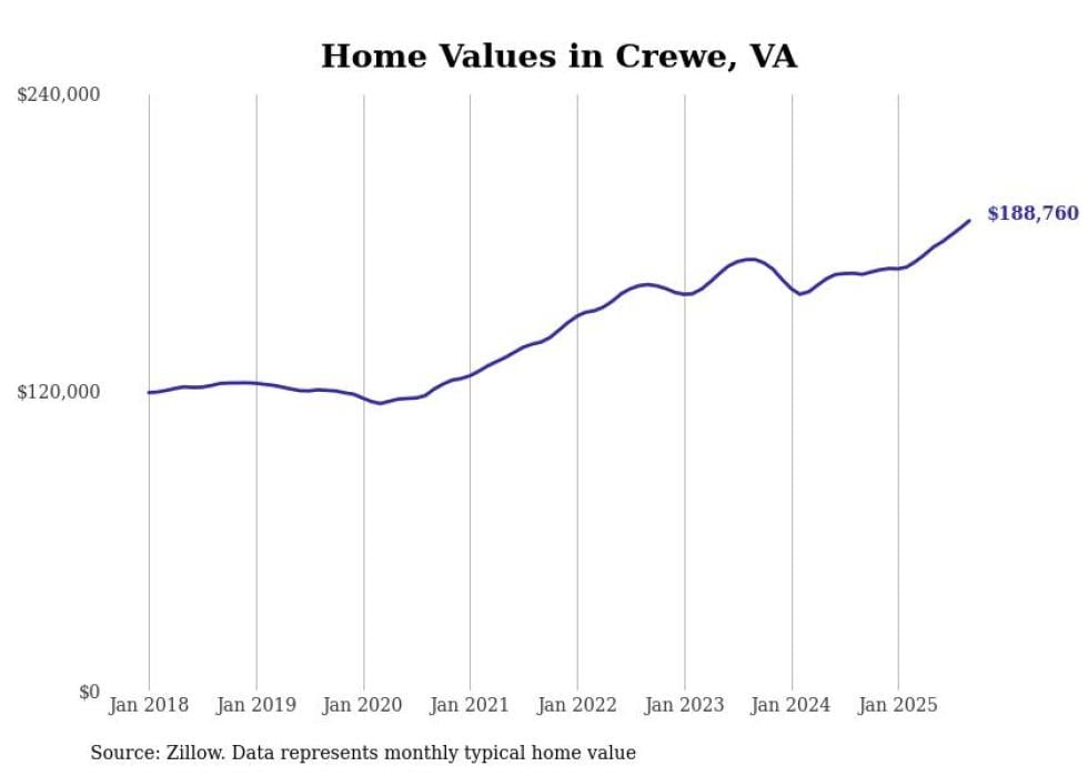 Stacker compiled a list of cities with the fastest-growing home prices in Virginia using data from Zillow. Cities are ranked by the dollar change in the Zillow Home Values Index for all homes from the 12 months ending September 2025. The charts in this story were created automatically using Matplotlib. Data was available for 50 cities and towns in Virginia.